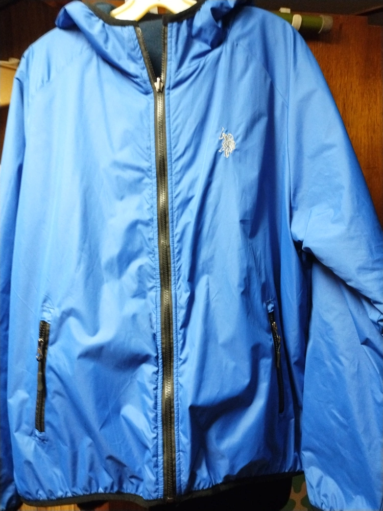 Blue jacket with a fleece lining. Has a hood. Two zippered pockets. Size Large. Unisex