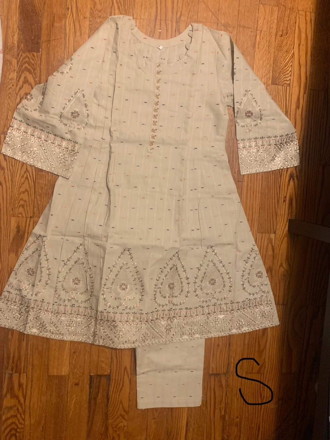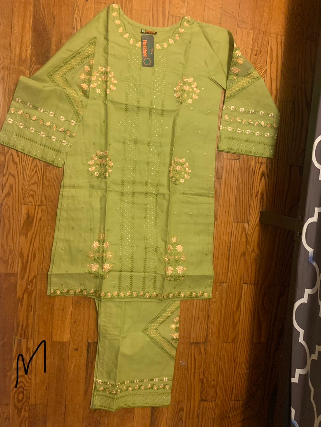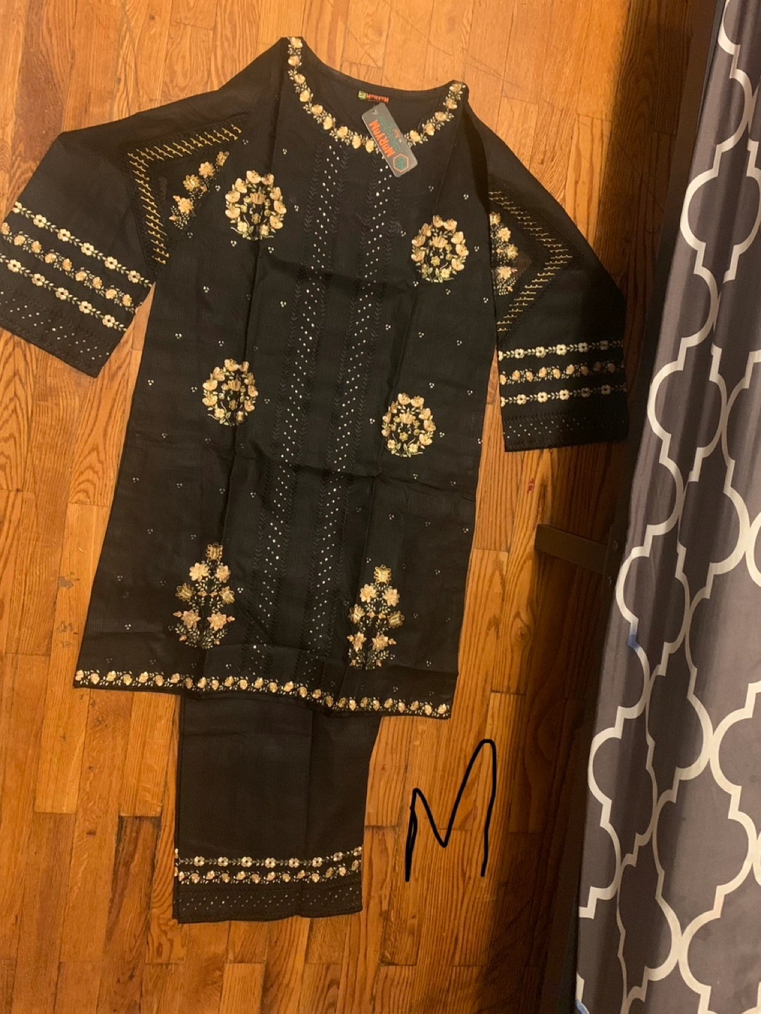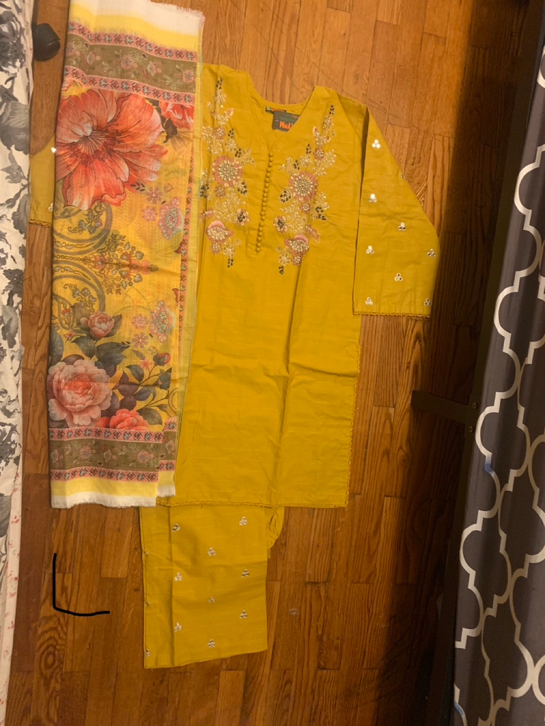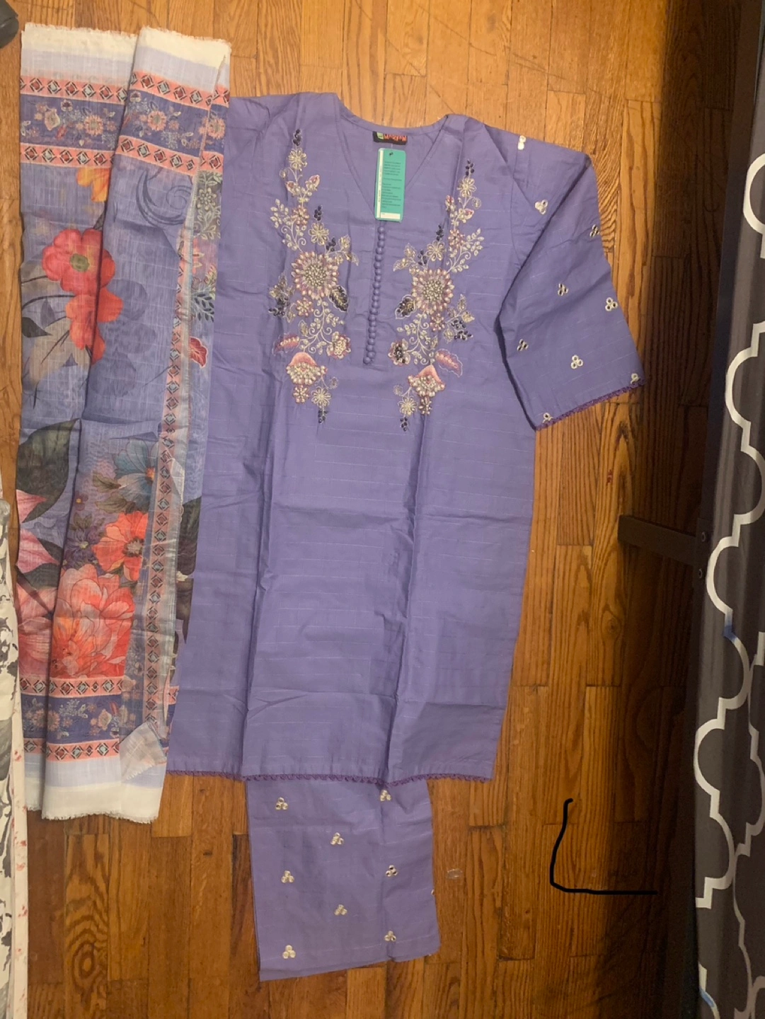 Three piece suit with embroidery, includes top, pants, and dupatta.