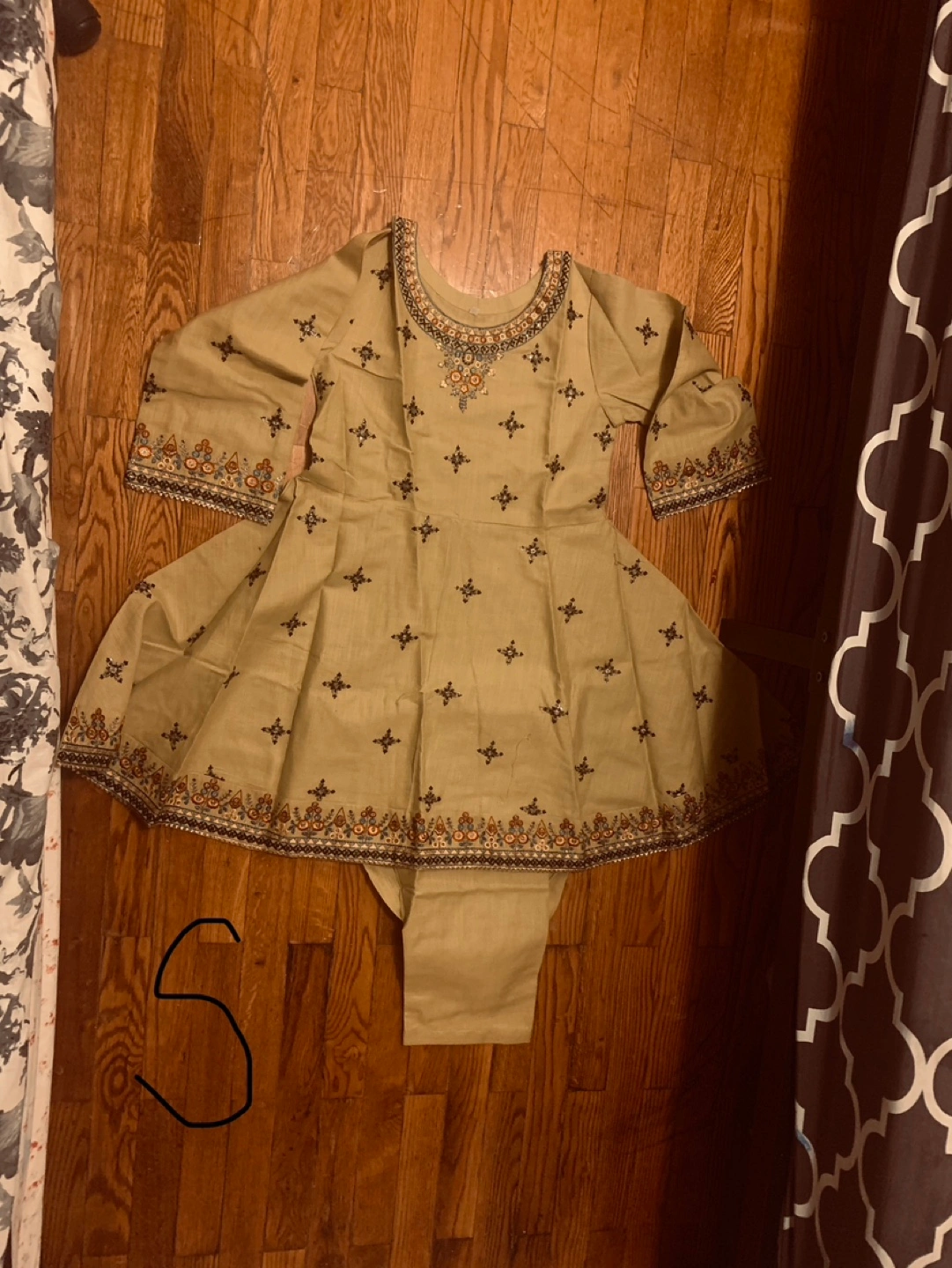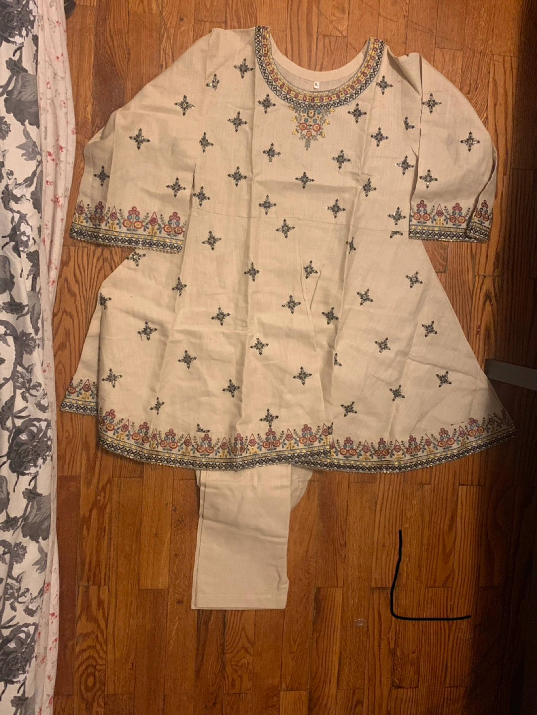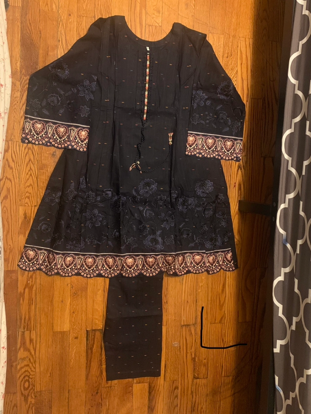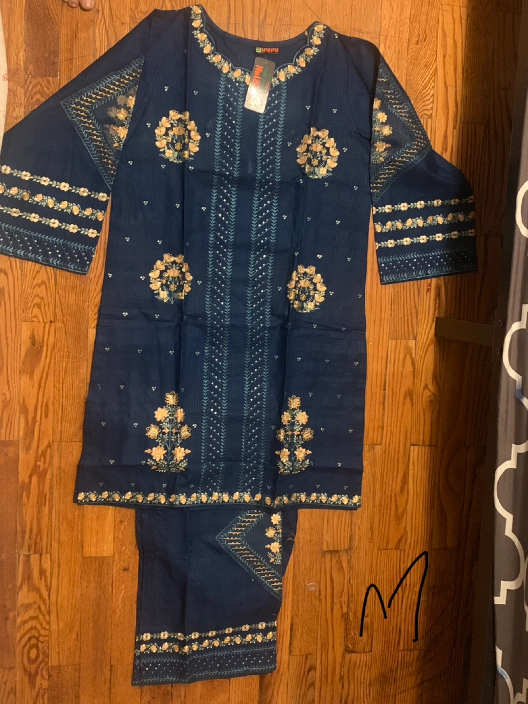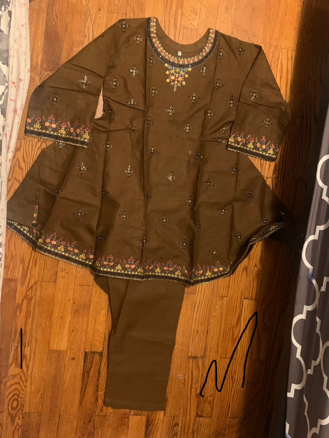 Three piece suit with embroidery, includes top, pants, and dupatta.