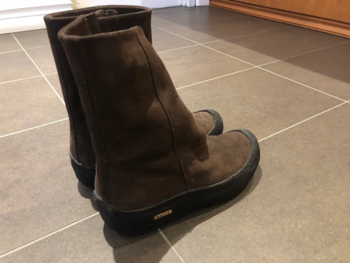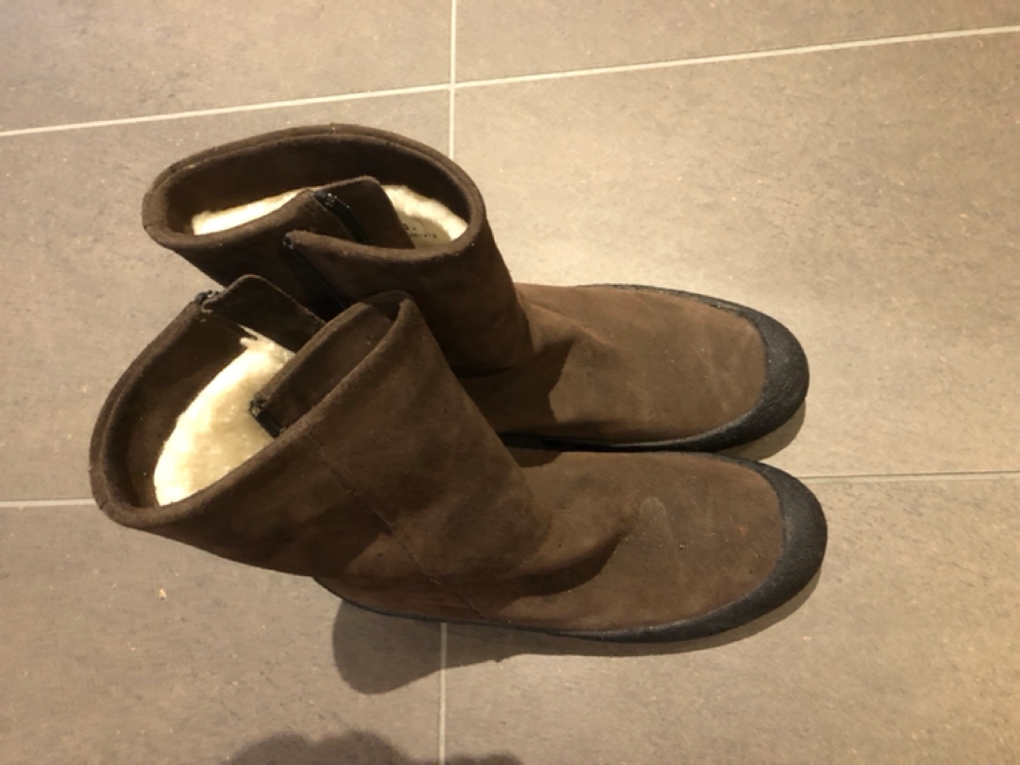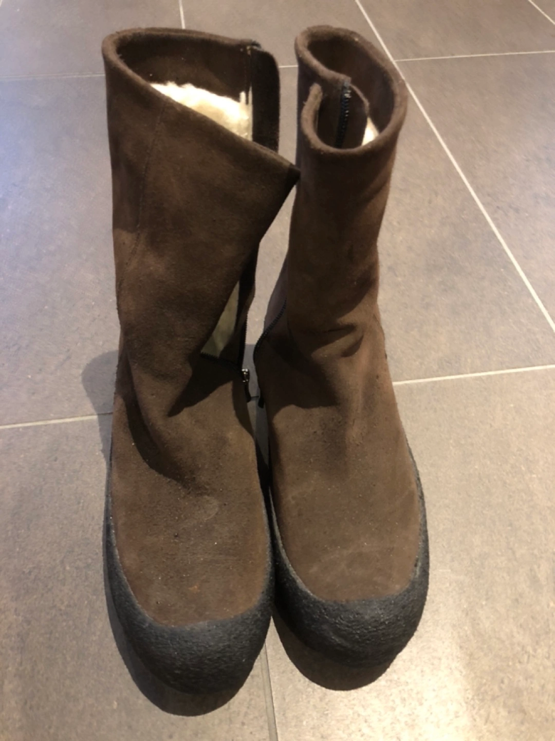 Brown suede boots with a zipper closure. The boots are lined with a white, fuzzy material. The soles are black rubber. Compare at $930 brand new. Located in the West End.