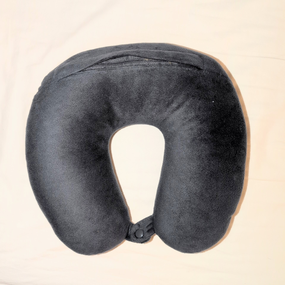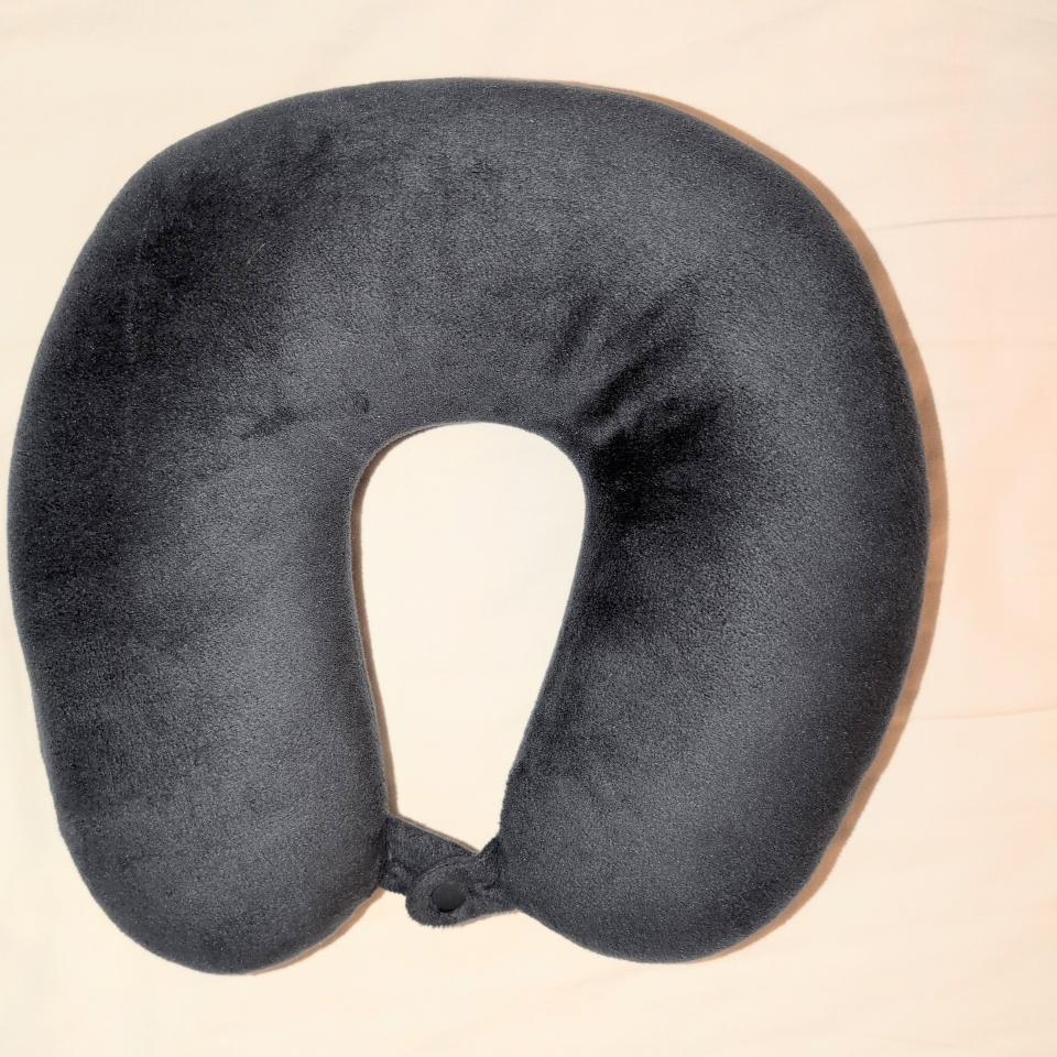 Dark gray travel neck pillow. Great for supporting your neck while travelling. Washable cover.