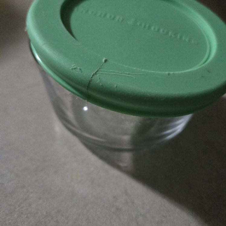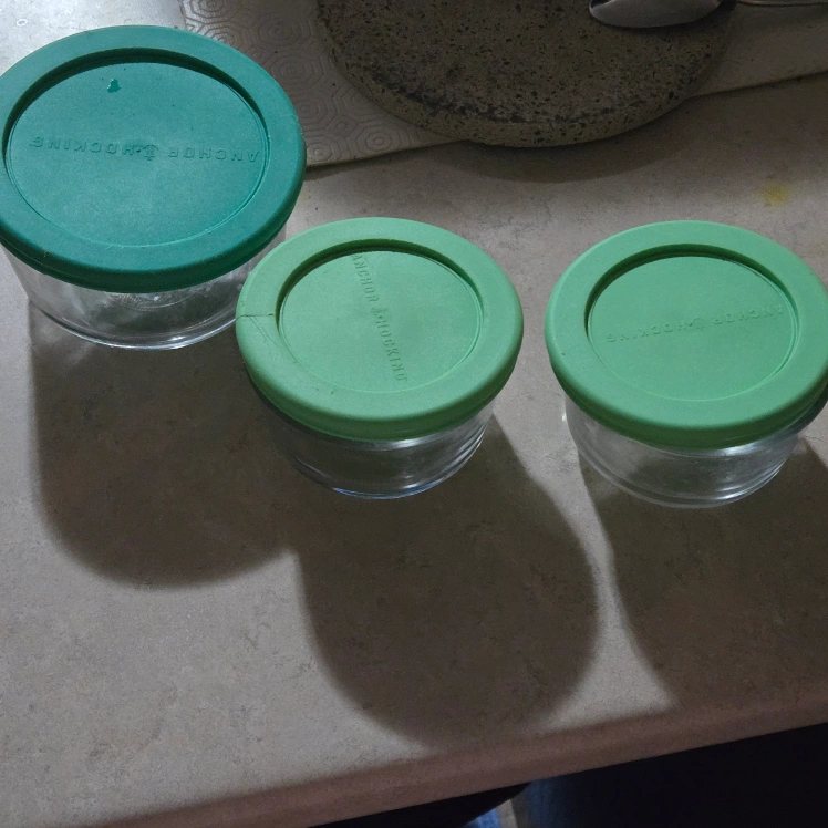Three glass storage containers with lids. One lid has a small crack. 2 small greens holds 1 cups and .1 med green holds 2 cups
