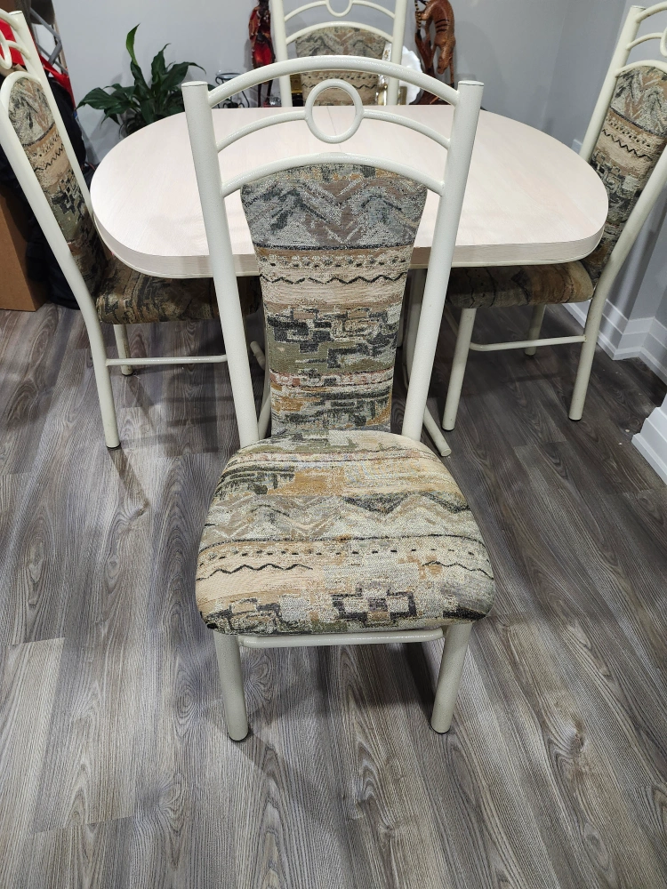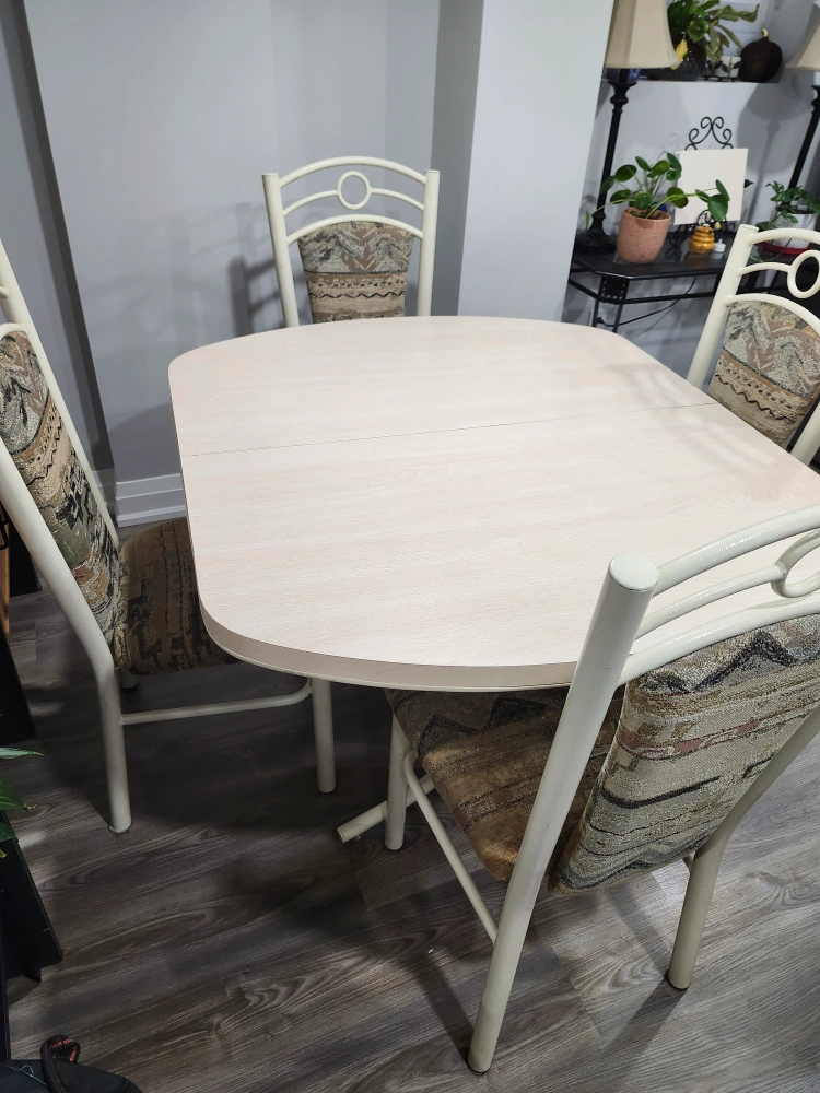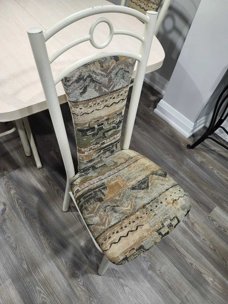 White dining table set with 4 chairs. Table is oval and extends with a leaf. Chairs have a white metal frame and patterned fabric seats. $60 OBO