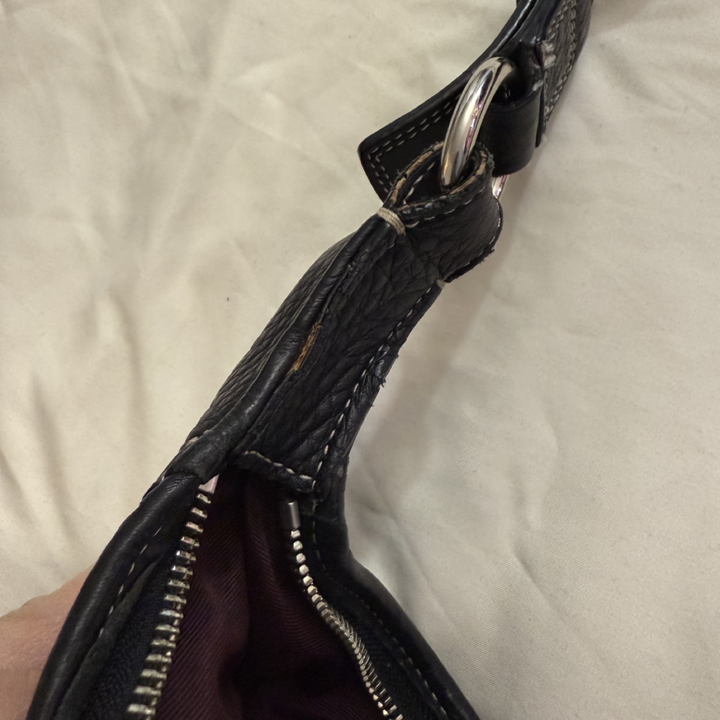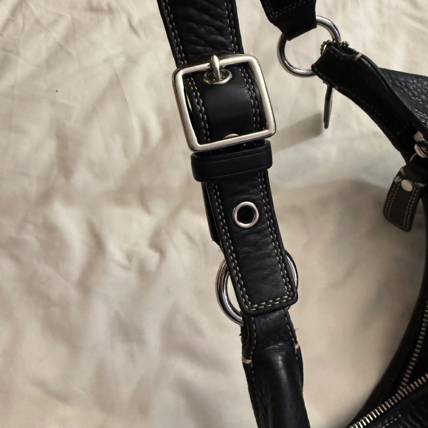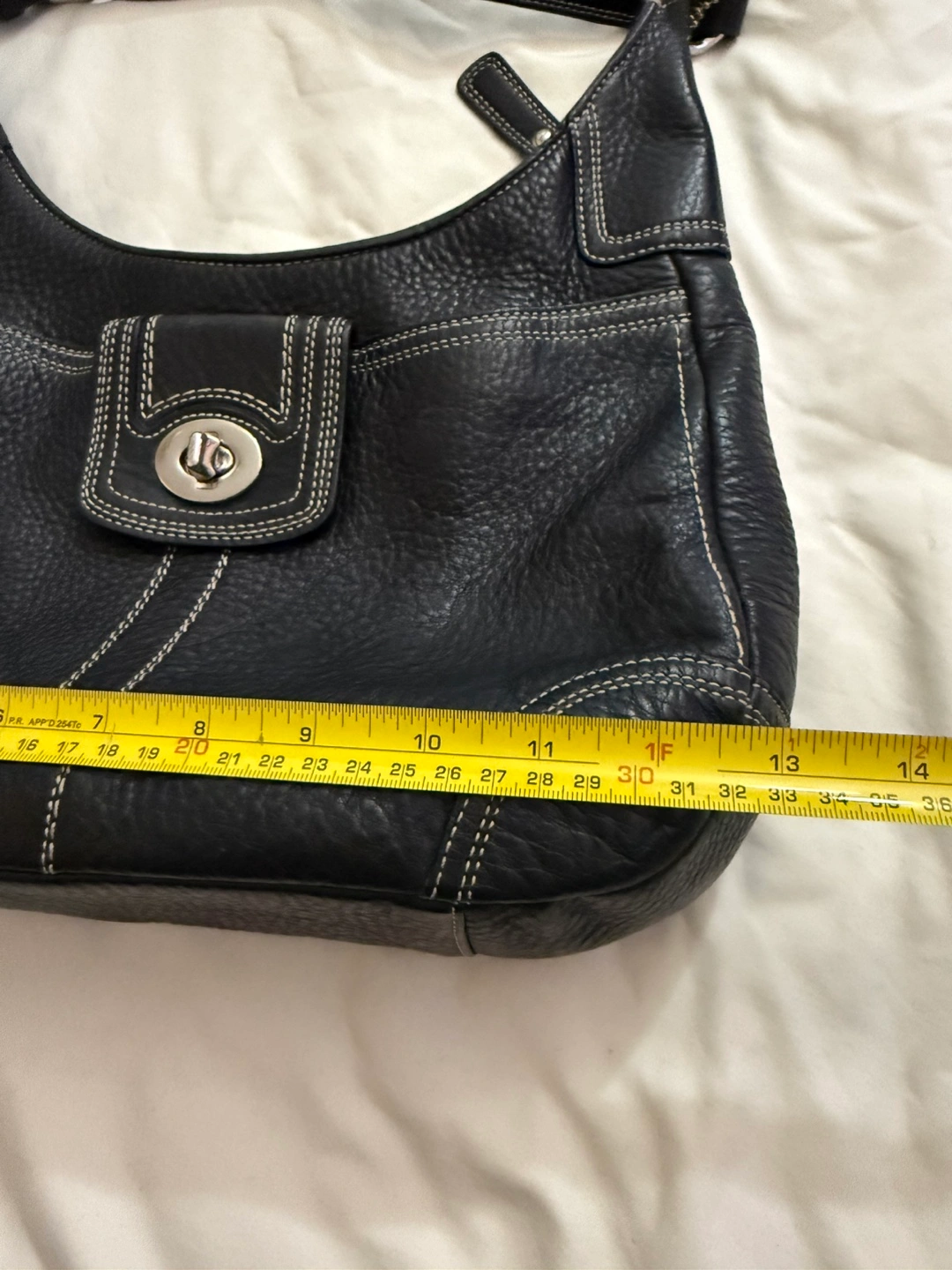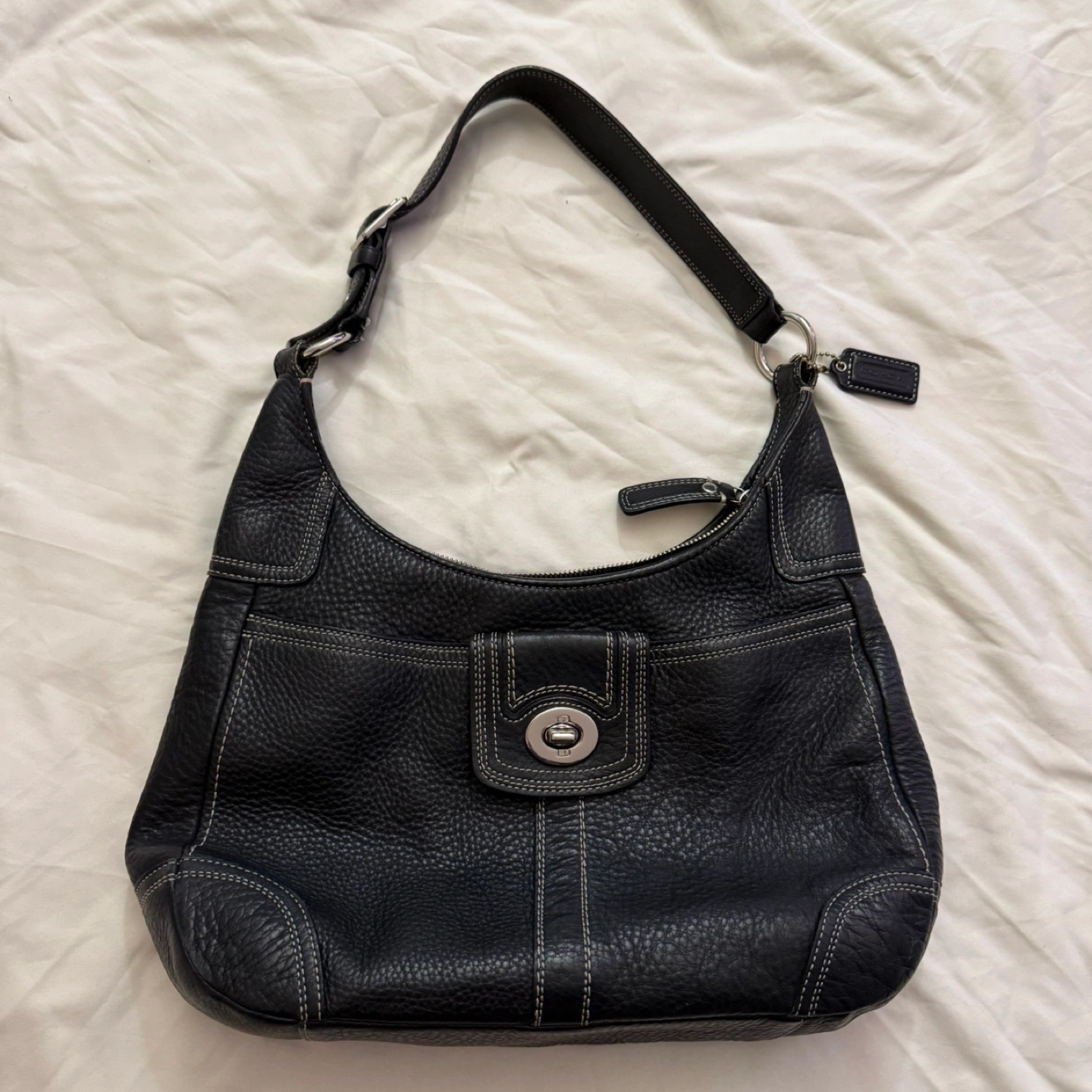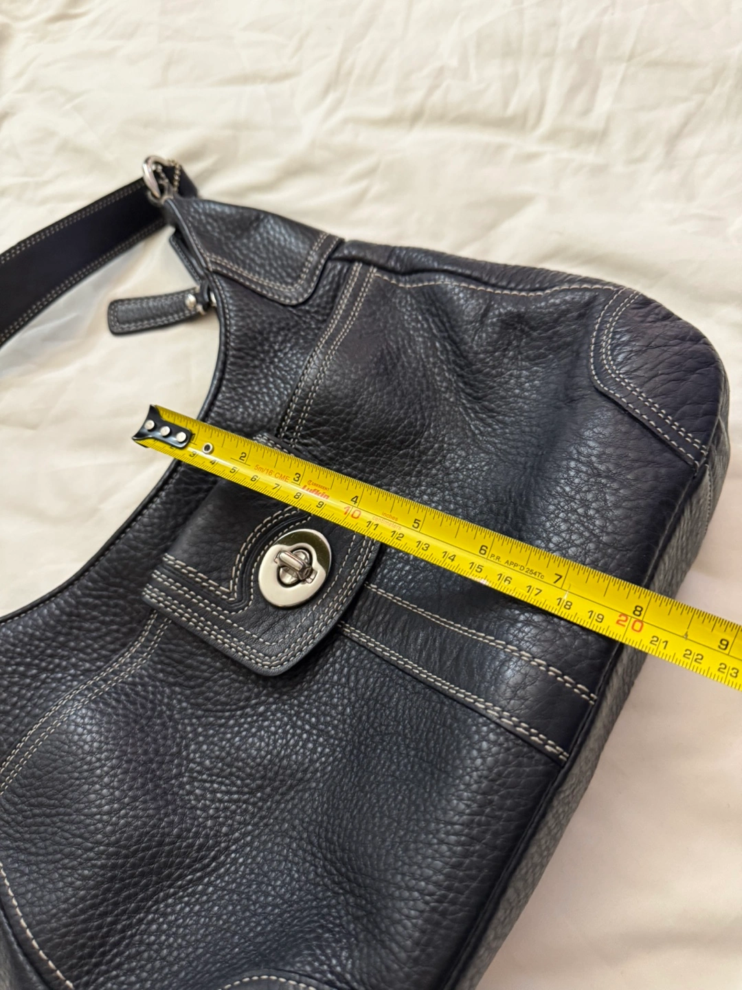 Black leather shoulder bag with silver hardware. The bag has a flap closure with a turn lock and a zippered pocket on the front. The bag has a single adjustable strap.