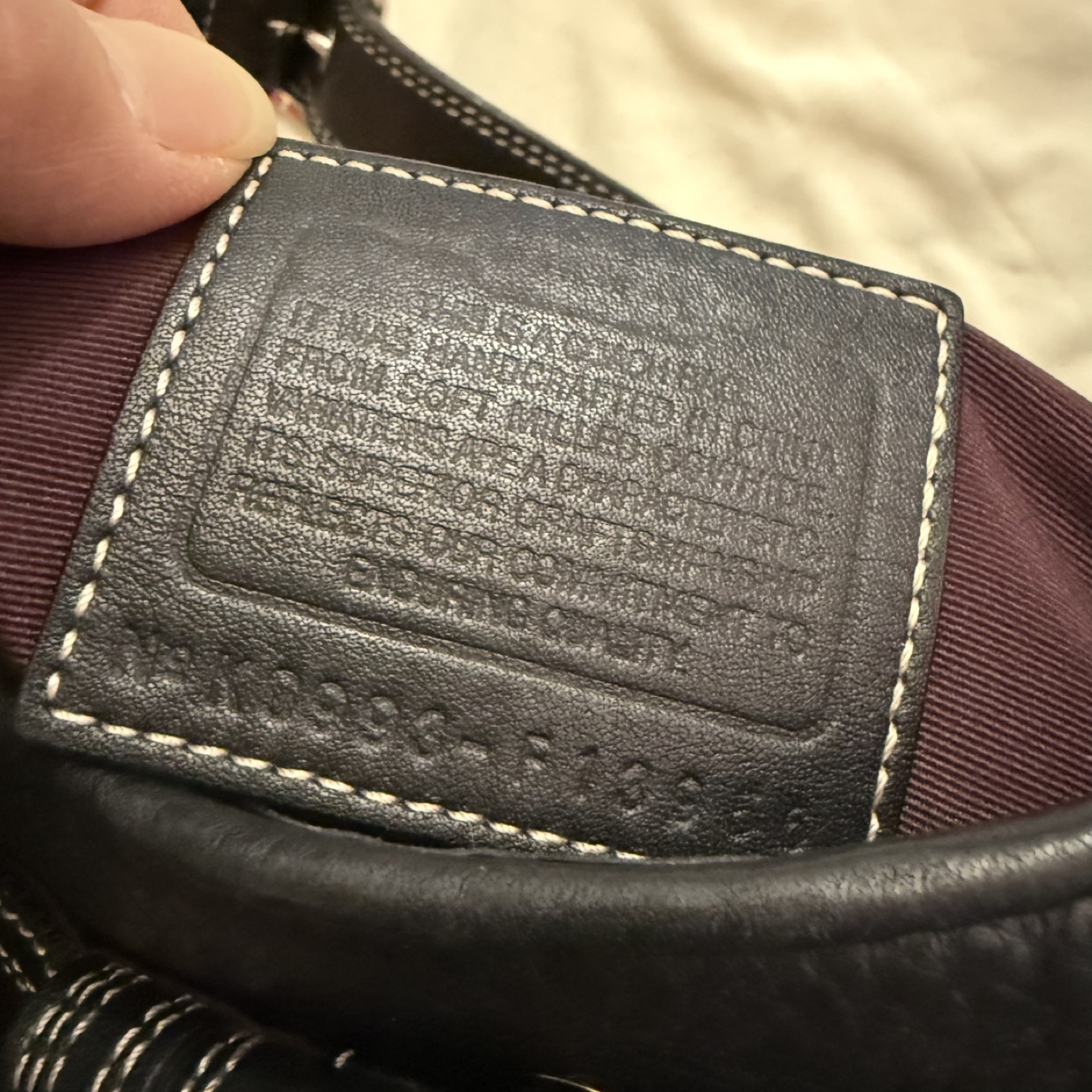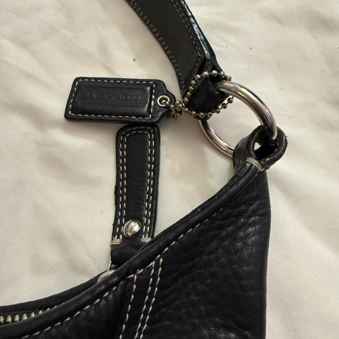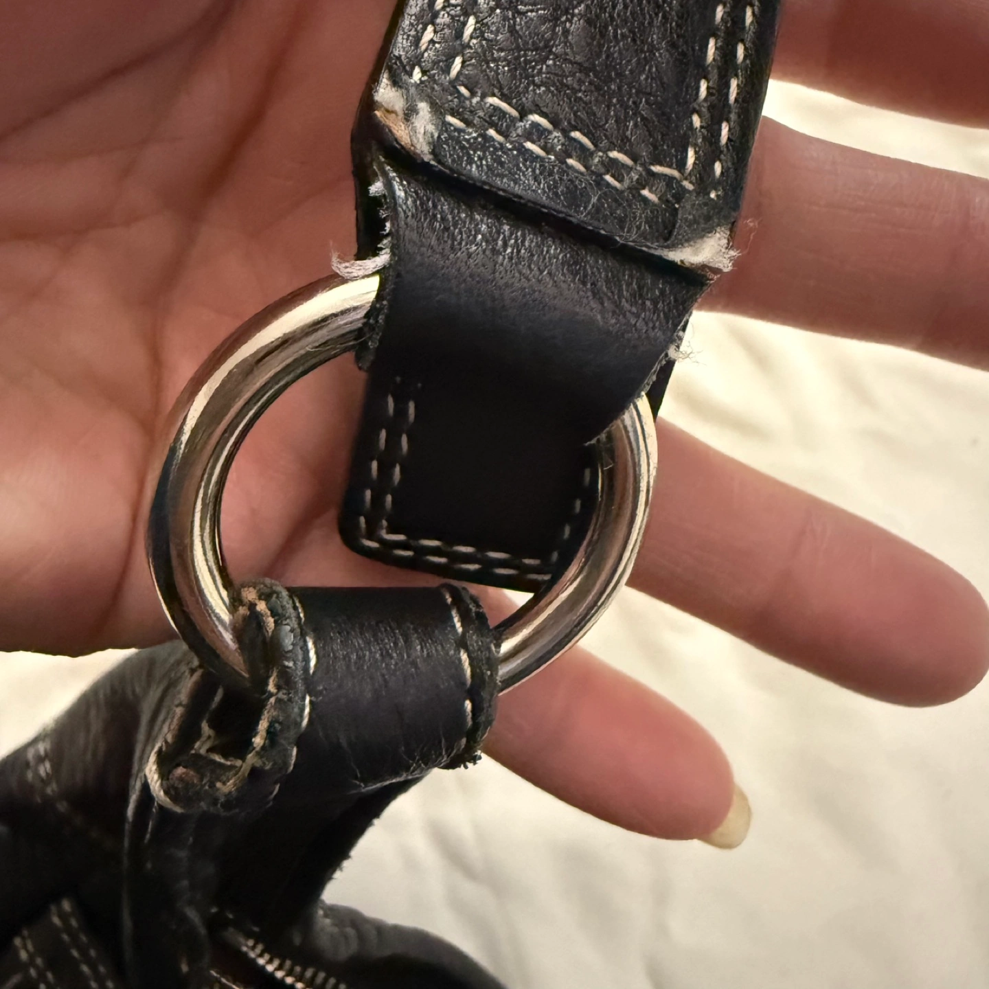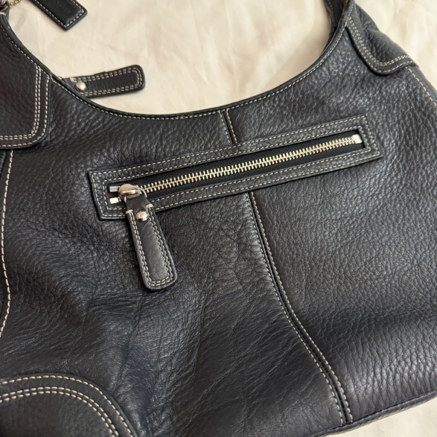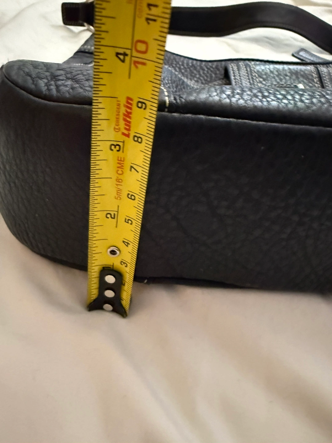 Black leather shoulder bag with silver hardware. The bag has a flap closure with a turn lock and a zippered pocket on the front. The bag has a single adjustable strap.
