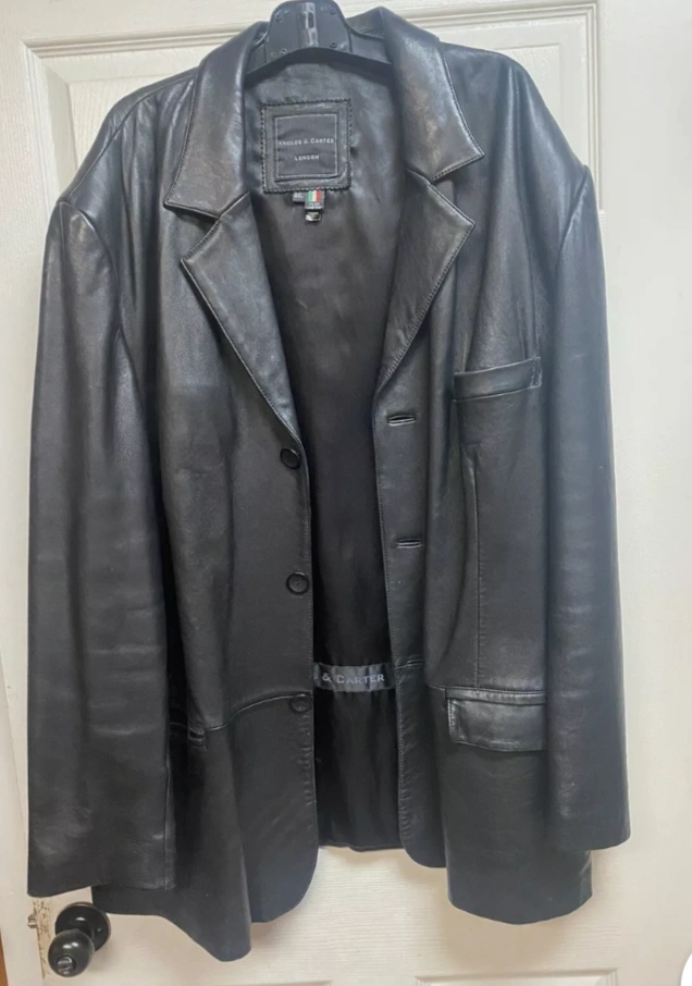 Black leather jacket with zippered quilted lining that is removable. Button front with two pockets. Long sleeves.