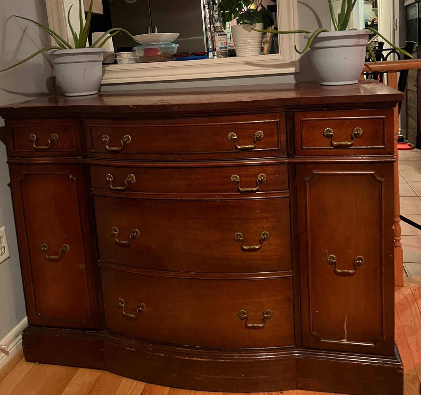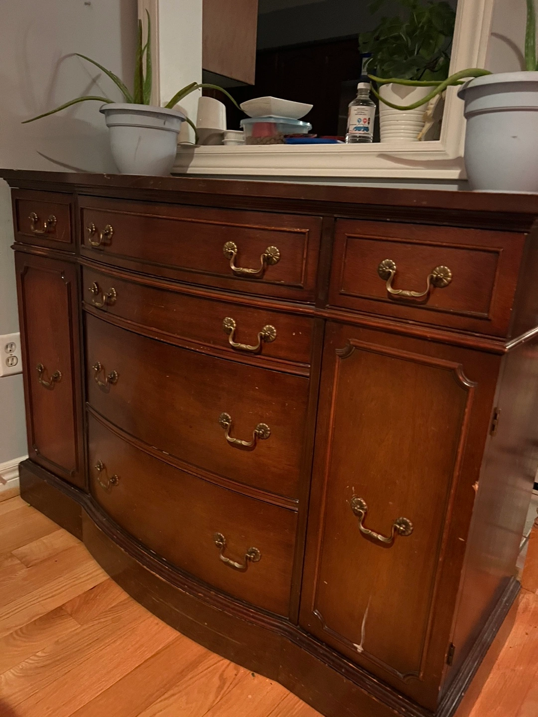 Four drawers and two cabinets. Beautiful solid wood. Original hardware. Great table for tv, coffee machine and storing drinks and cups along with cutlery as well.