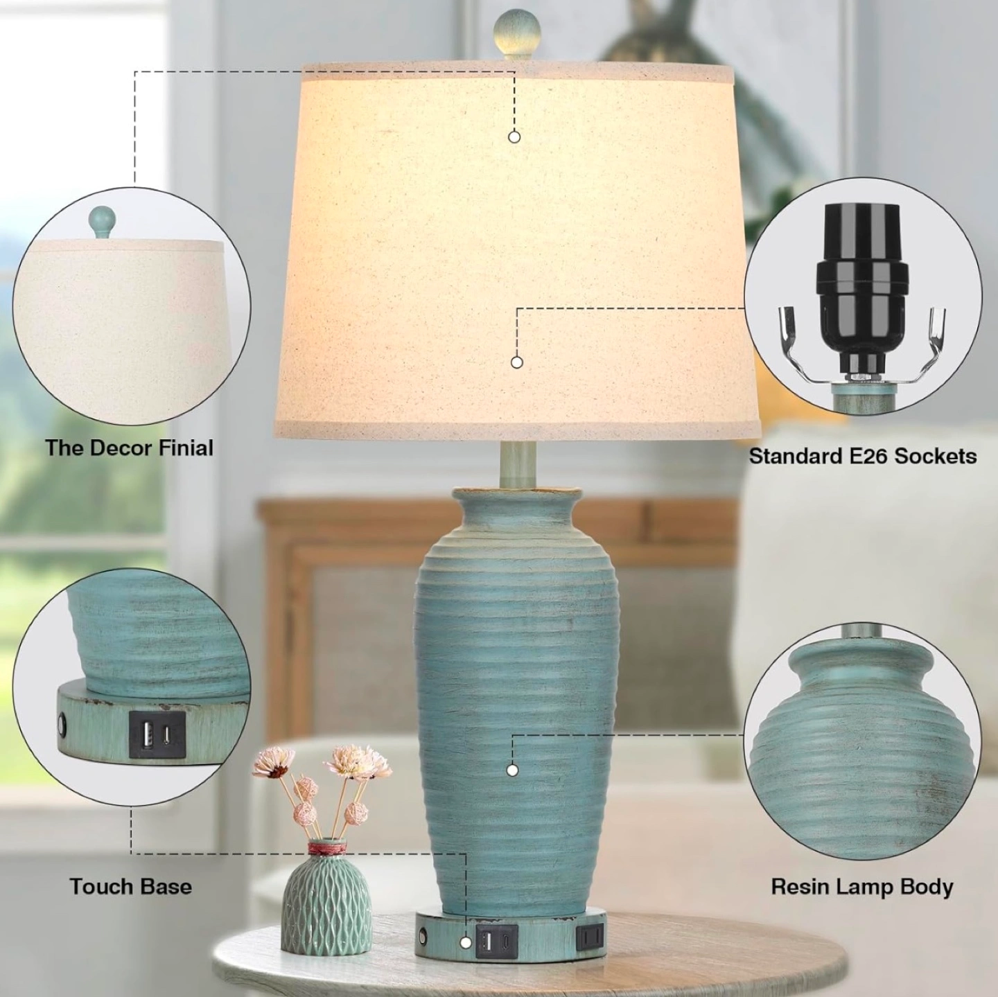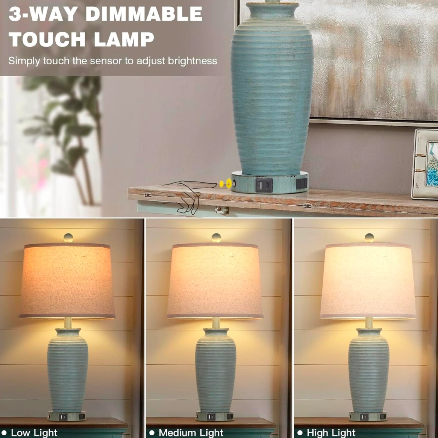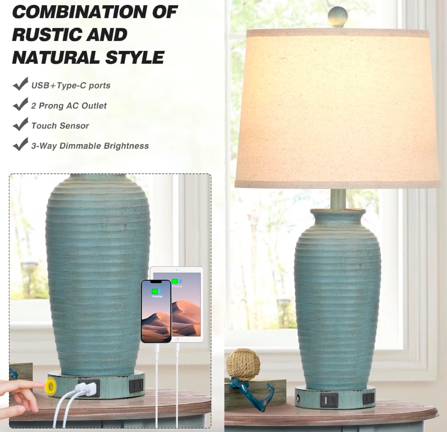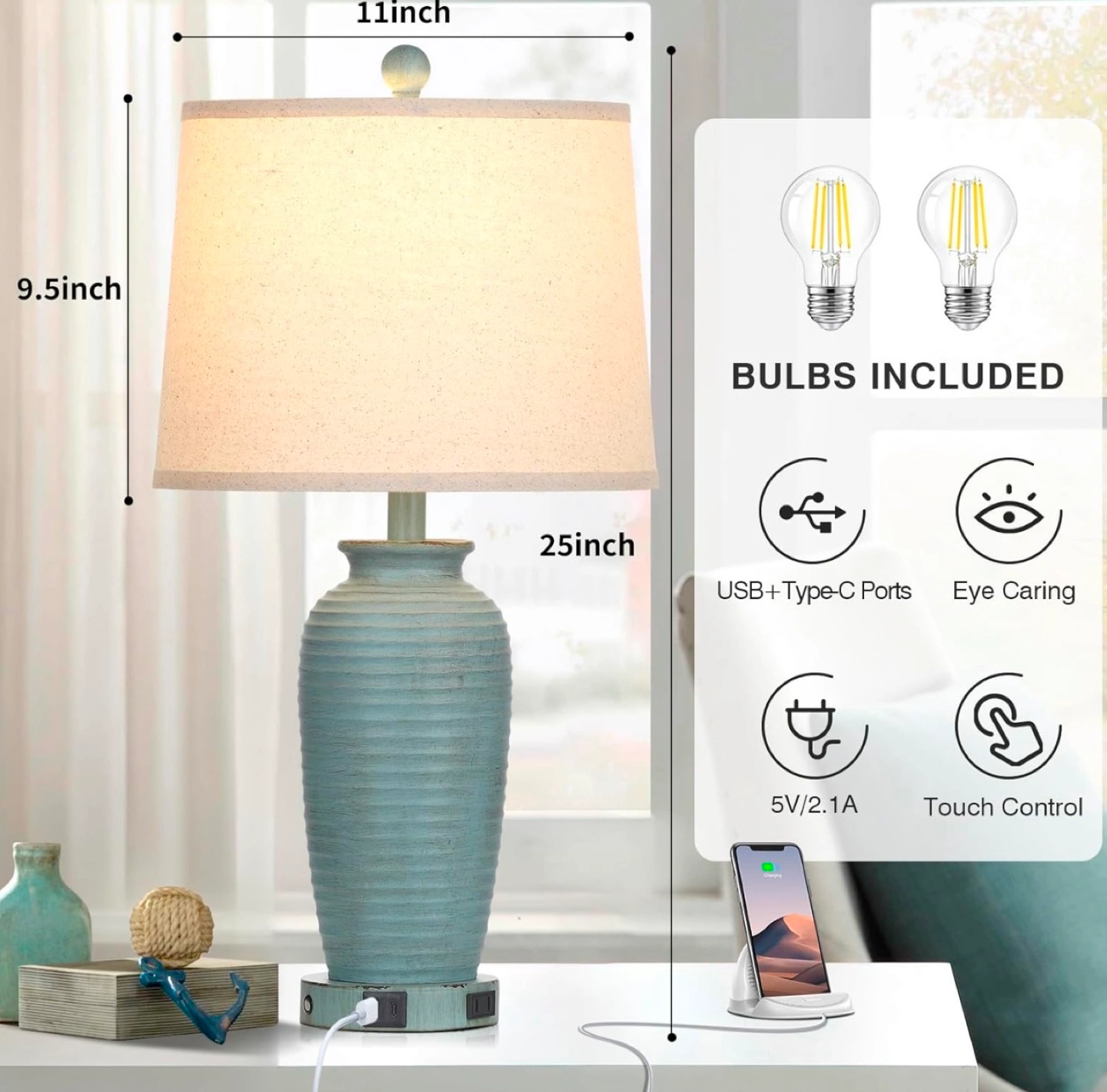 Table lamp with touch sensor control and 3-way dimming. Features a USB port and outlet for charging devices. Includes two light bulbs.