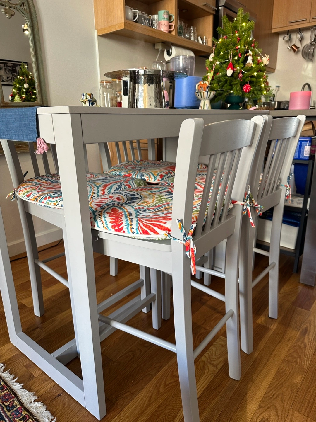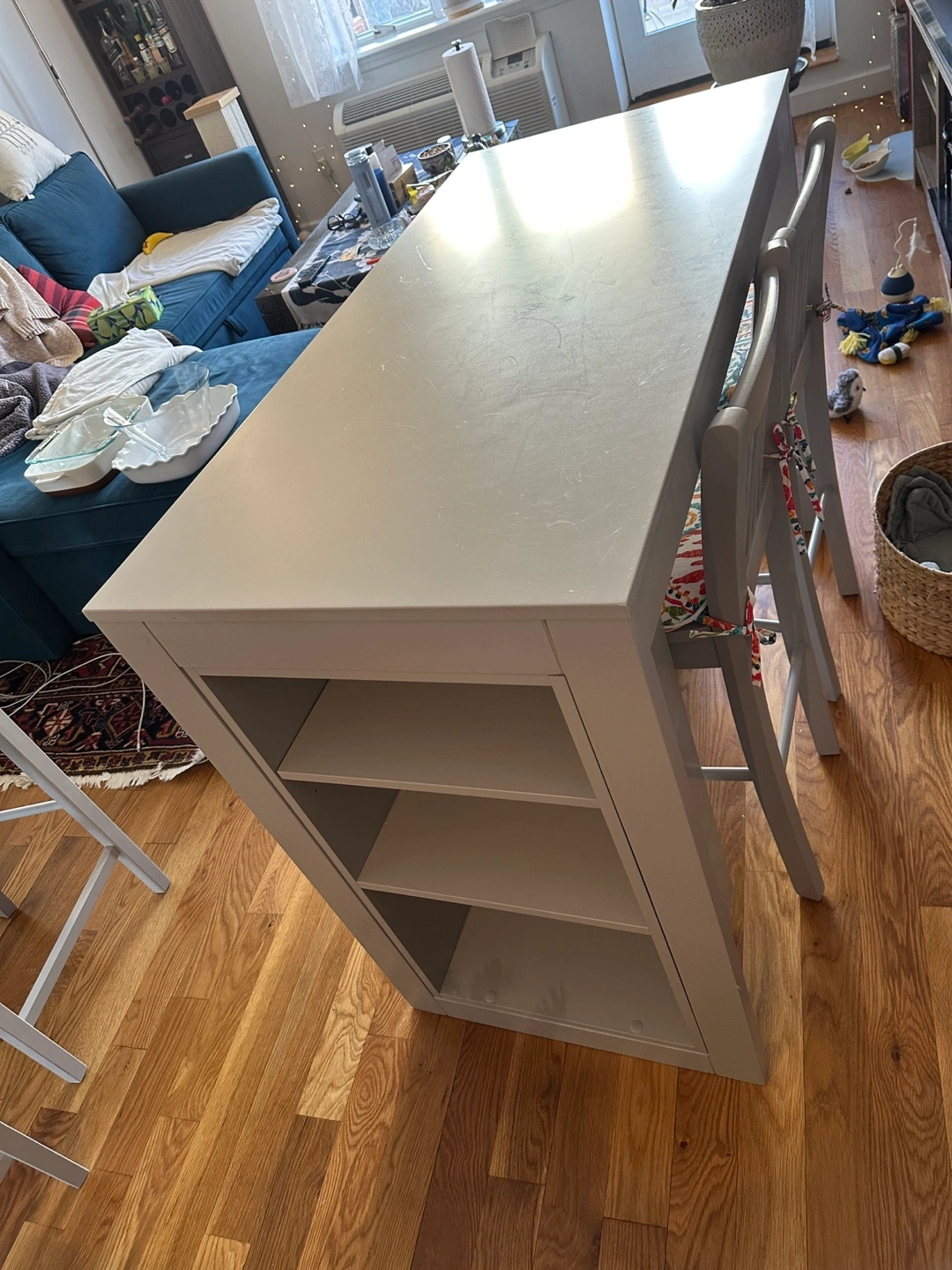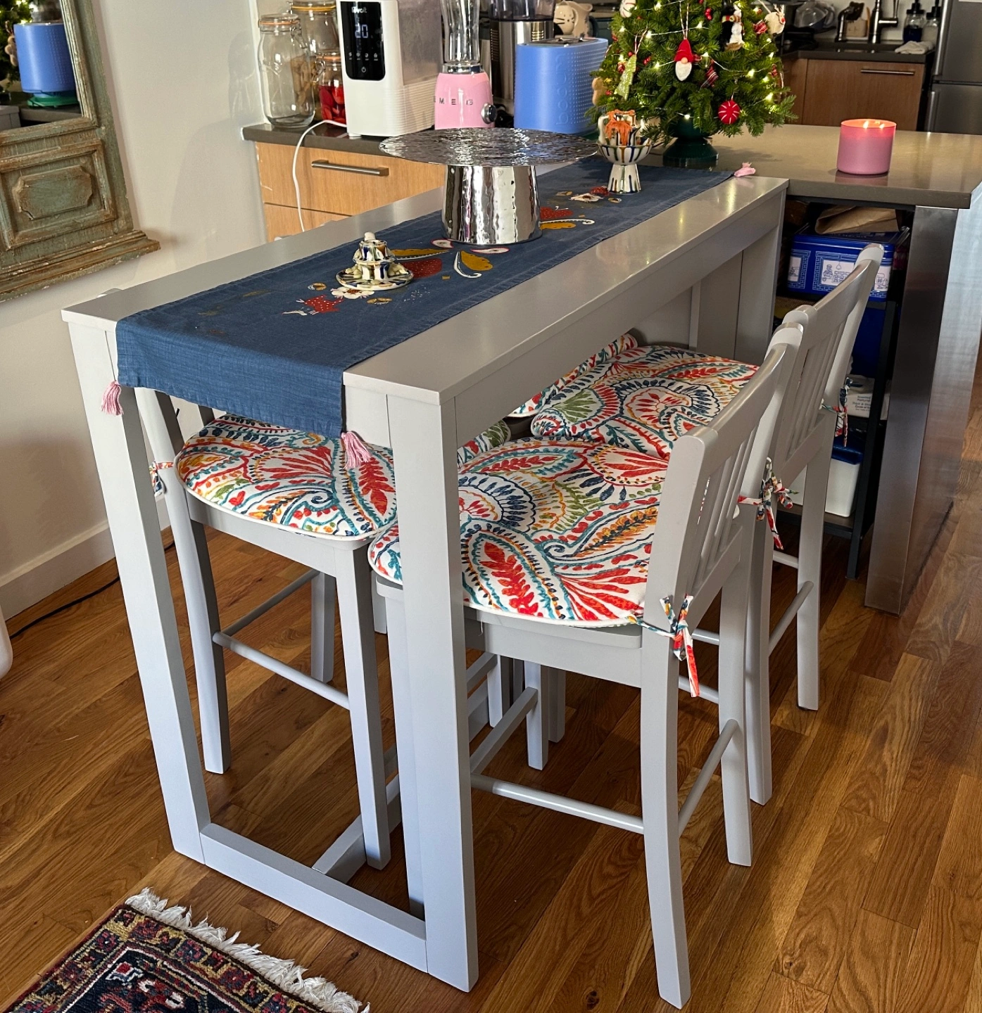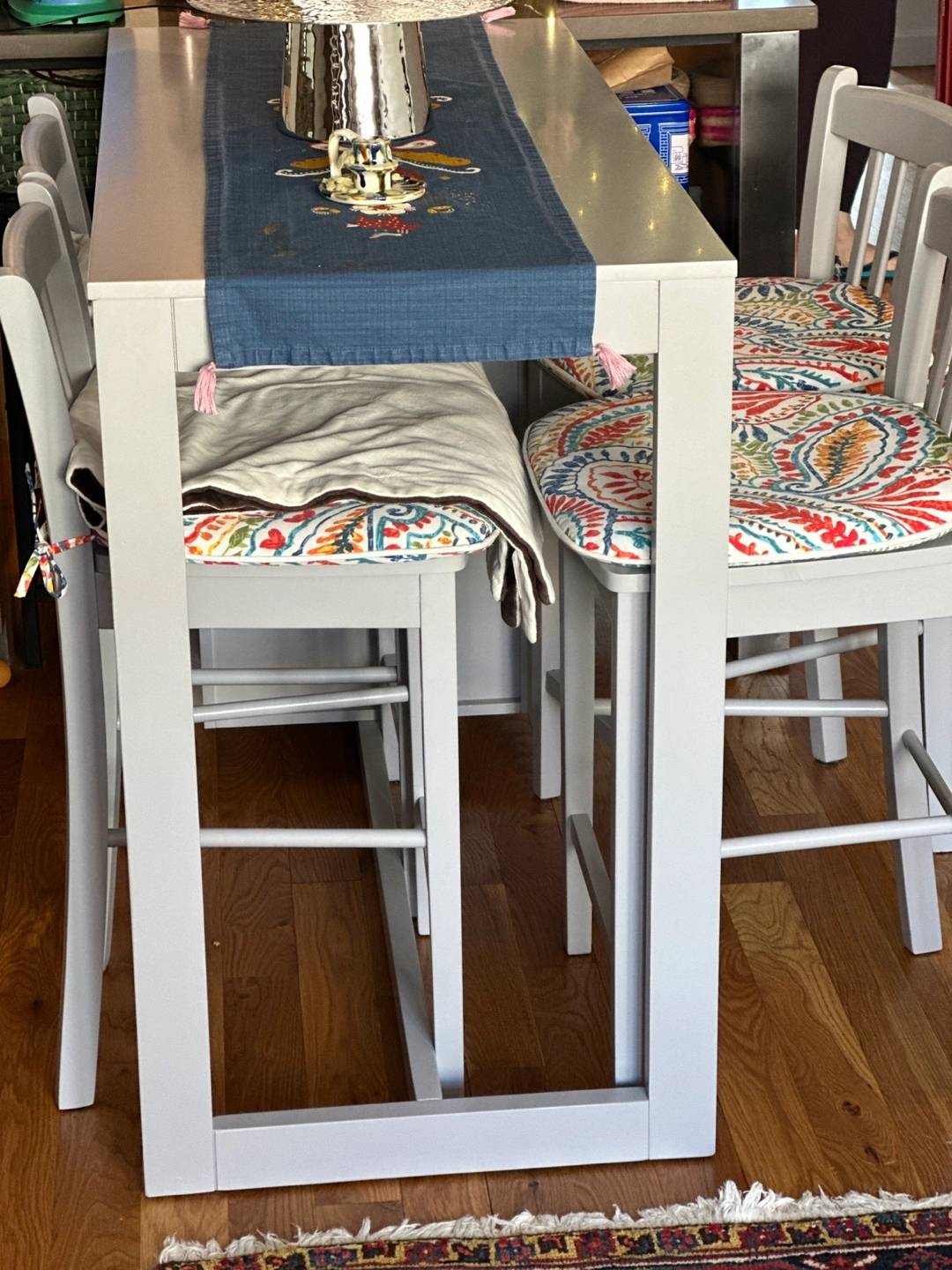 Gray kitchen island table with three shelves and four stools w/ cushions.