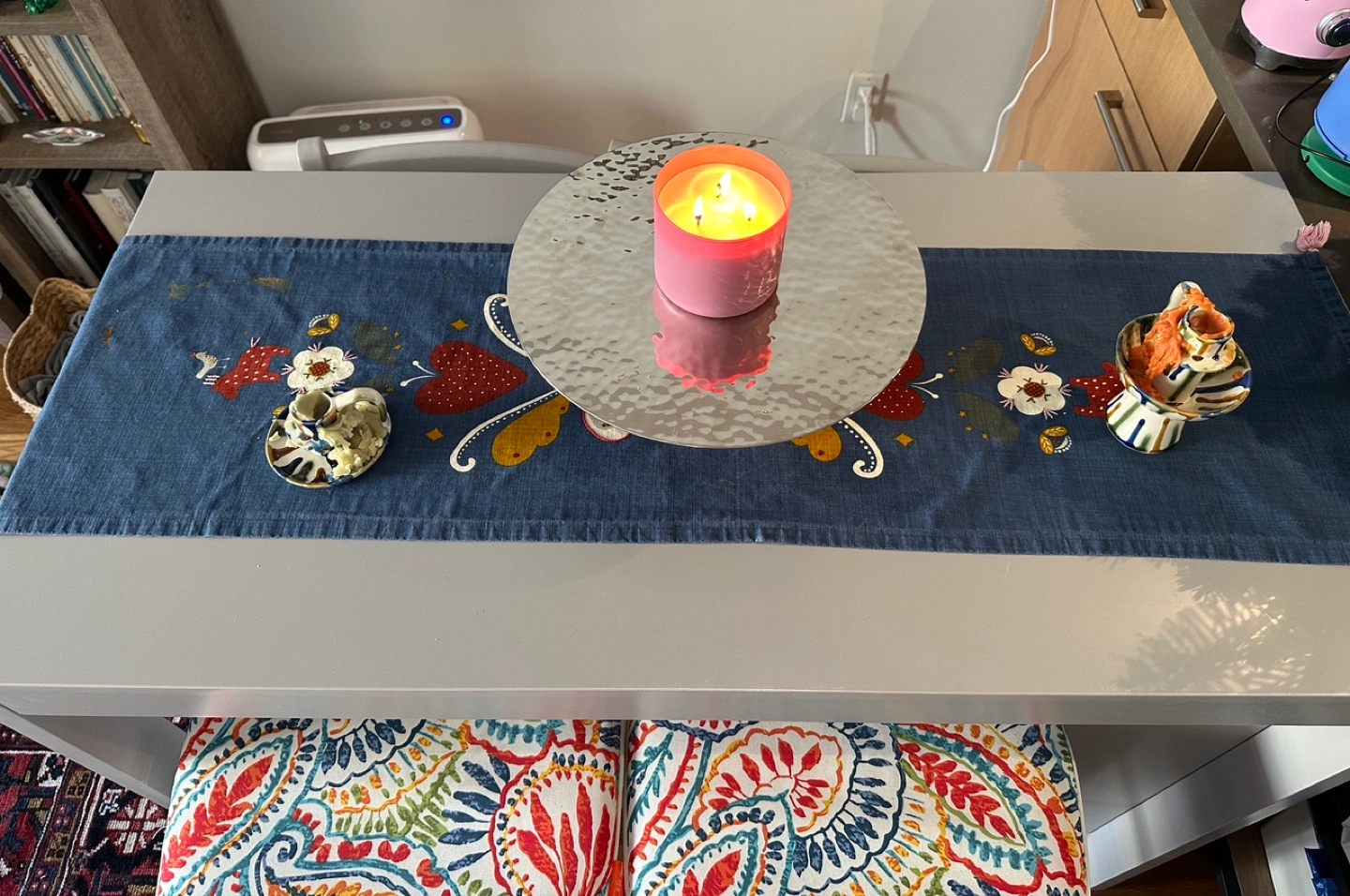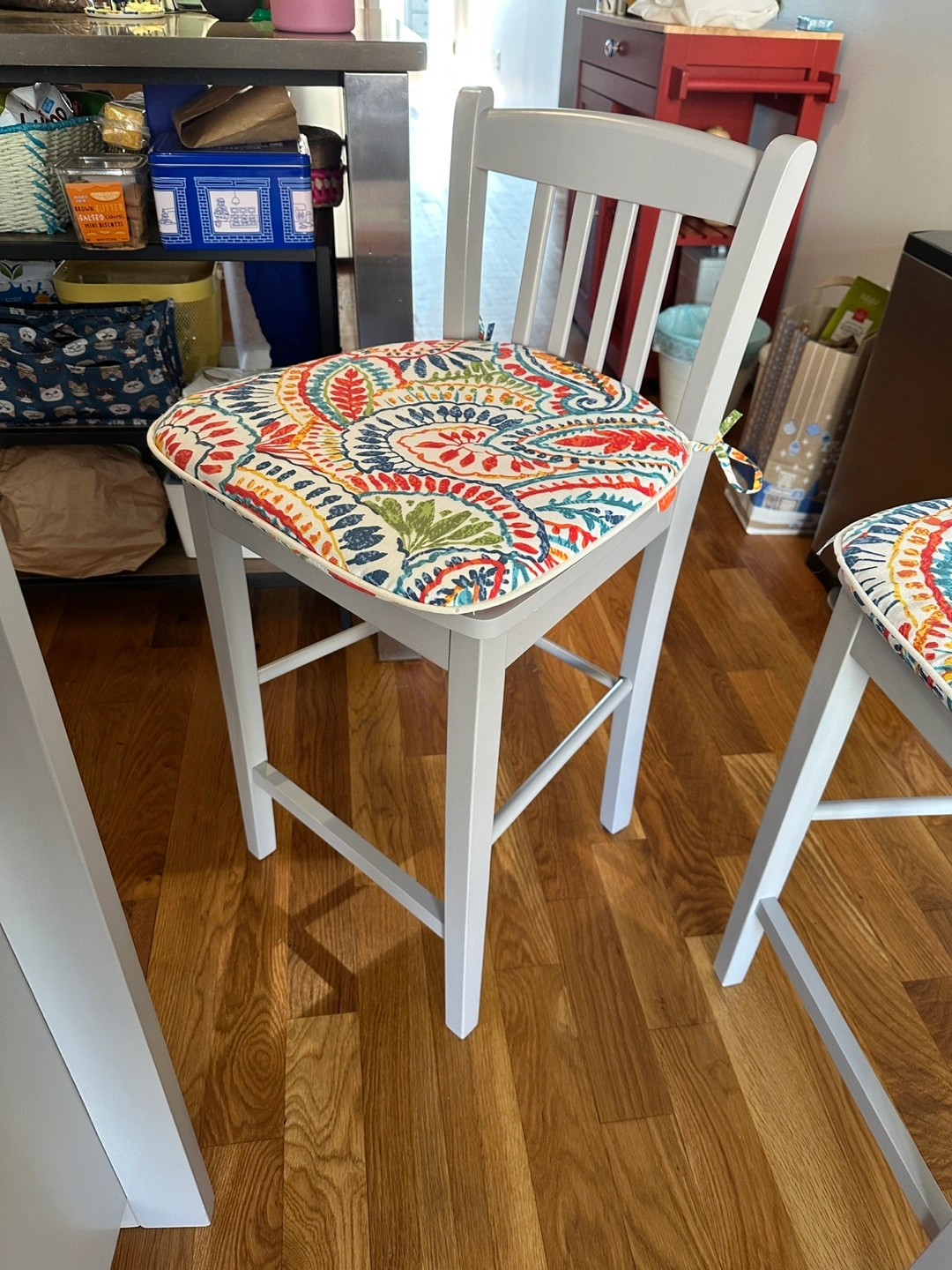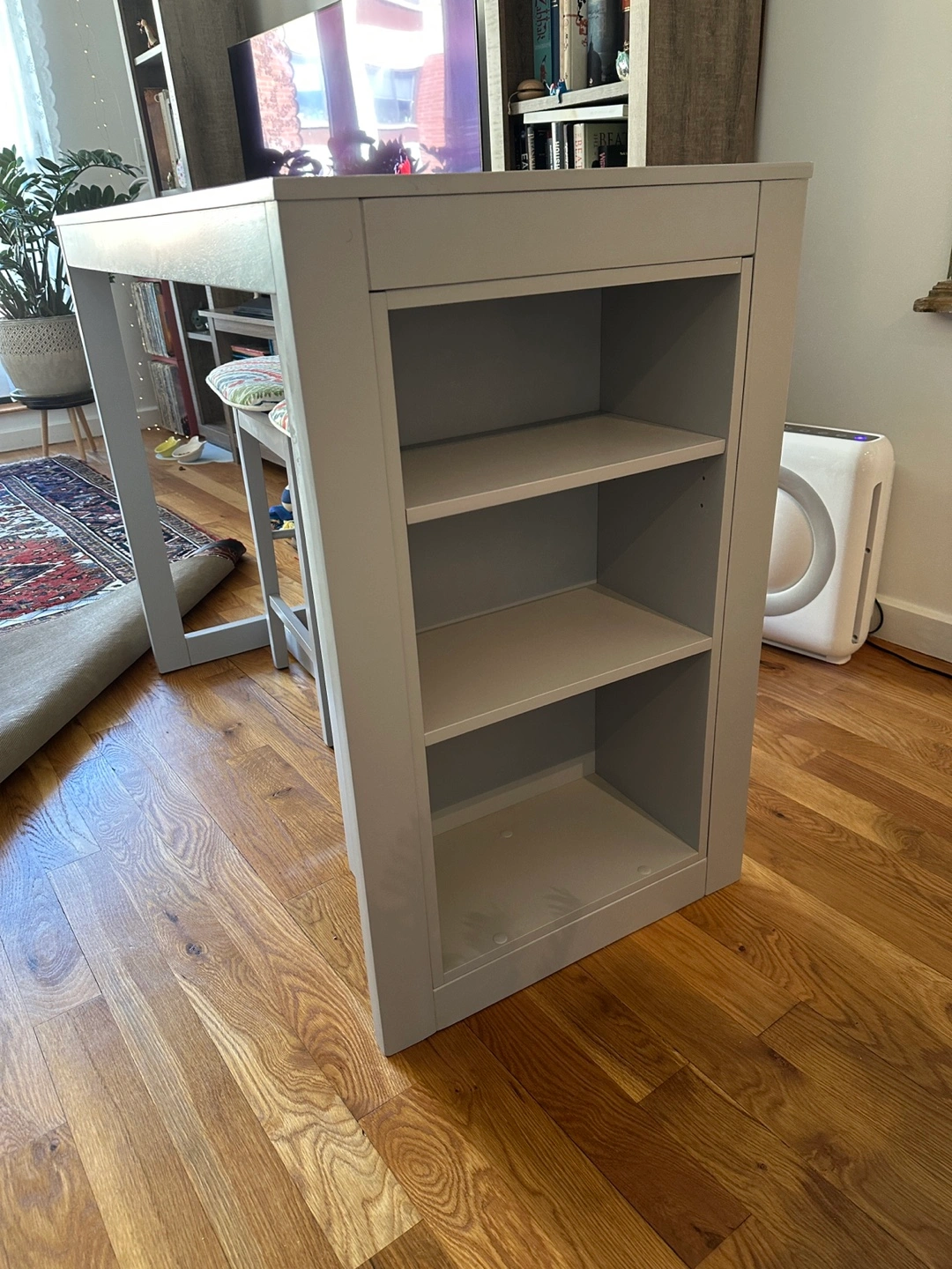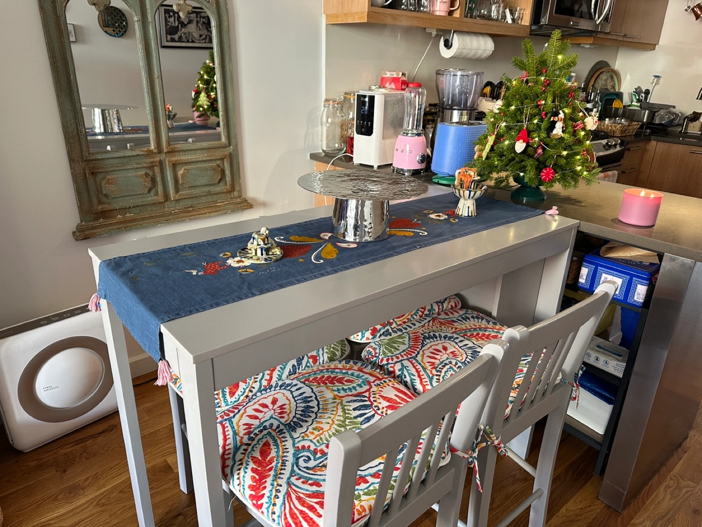 Gray kitchen island table with three shelves and four stools w/ cushions.