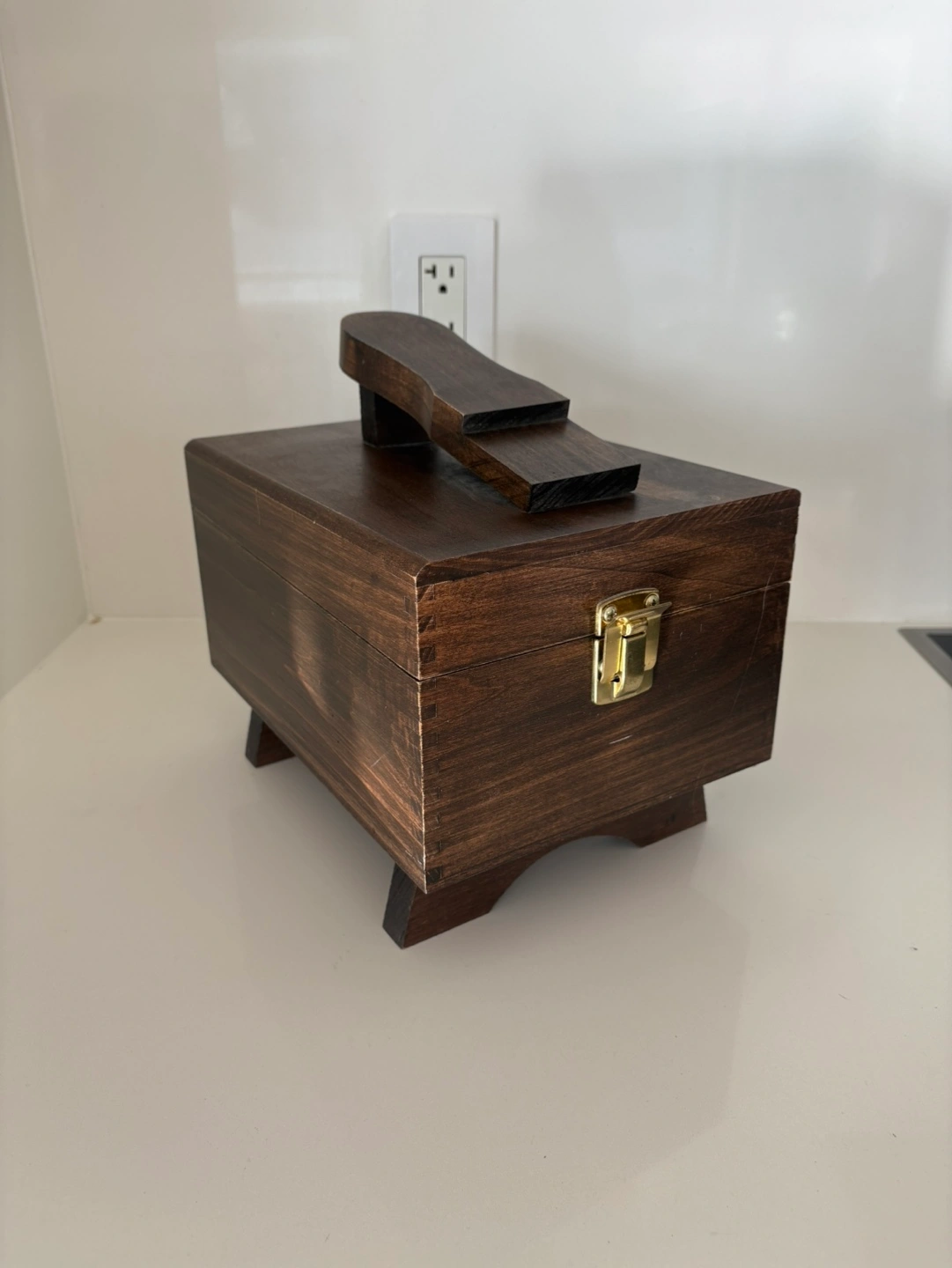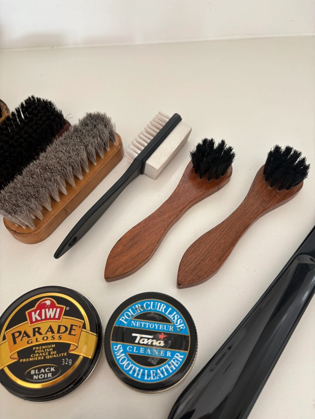 Wooden shoe shine kit. Contains various brushes, polish, and a shoe horn. It is lightly used but all items are in great condition, clean, and ready to be used.