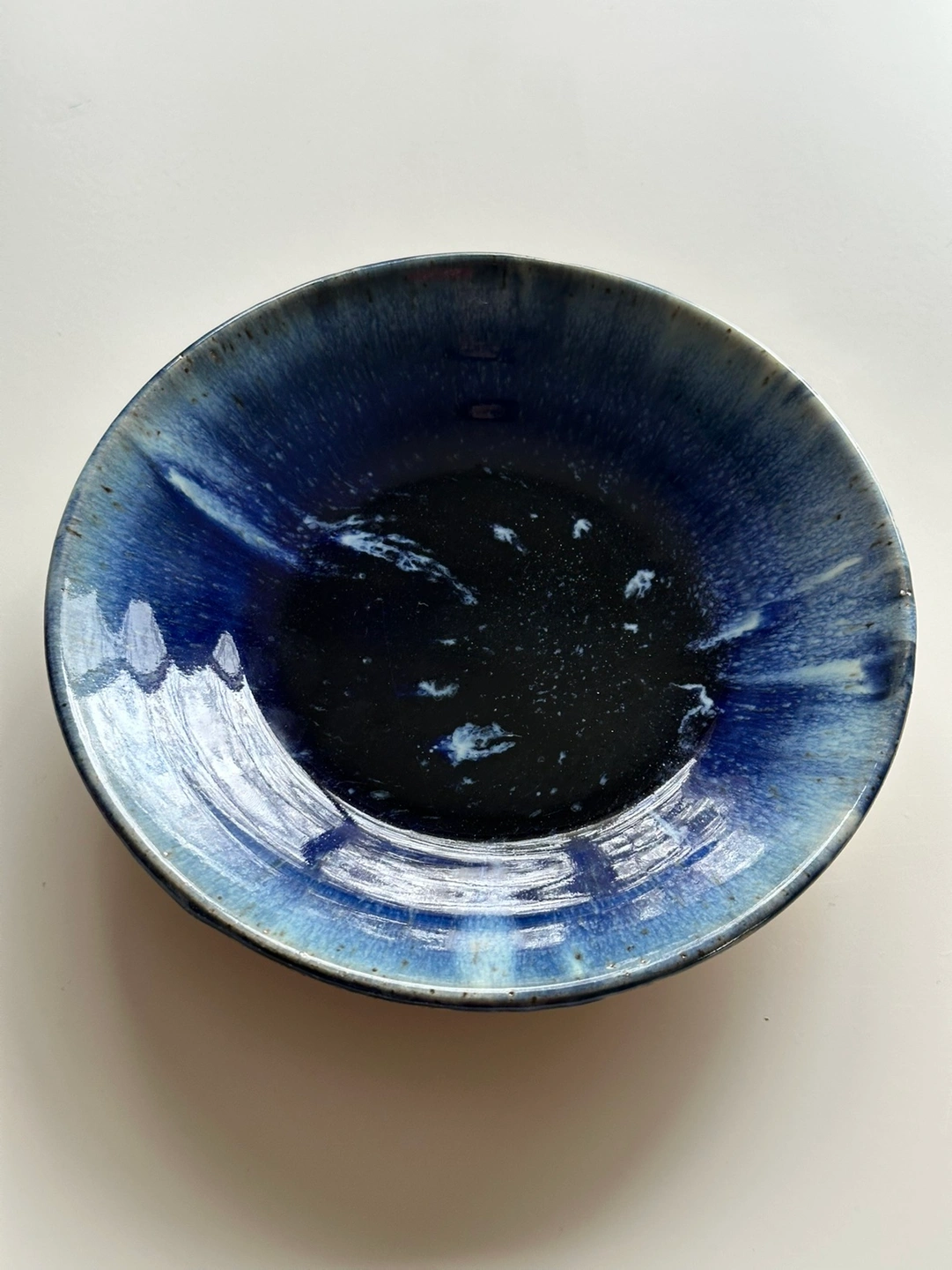 Ok so this bowl-plate is SO SHINY and amazing that it was hard to take proper photos of without glare and that really captured the depth of the colours. It starts out light blue around the edges and then descends into royal and dark dark dark navy, almost black, with a mirror-like sheen. Most of the teeny tiny white speckles in the photo are the light reflecting back at the lamp, but it does have larger white flecks. This plate looks like a cross between deep space/going into hyperdrive and the evil eye protection symbol, but in reversed colourways. Definitely should eat food off of this.