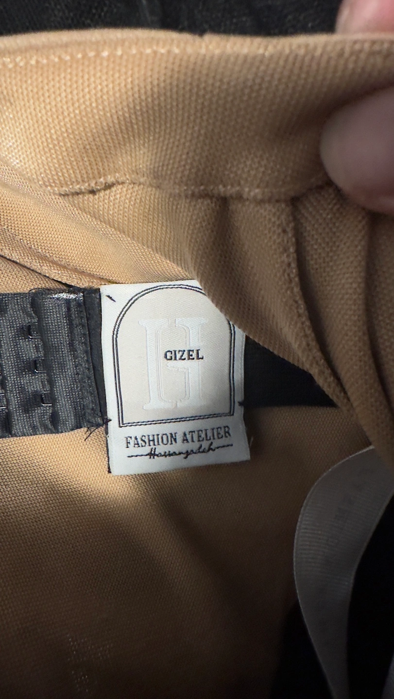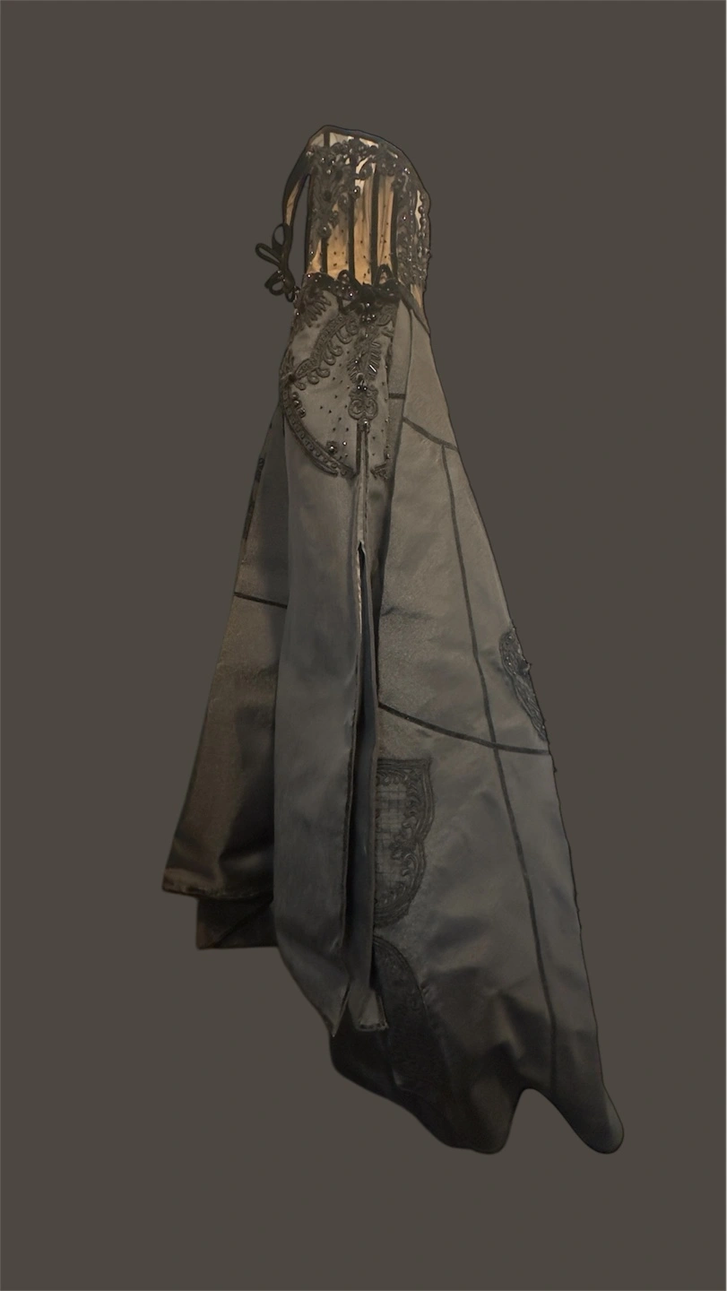Black formal dress with lace detailing and bead embellishments. Features a velvet ribbon and bows. Sleeveless and floor length.