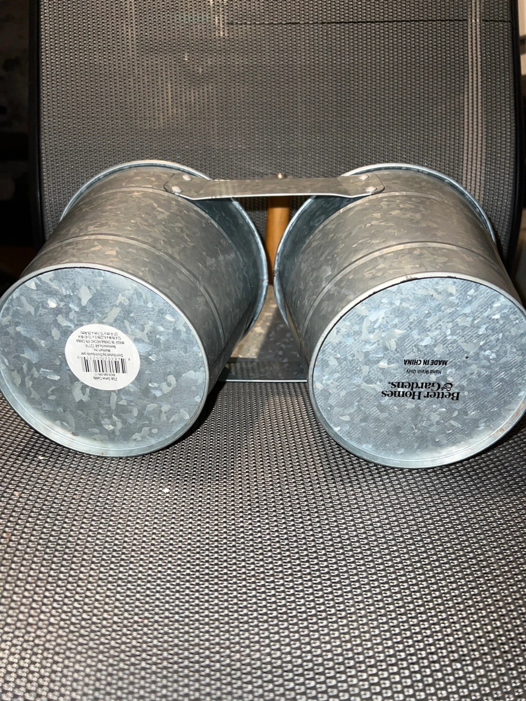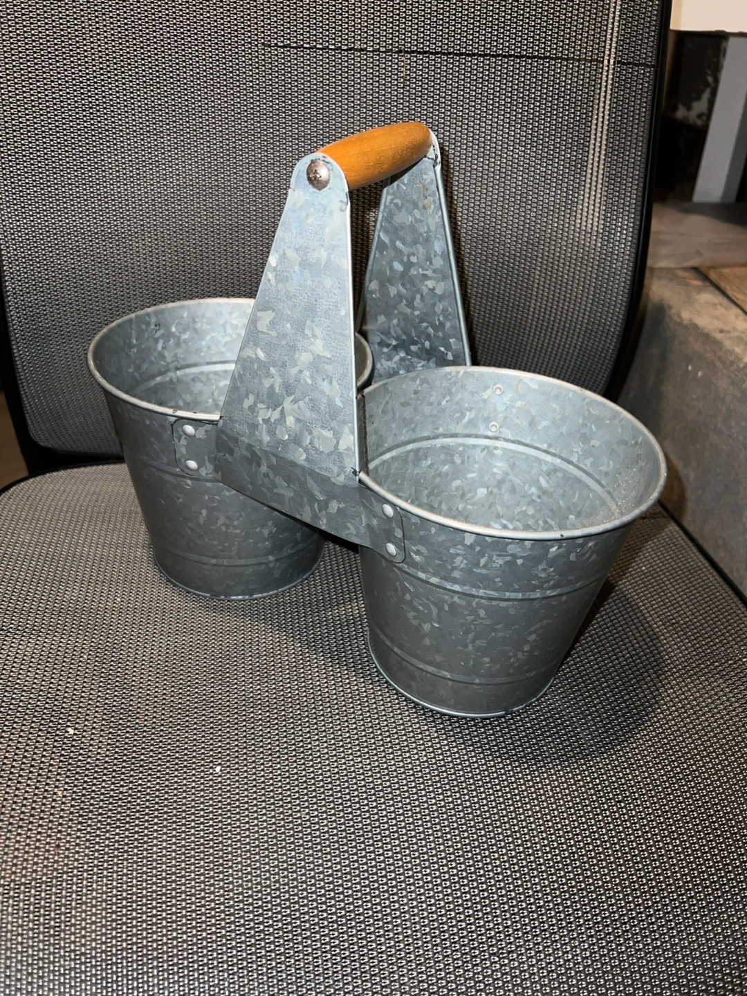 Metal galvanized utensil holder with wooden handle. Two containers.