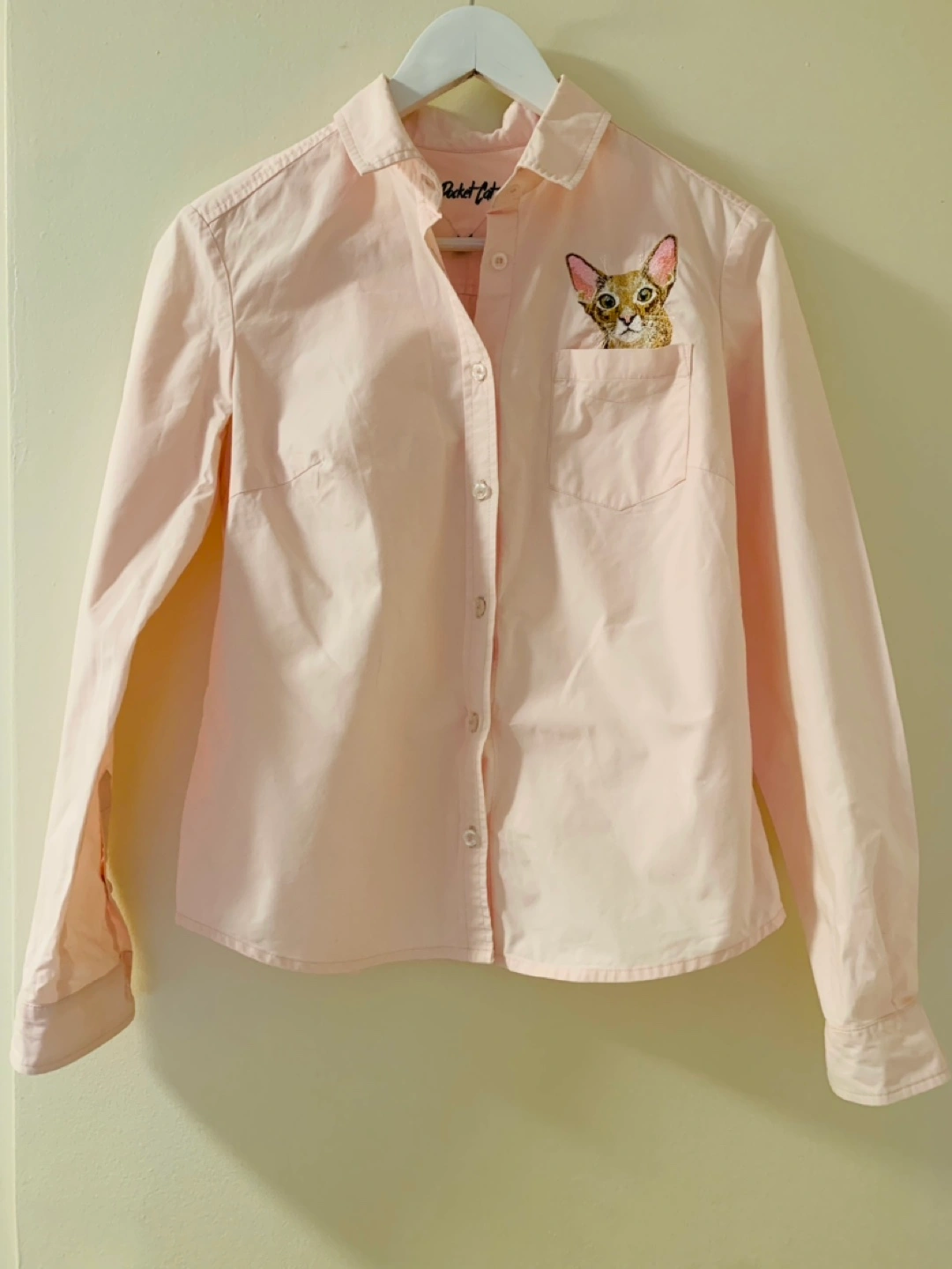 Long sleeve pink button up shirt with embroidered cat on pocket. Size M.