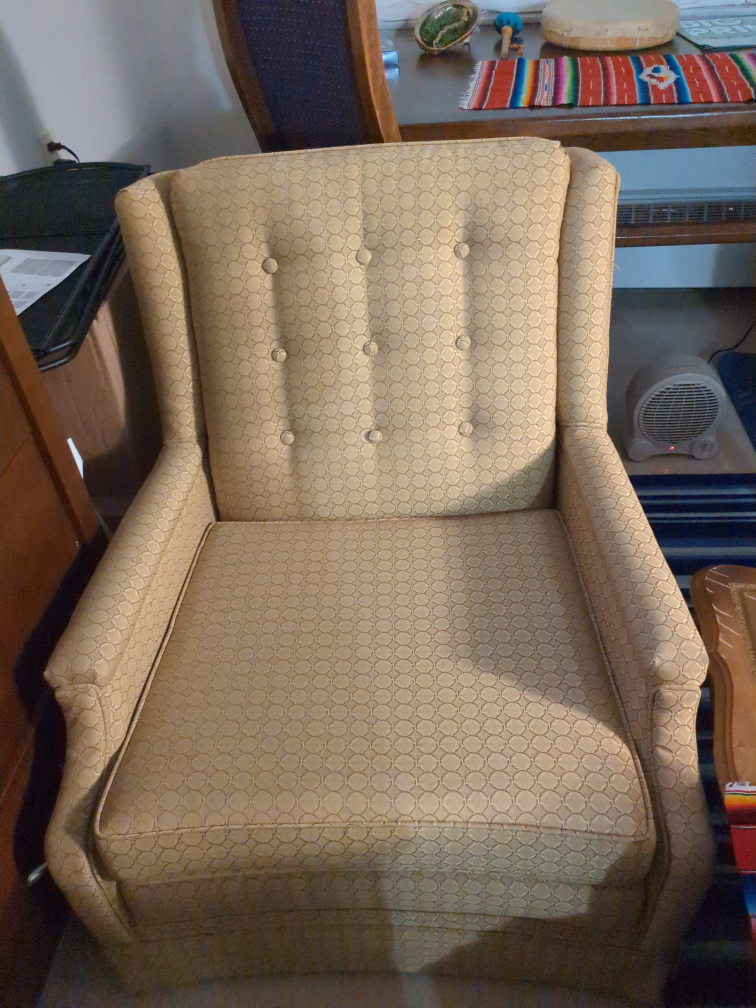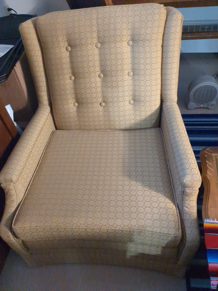 Comfortable armchair with a patterned fabric. Includes a high back and armrests.