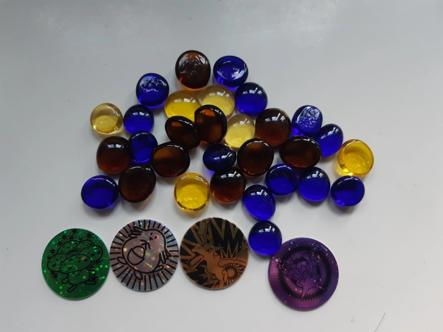 Collectible coins and damage counters from the old Pokémon Wizard of the Coast Era.