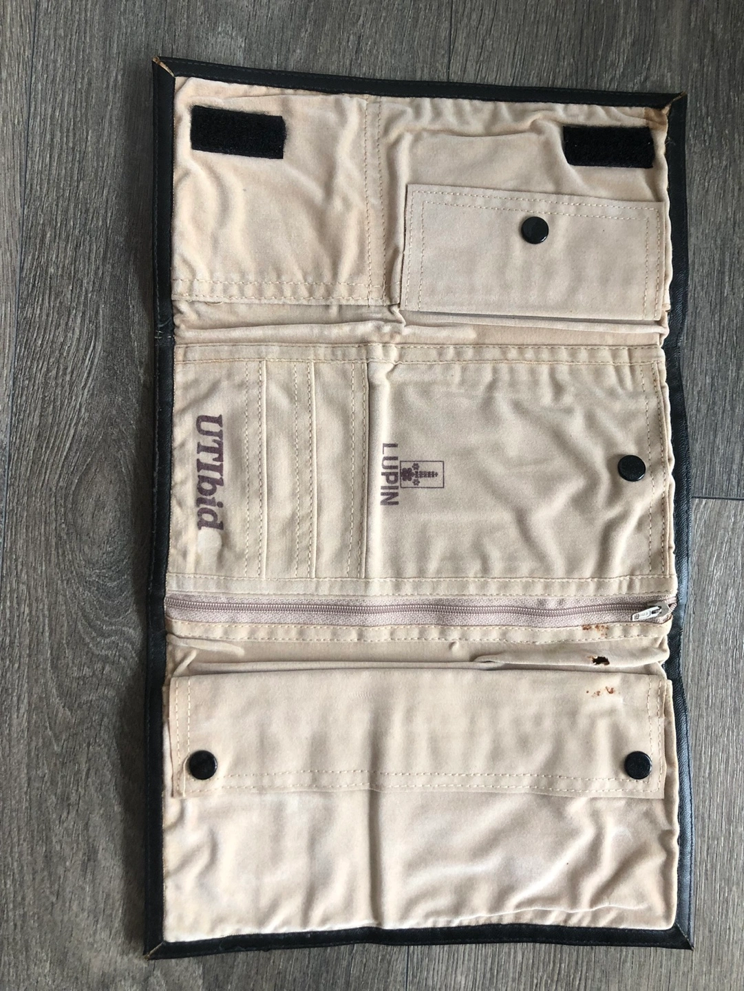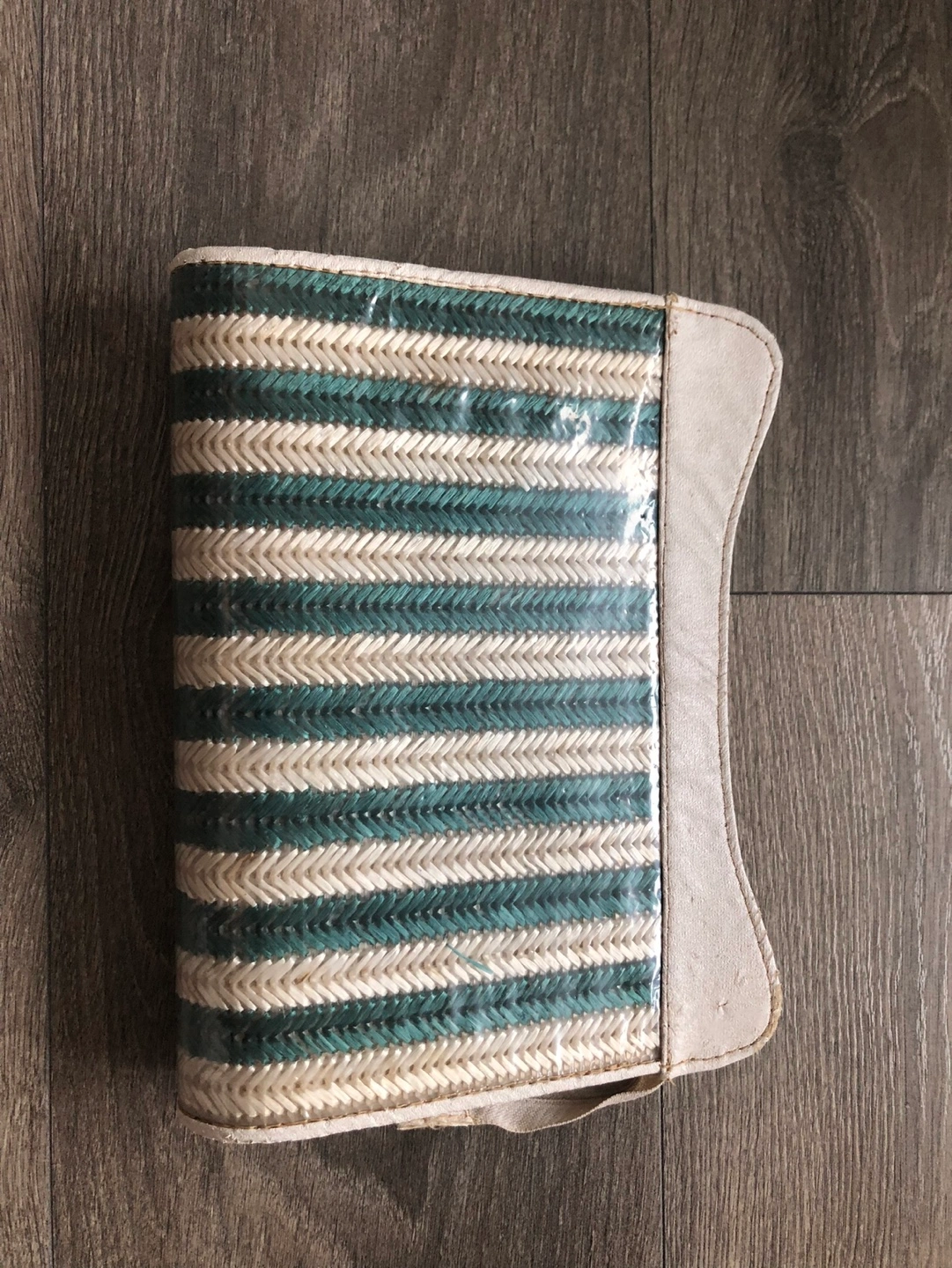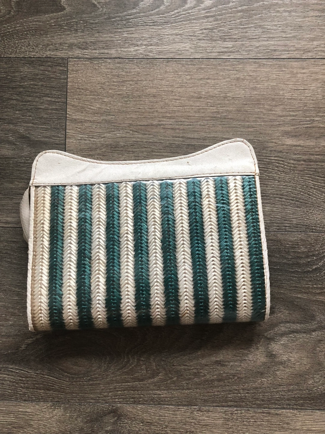 Black leather travel case and a green white striped pattern clutch. Includes a zippered pocket and snap closure.