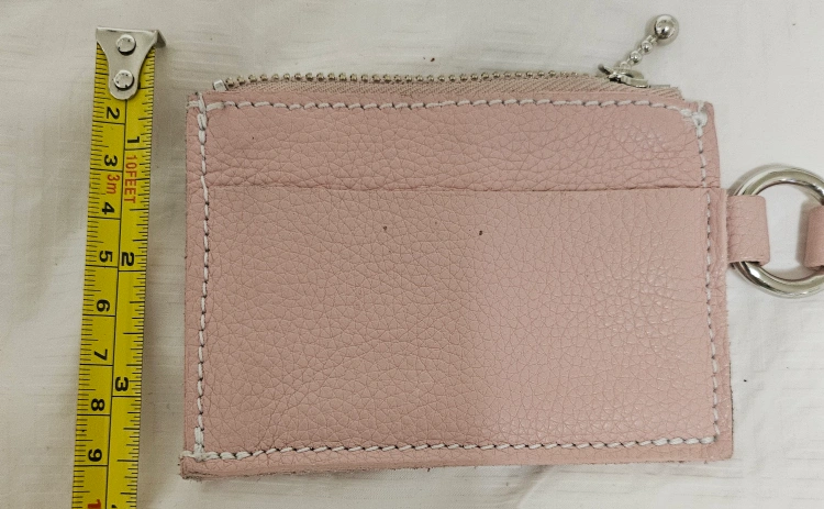 Small pink leather coin purse with zipper closure. Includes a ring and a clip on the top for attaching to a key chain.