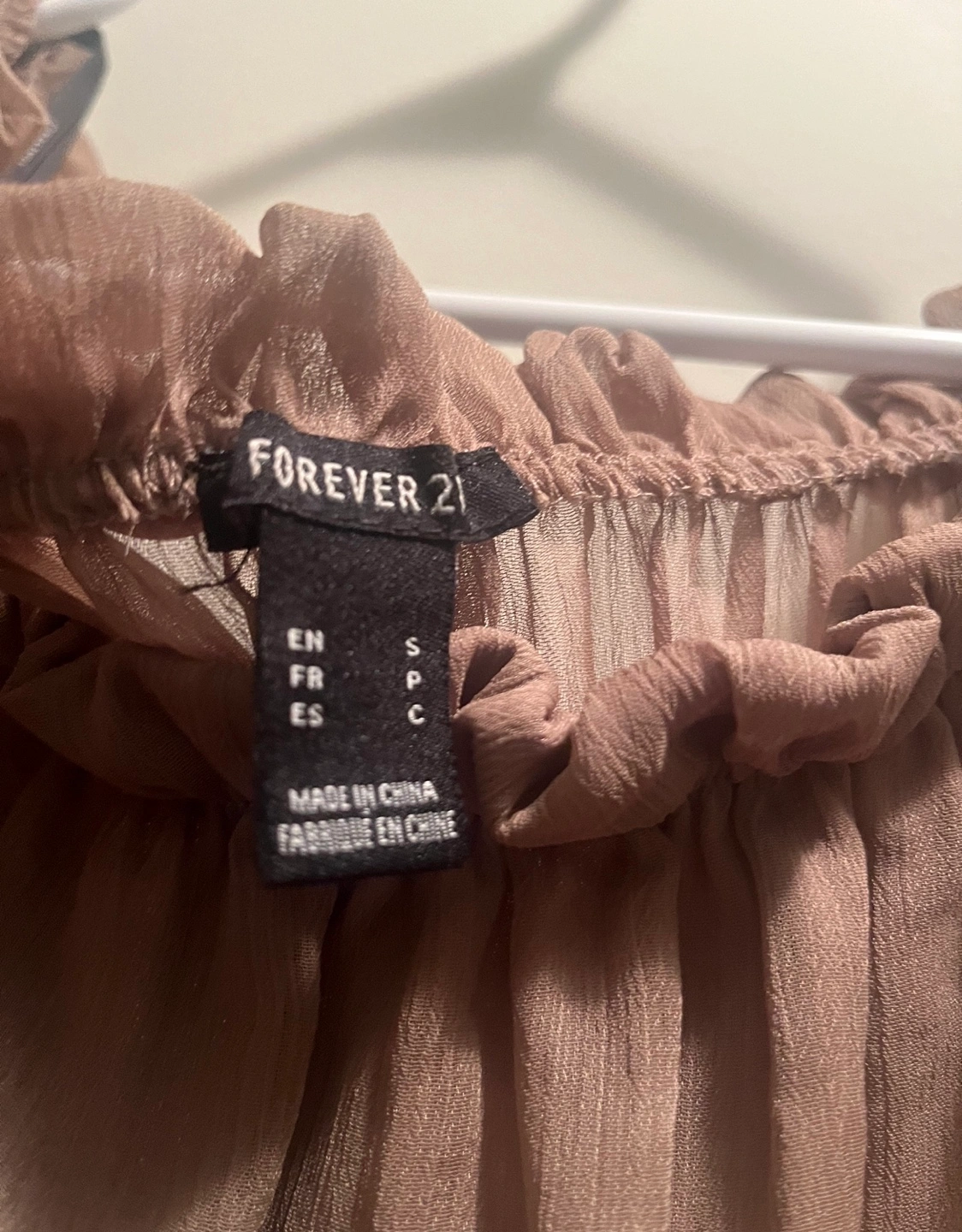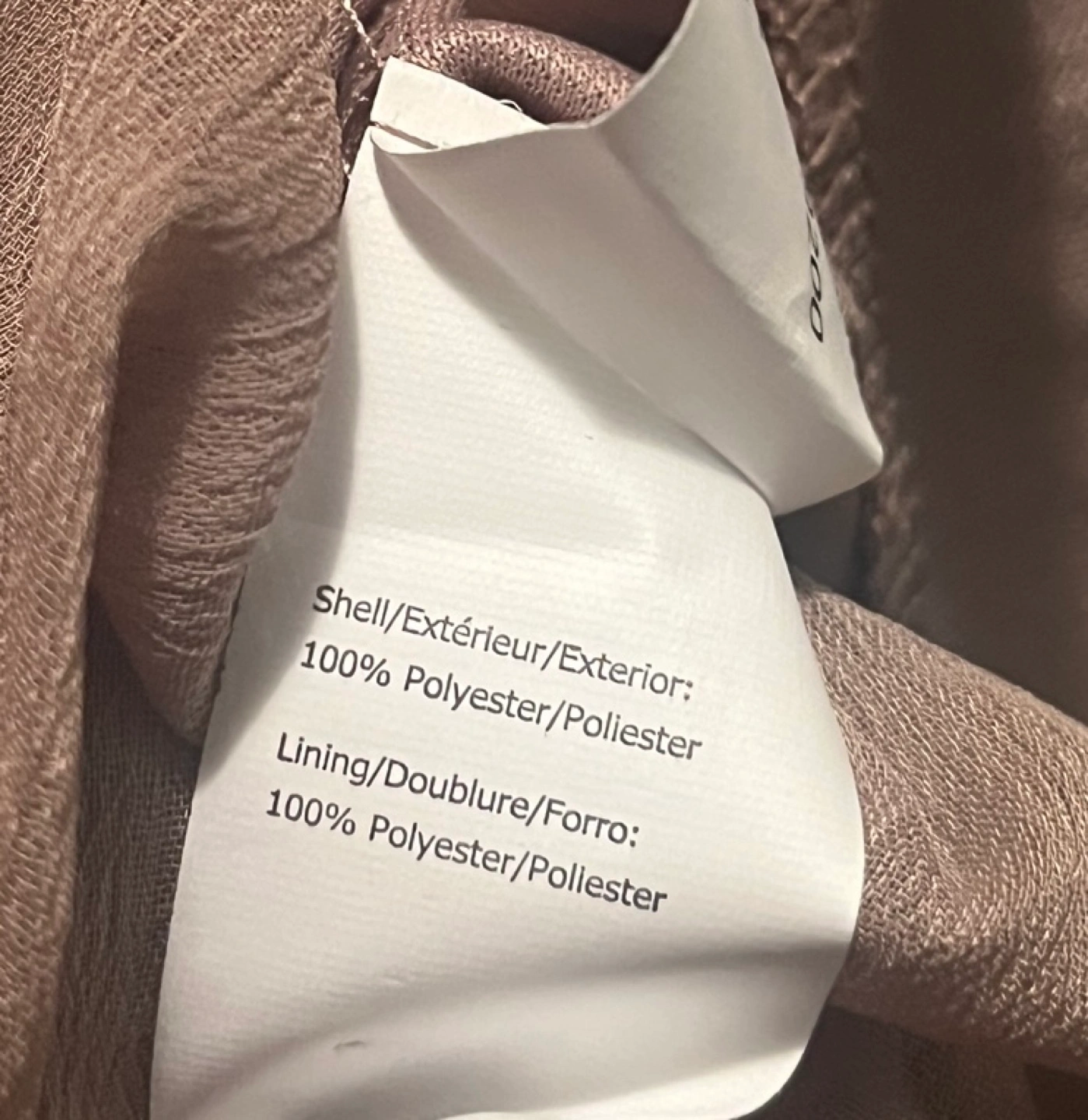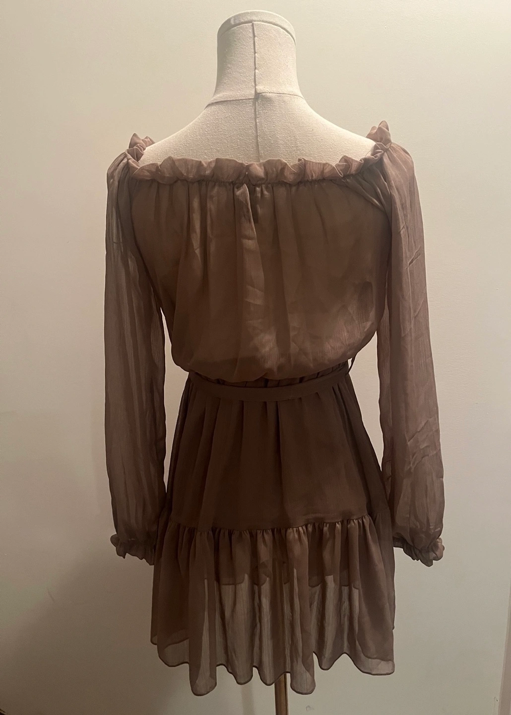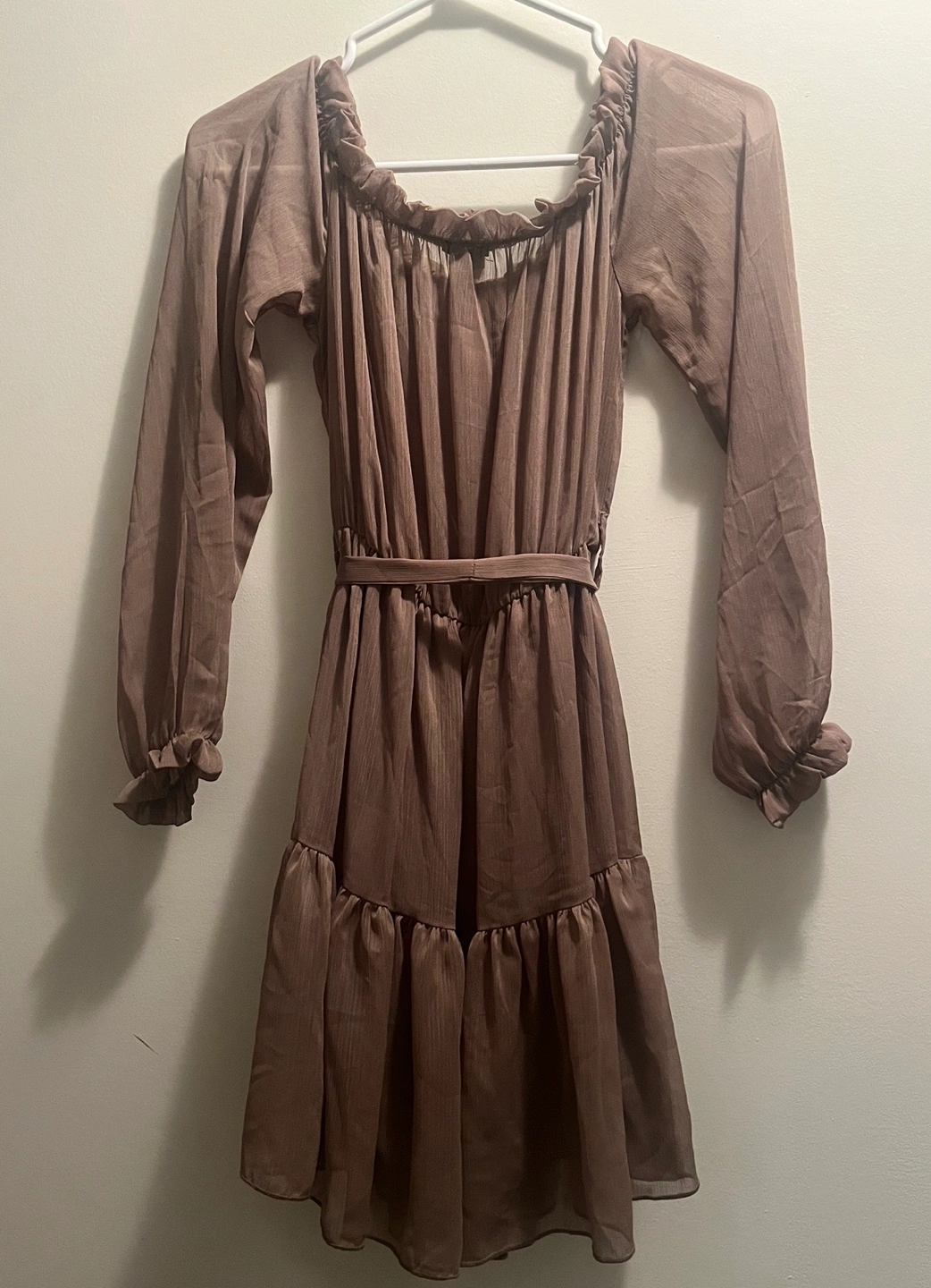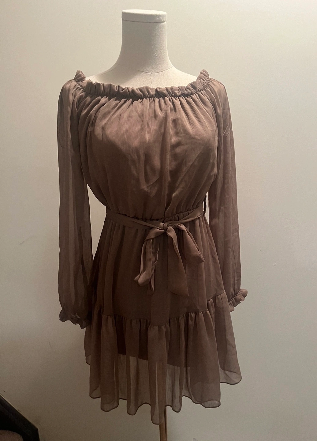 Brownish pink off the shoulder dress. Long sleeves with ruffles at the ends. Comes with a tie belt.
