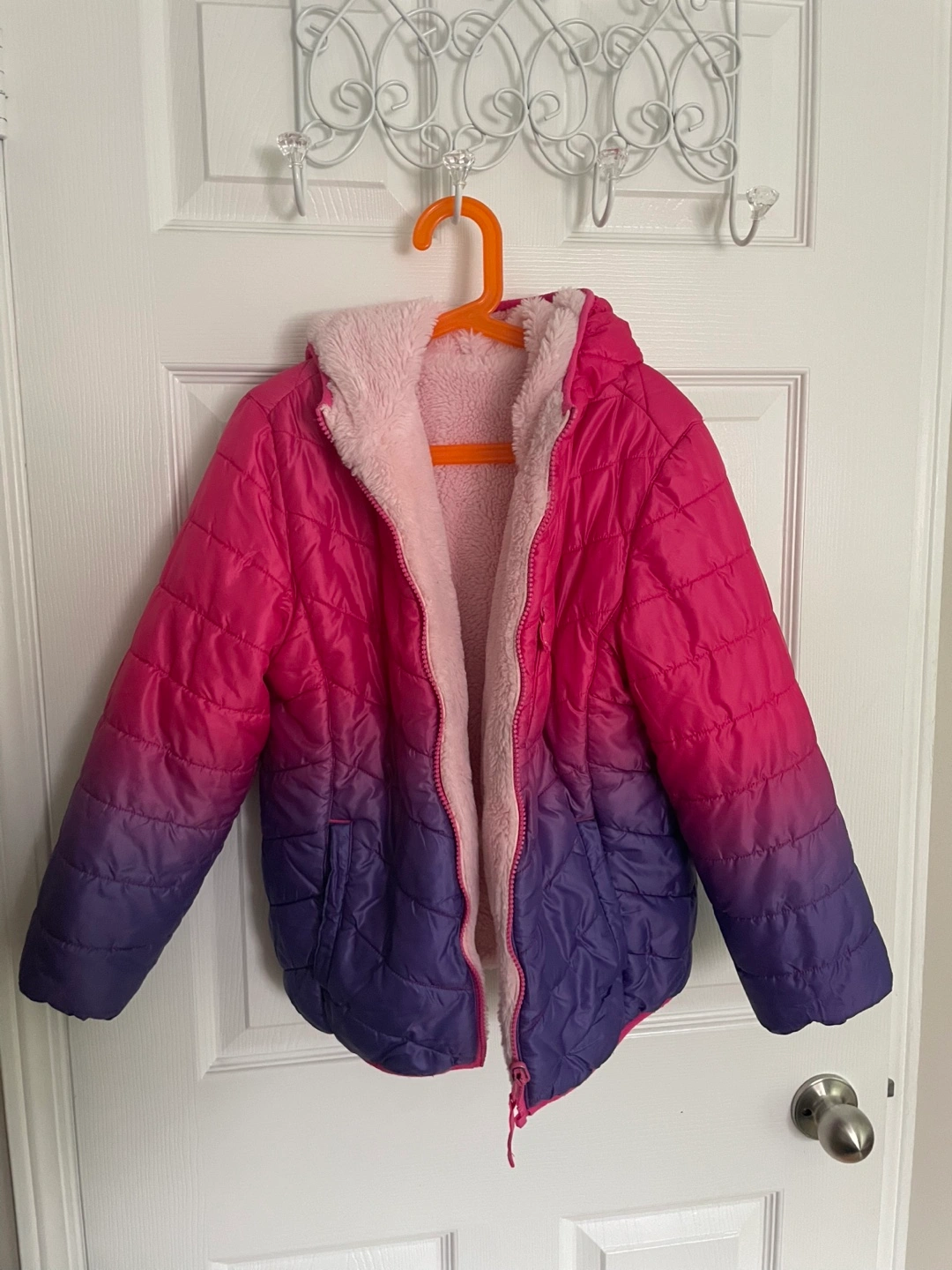 Reversible jacket, pink side is fleece, other side is pink and purple ombre. Has a hood. In great condition. Size L (10-12)