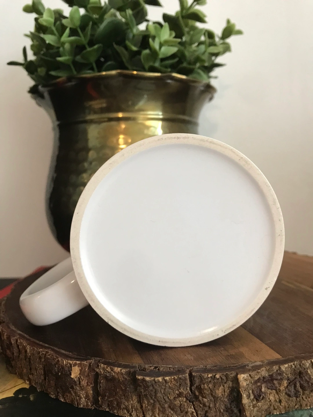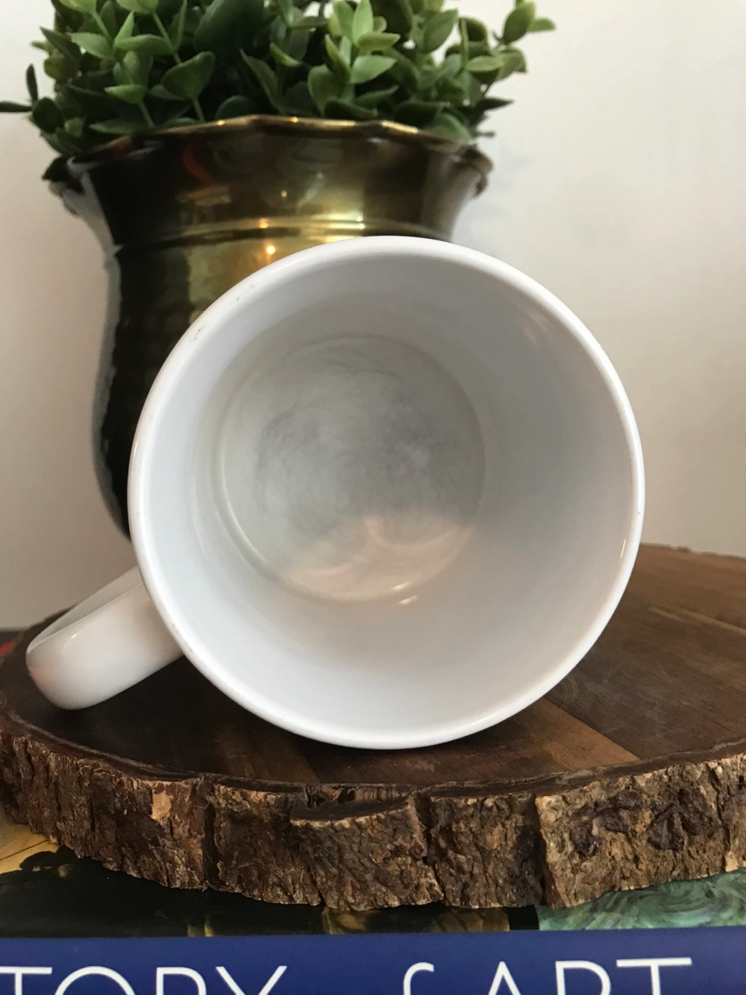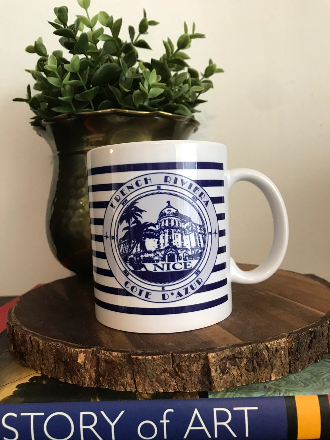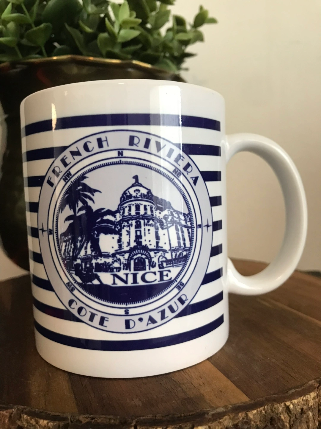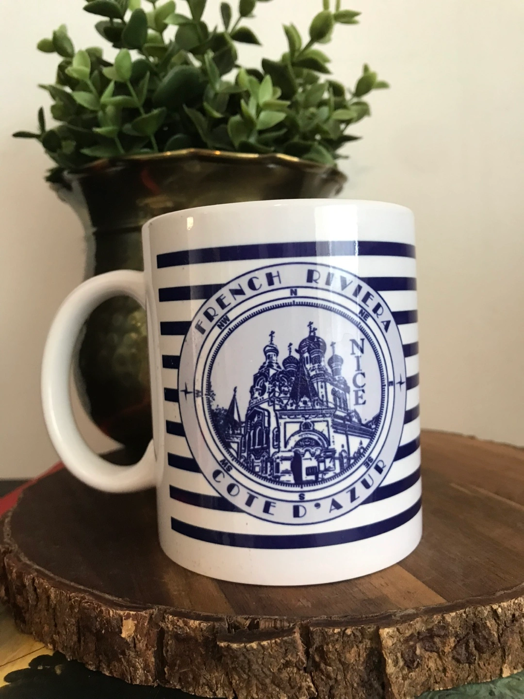 White ceramic mug with blue and white stripes and a design of a building in Nice, France. The design also includes the words "French Riviera", "Nice", and "Côte D'Azur".