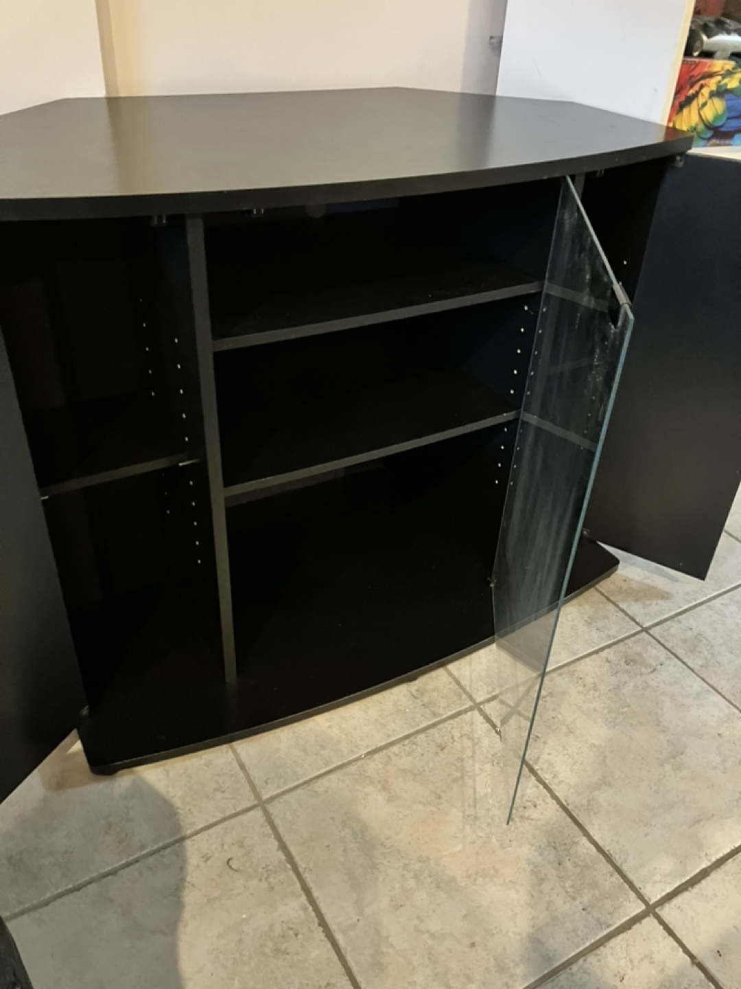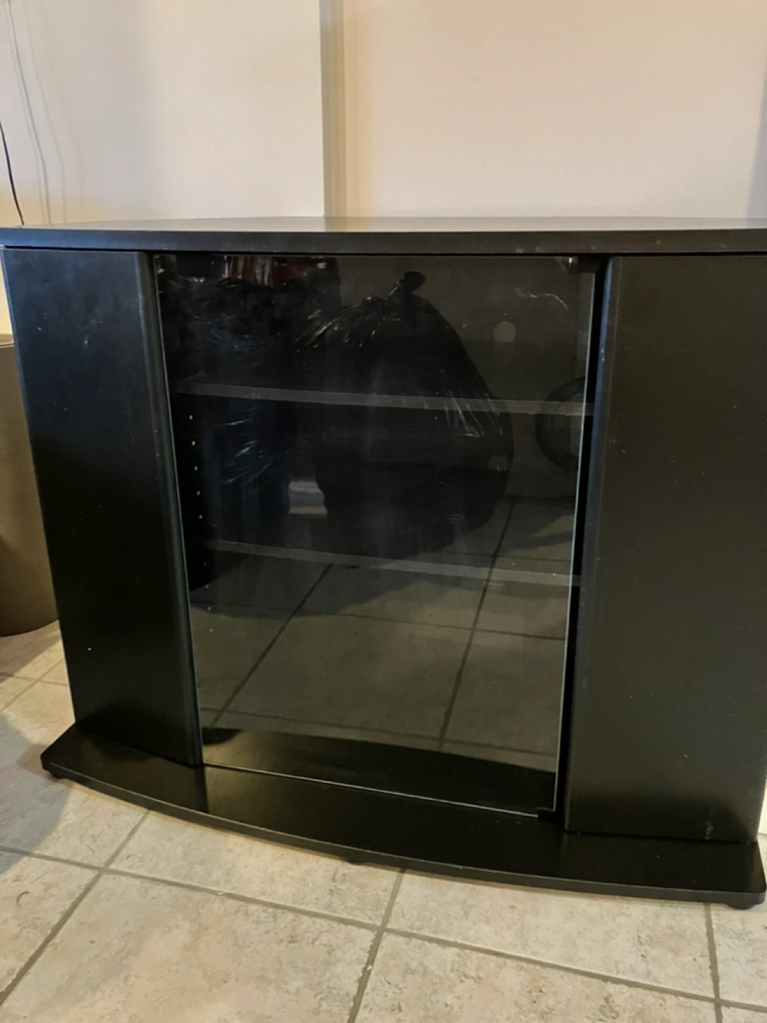 Black entertainment unit with glass doors. Two shelves. Curved front.