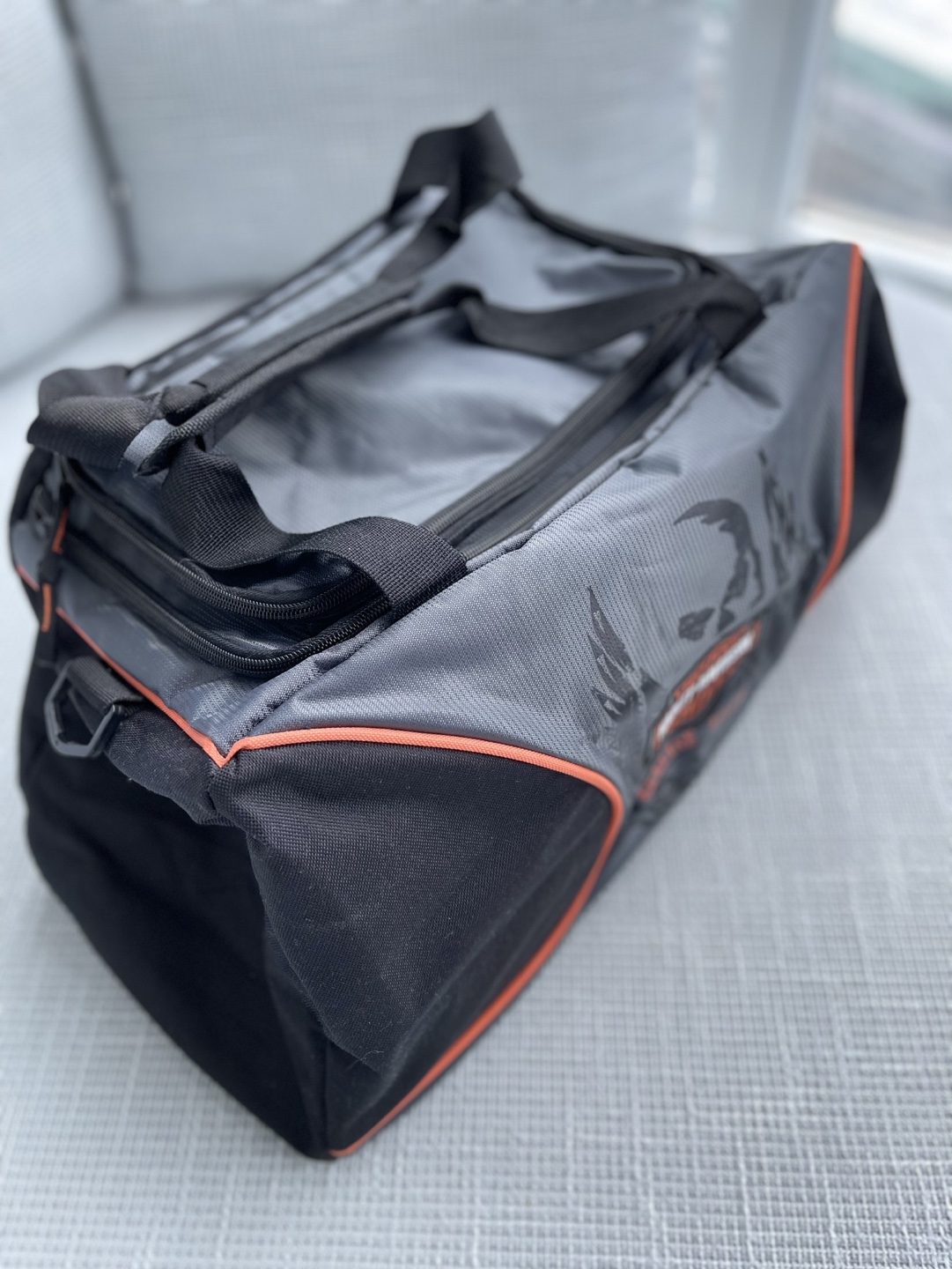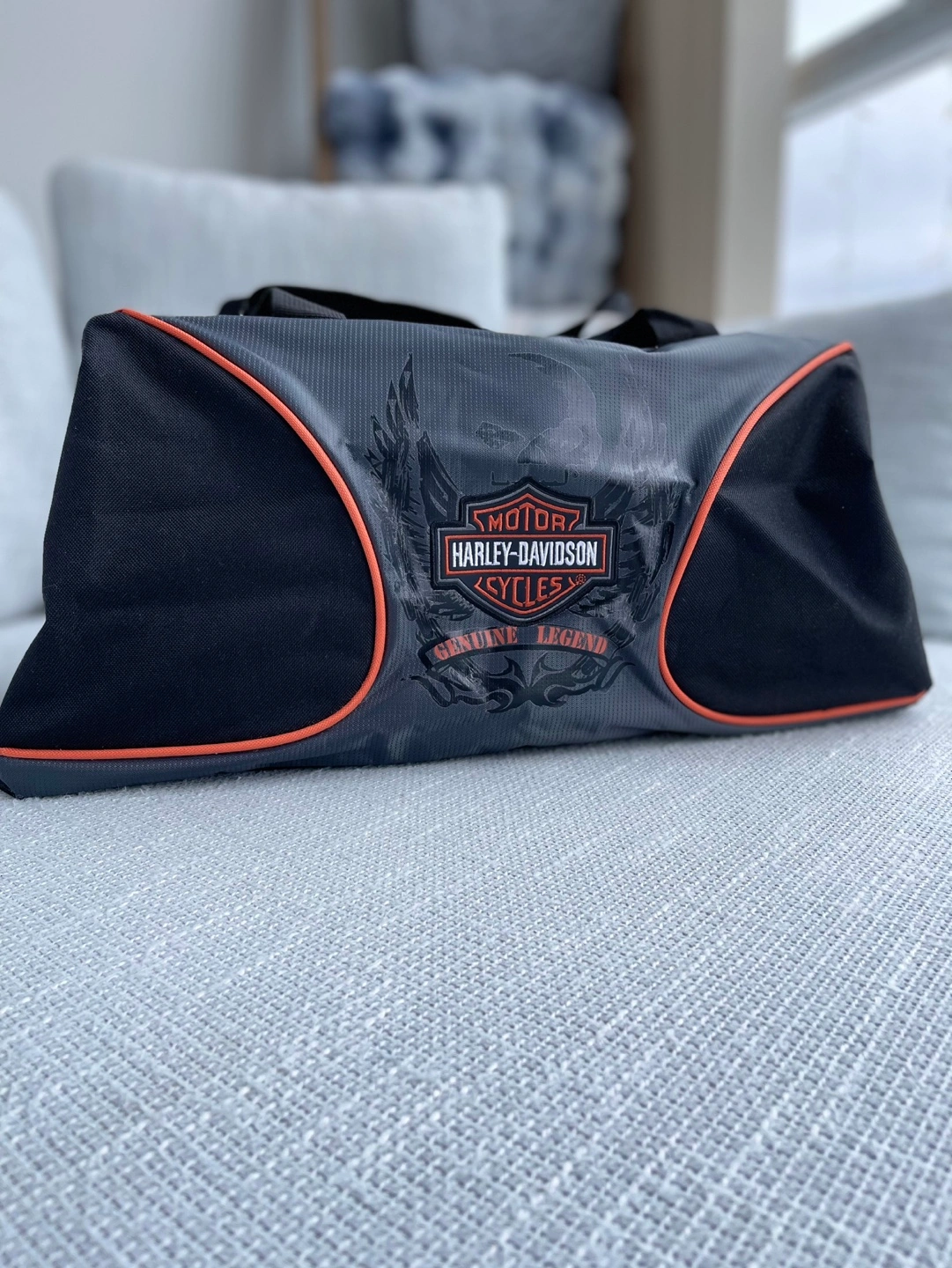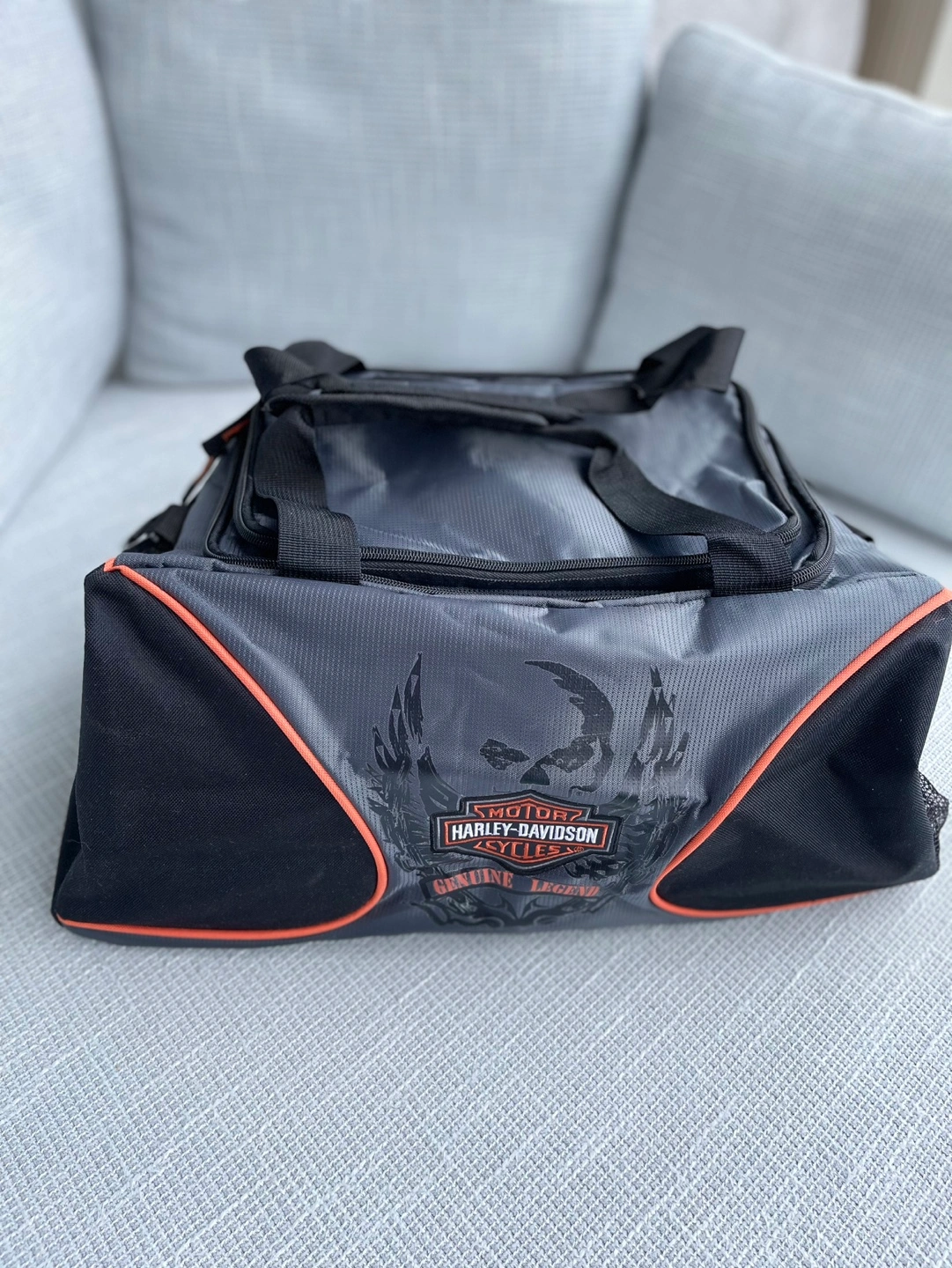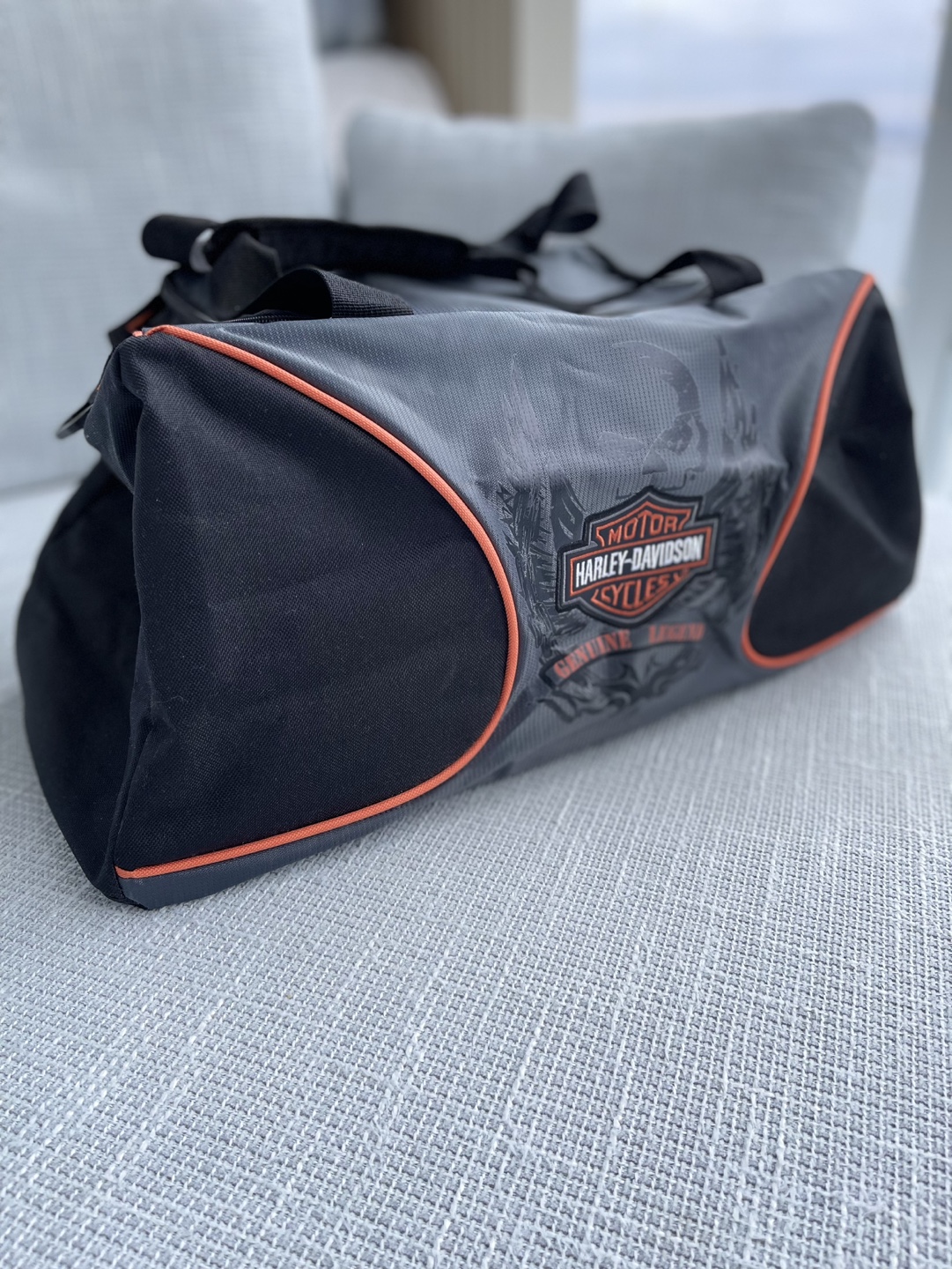Grey and black duffle bag with orange accents. Features a Harley Davidson logo. Has one large main compartment with an additional pocket on the top.
