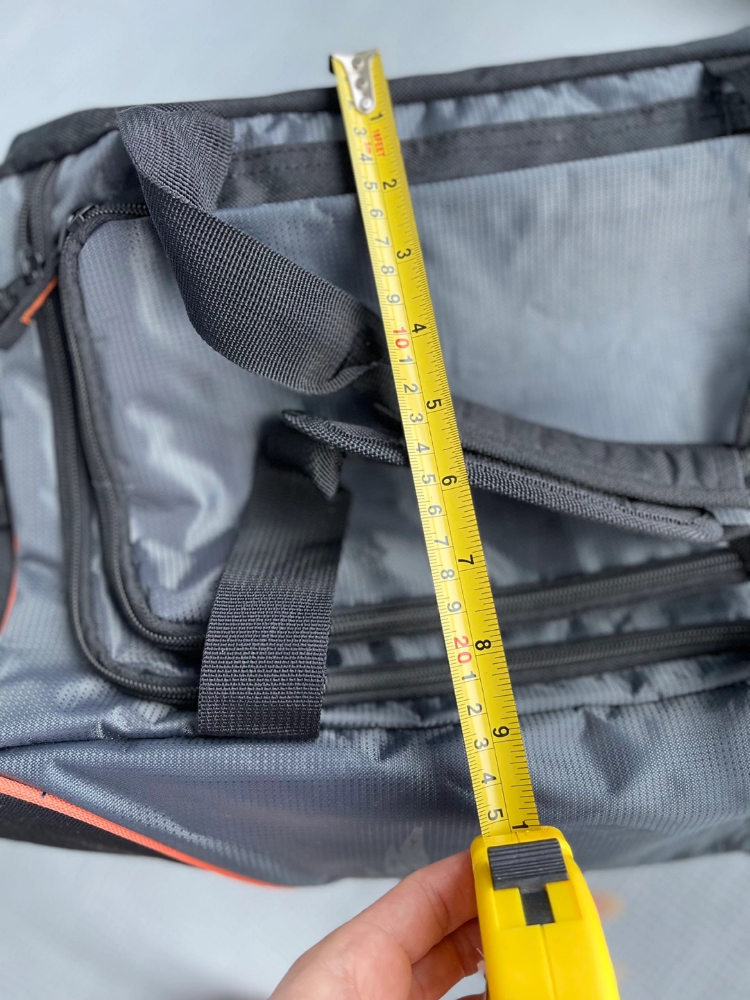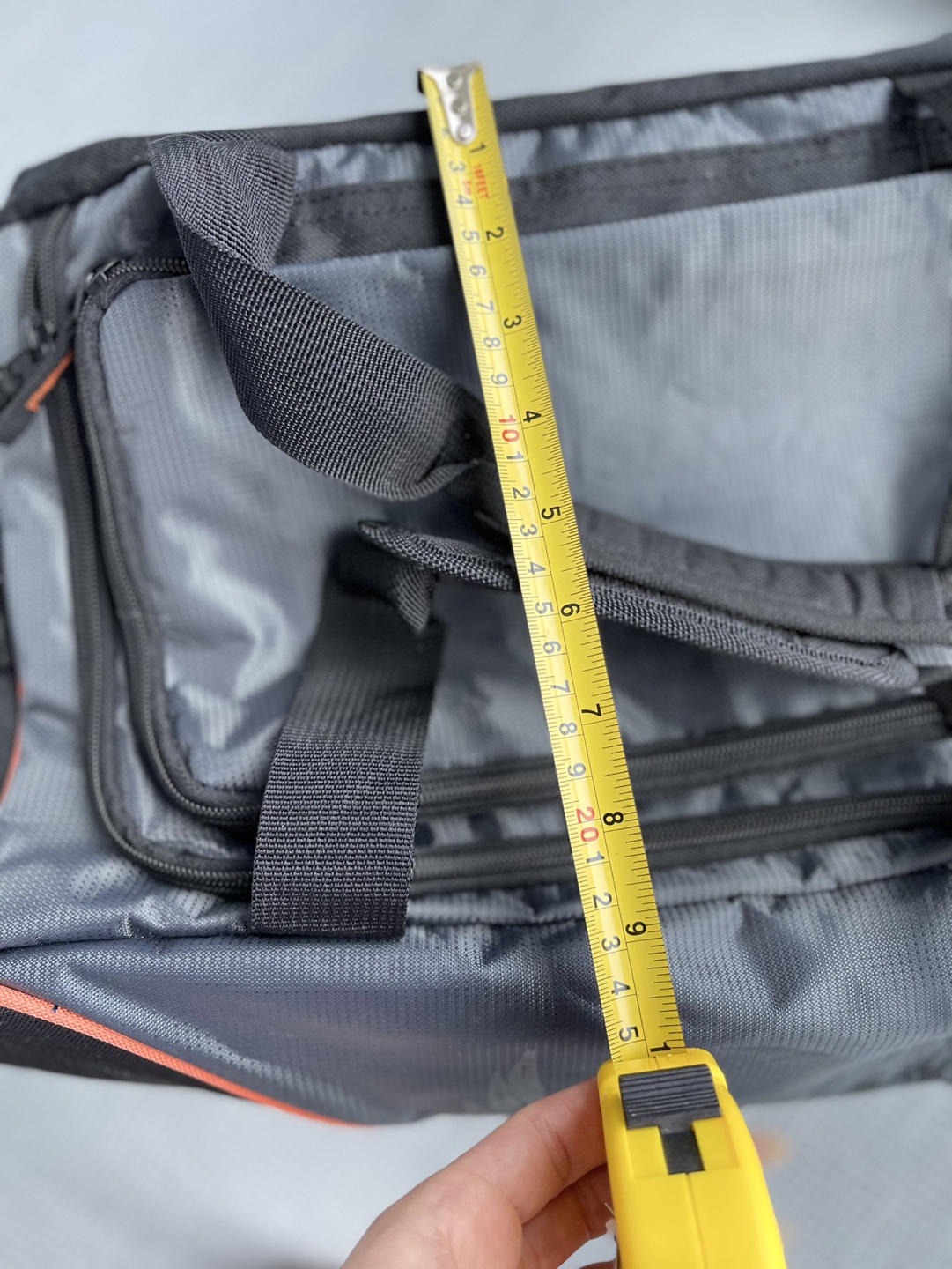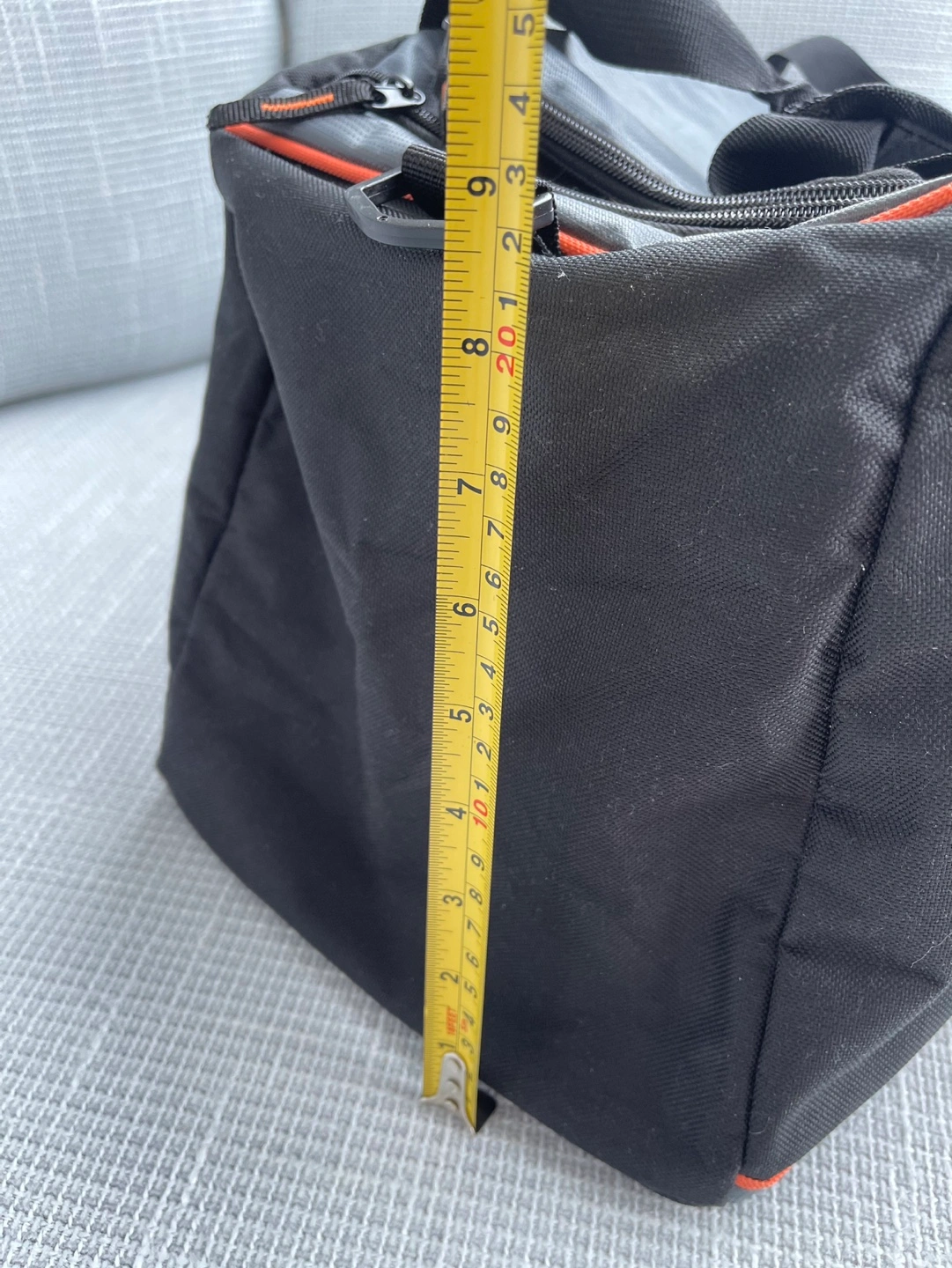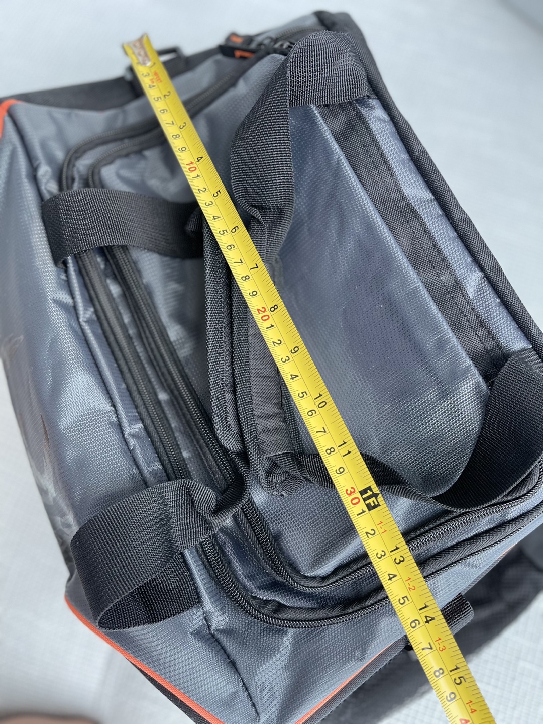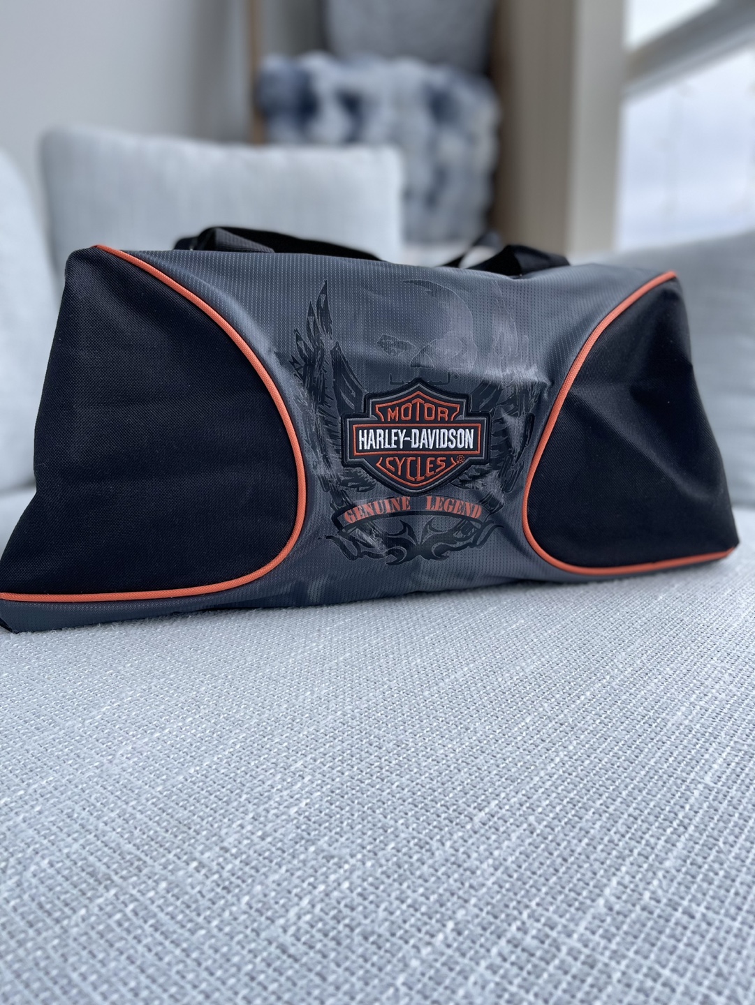 Grey and black duffle bag with orange accents. Features a Harley Davidson logo. Has one large main compartment with an additional pocket on the top.