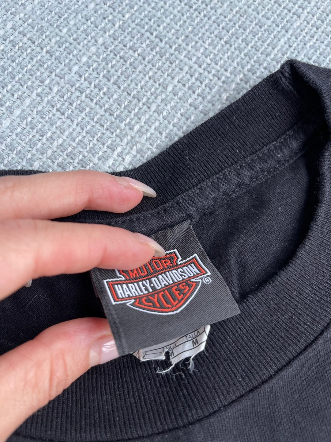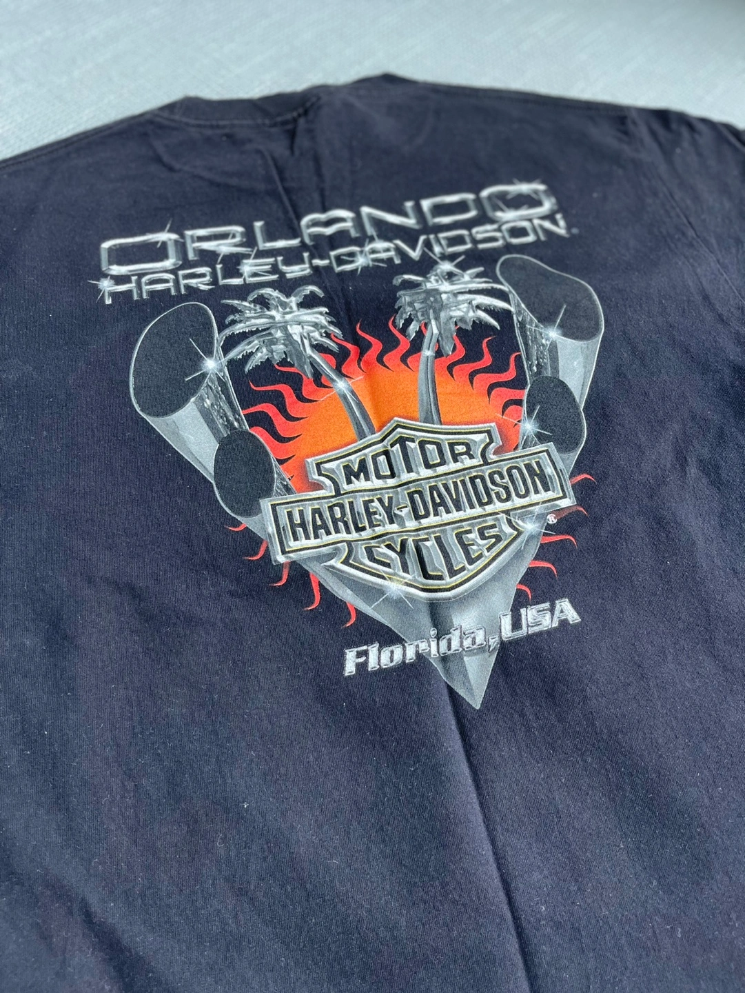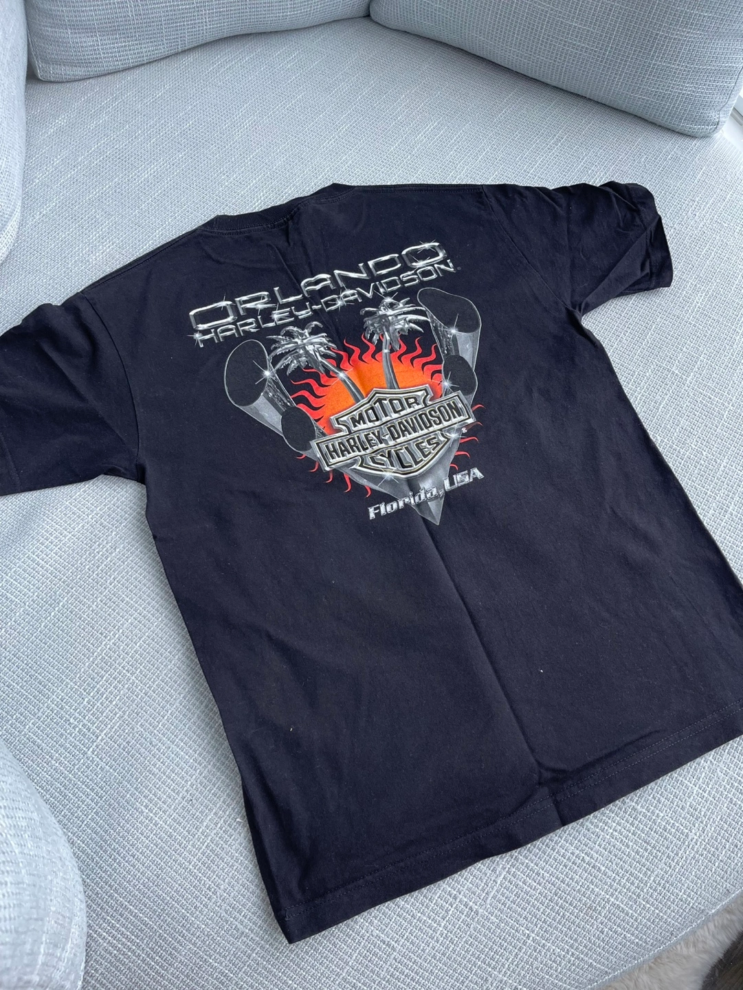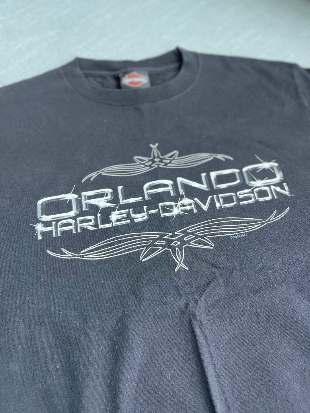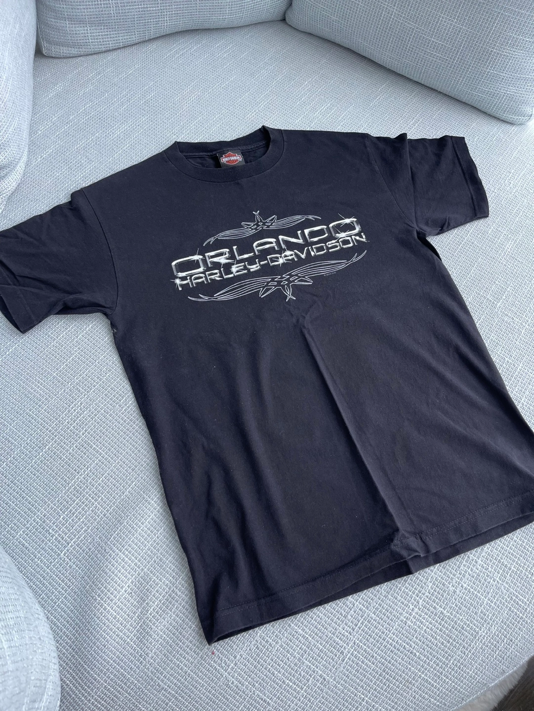 Black T-shirt with silver print. Features Orlando Harley Davidson logo on the front and back. Size M.