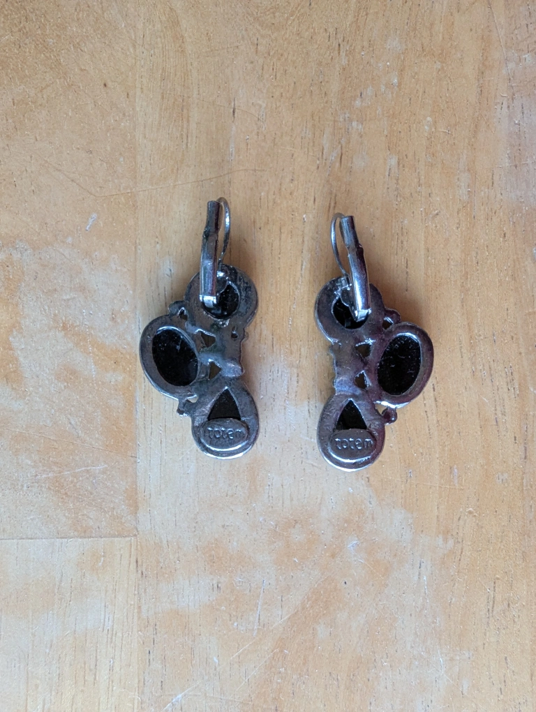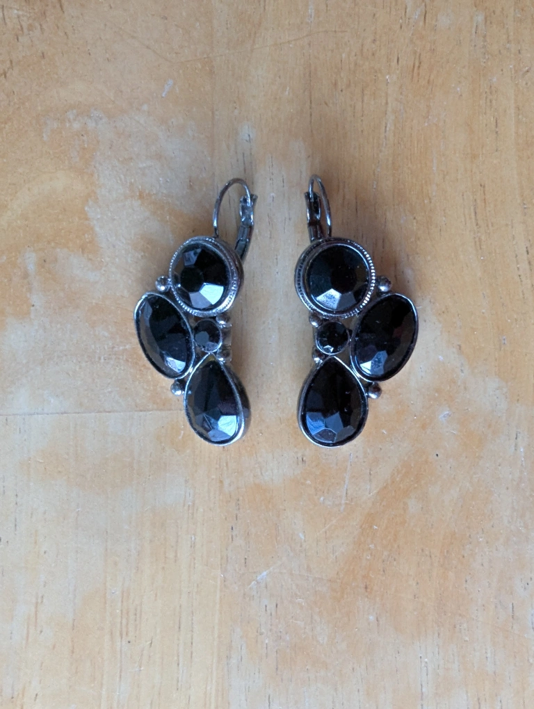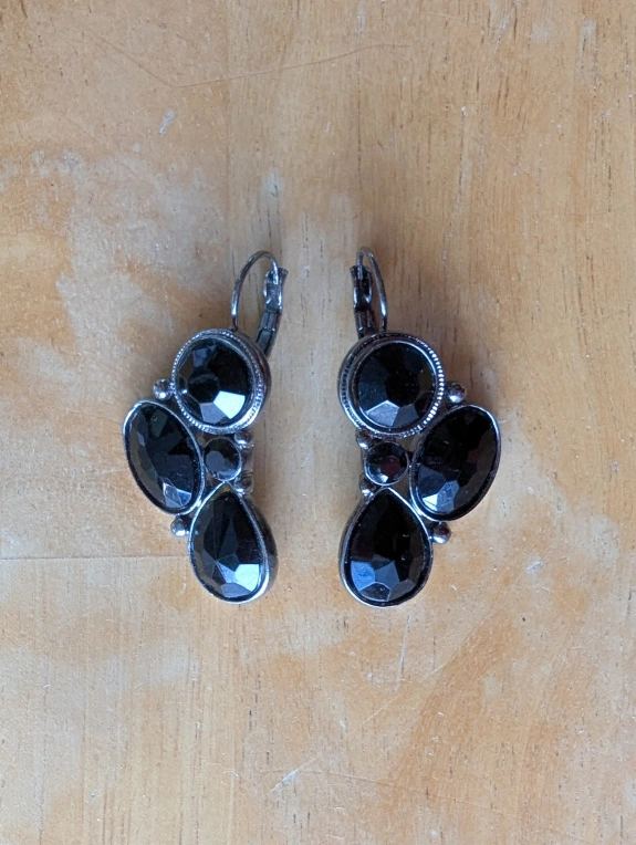 Black crystal statement earrings with silver toned metal accents. They have a leverback closure. Never worn.