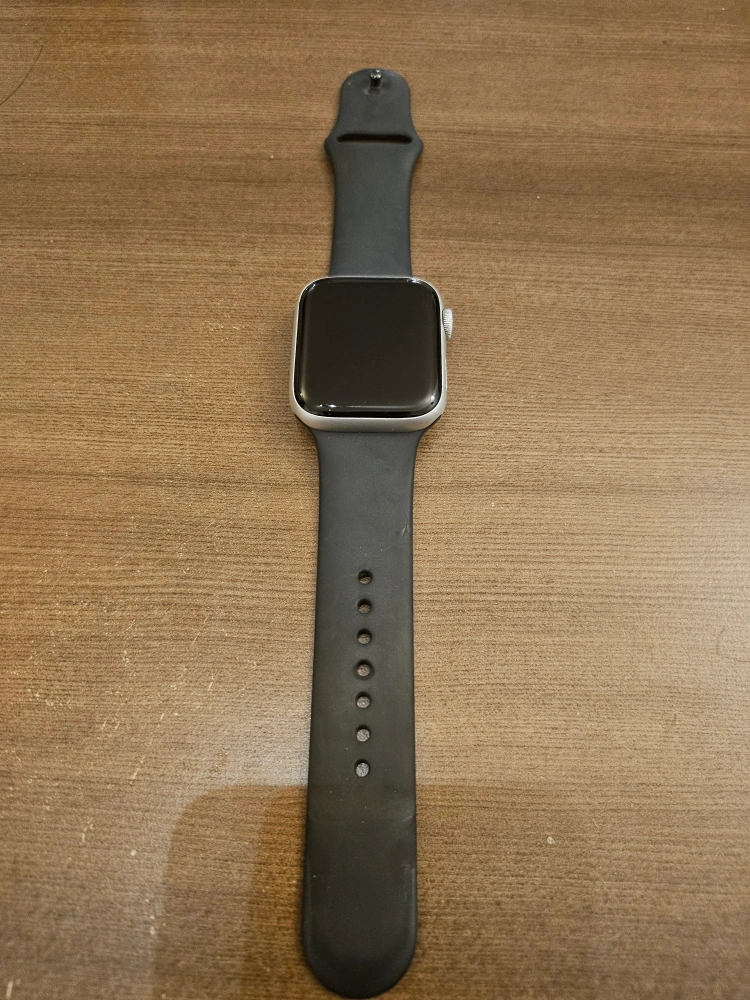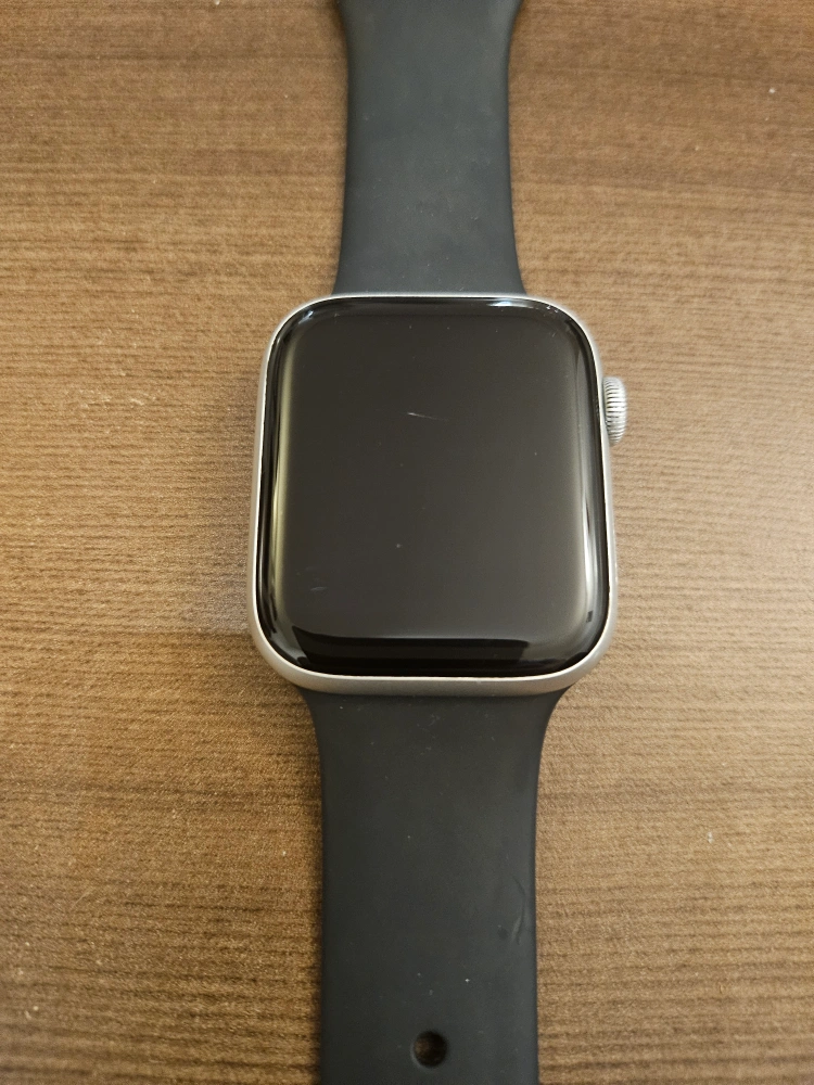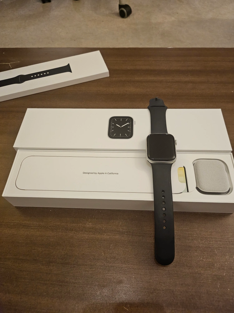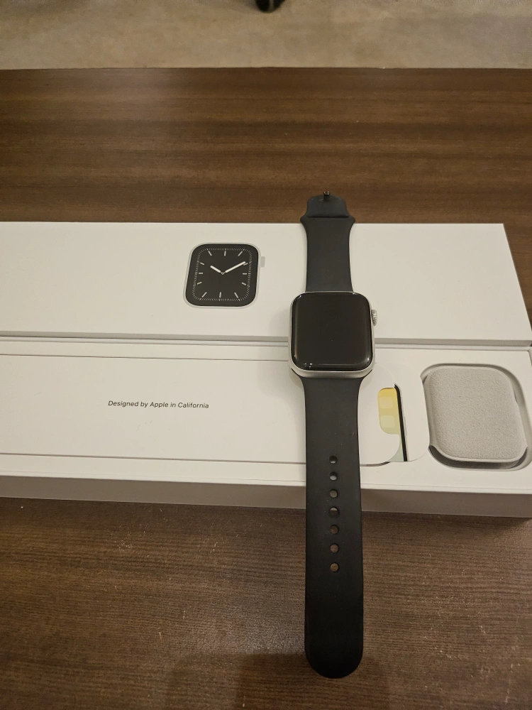 Apple Watch Series 5 in silver aluminum with a black sports band. Comes with original box and charging cable.