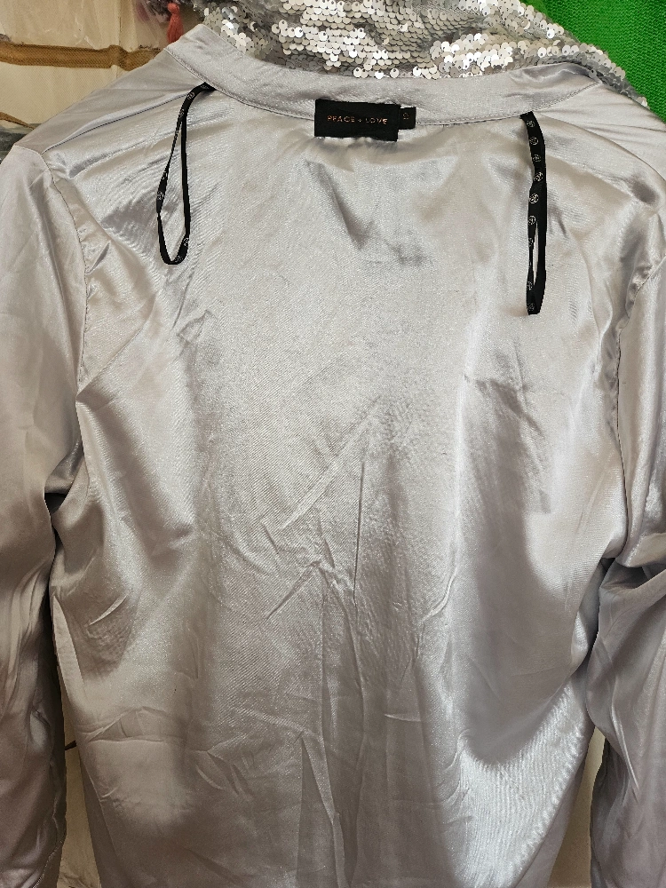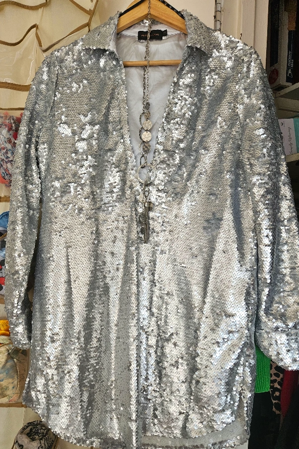 Long sleeve shirt covered in silver sequins. Zipper closure. Satin lining. long thigh length. attractive neck front.