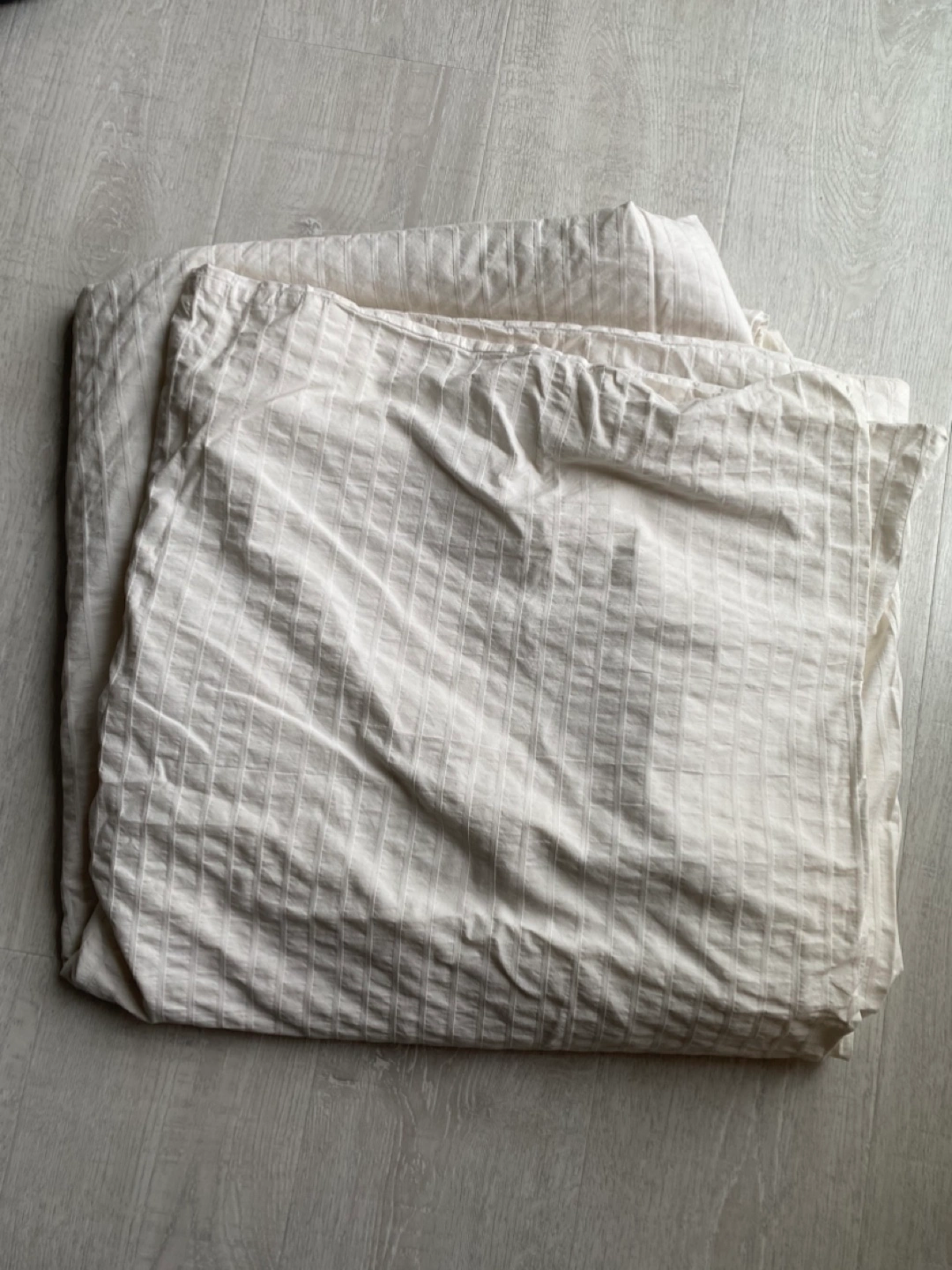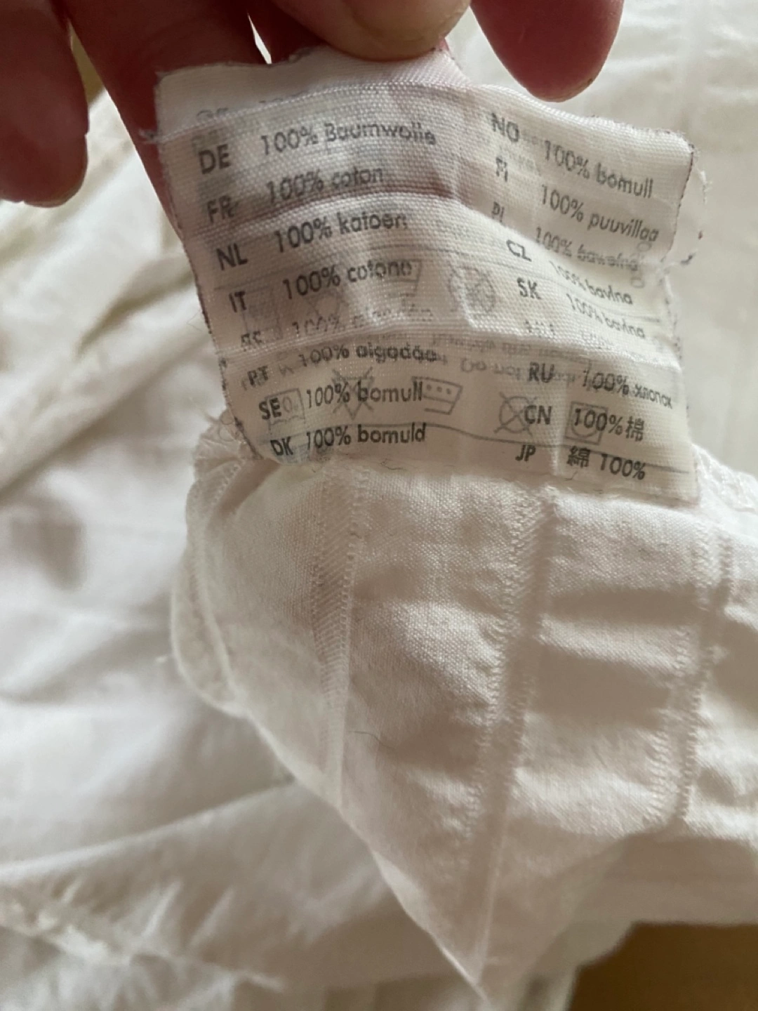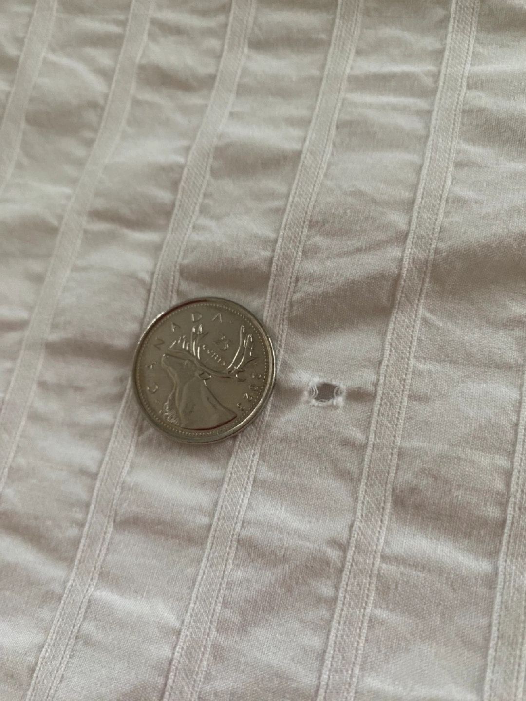 💯 cotton in white cross-weave pattern. One small hole as shown. Plastic snap closure.