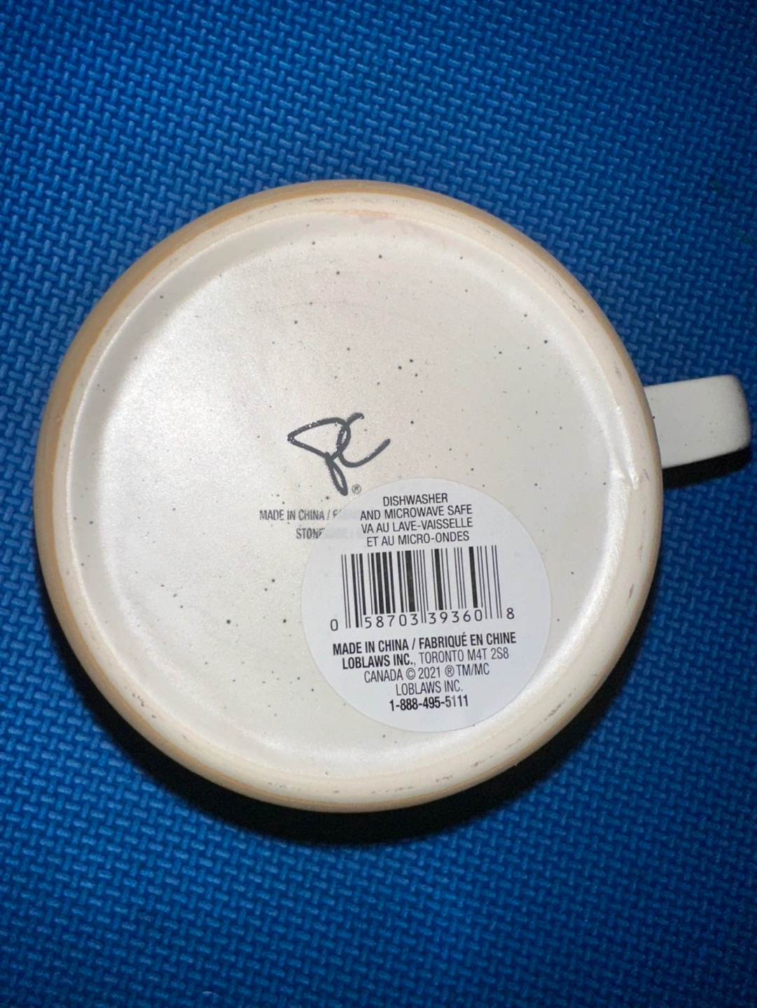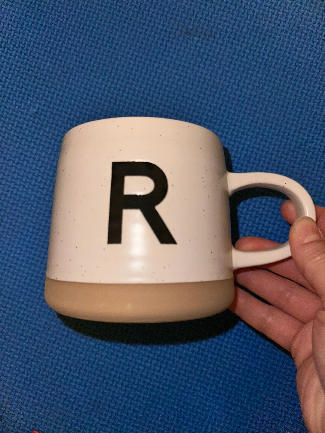 White mug with black letter R, speckled glaze, beige bottom. Microwave and dishwasher safe.