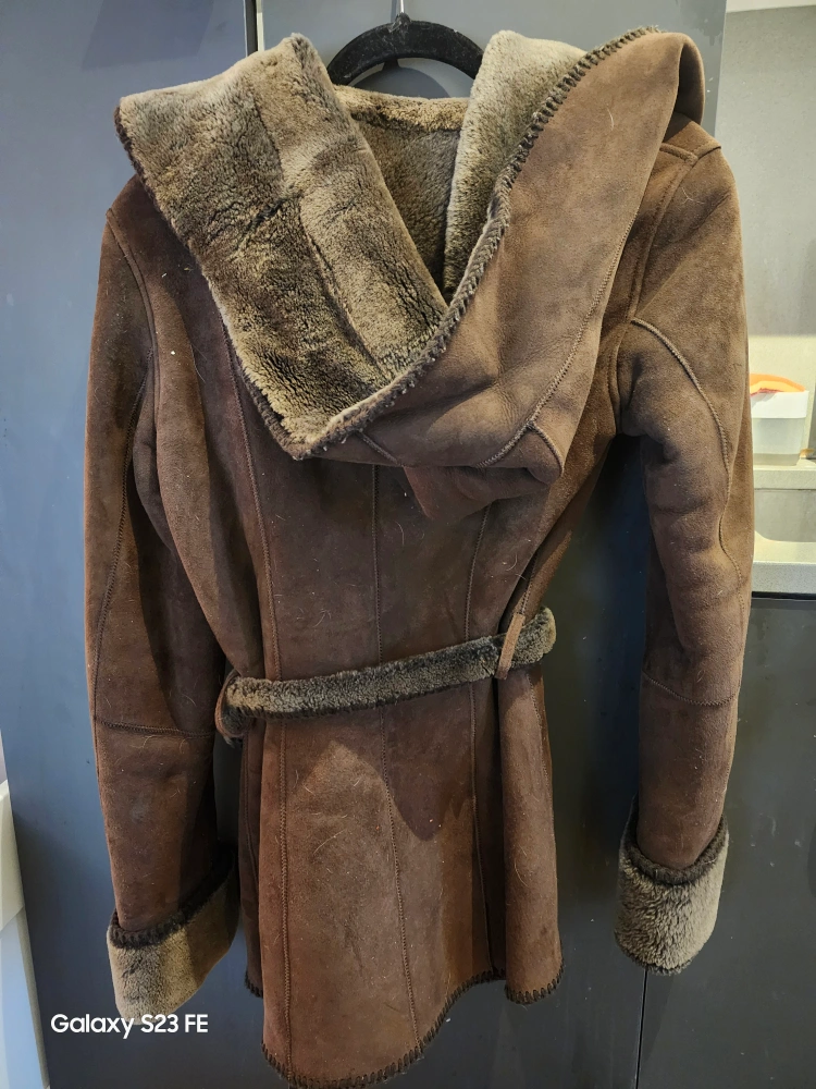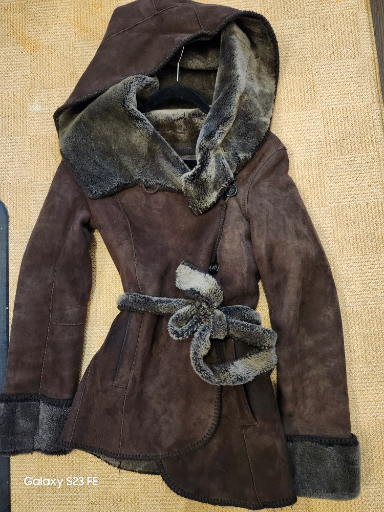 100%shearling in excellent condition. only worn a few times. Bought it for $2550 a while back. The style is unique and beautifully fitted. You will also love the hood. Its beautiful on