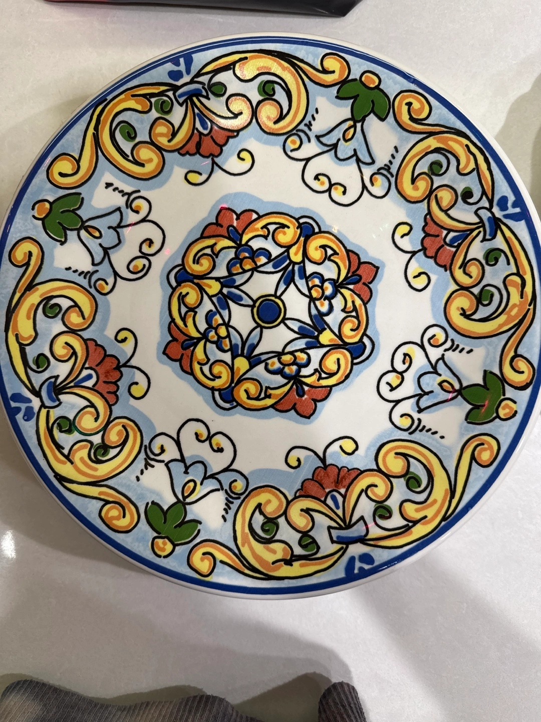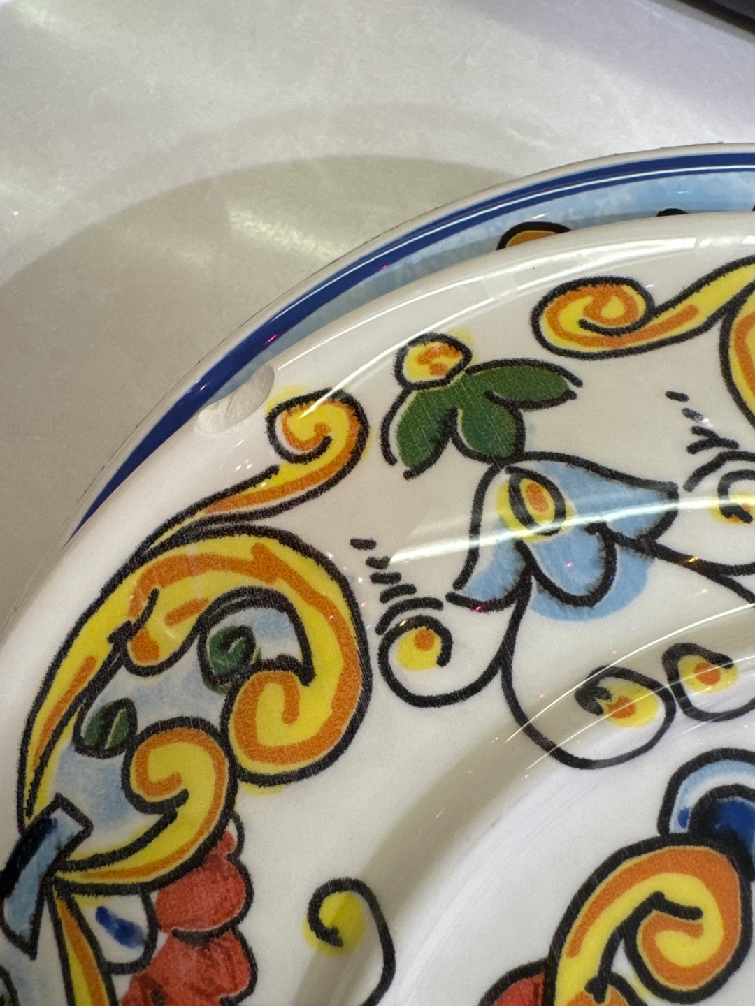 . Made in Italy , one was used only( that has a minor chip ) . Hand-painted ceramic plate with floral design. Dishwasher safe. Made in Italy, ( retail for 4 is $98 )