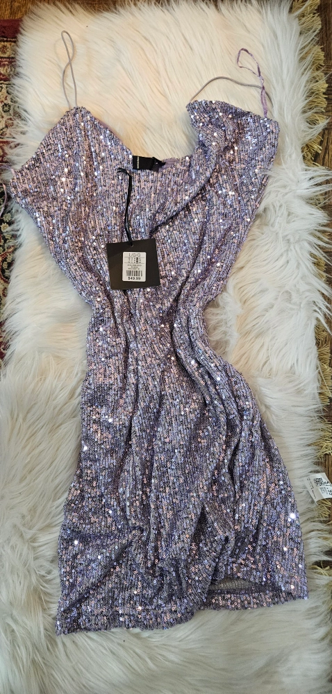 Sparkly bodycon Lilac dress w/spaghetti straps, V-neck and wrap style.