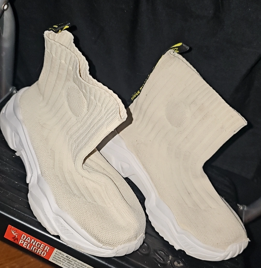 White knit booties with a chunky white platform sole. Sock-like construction.