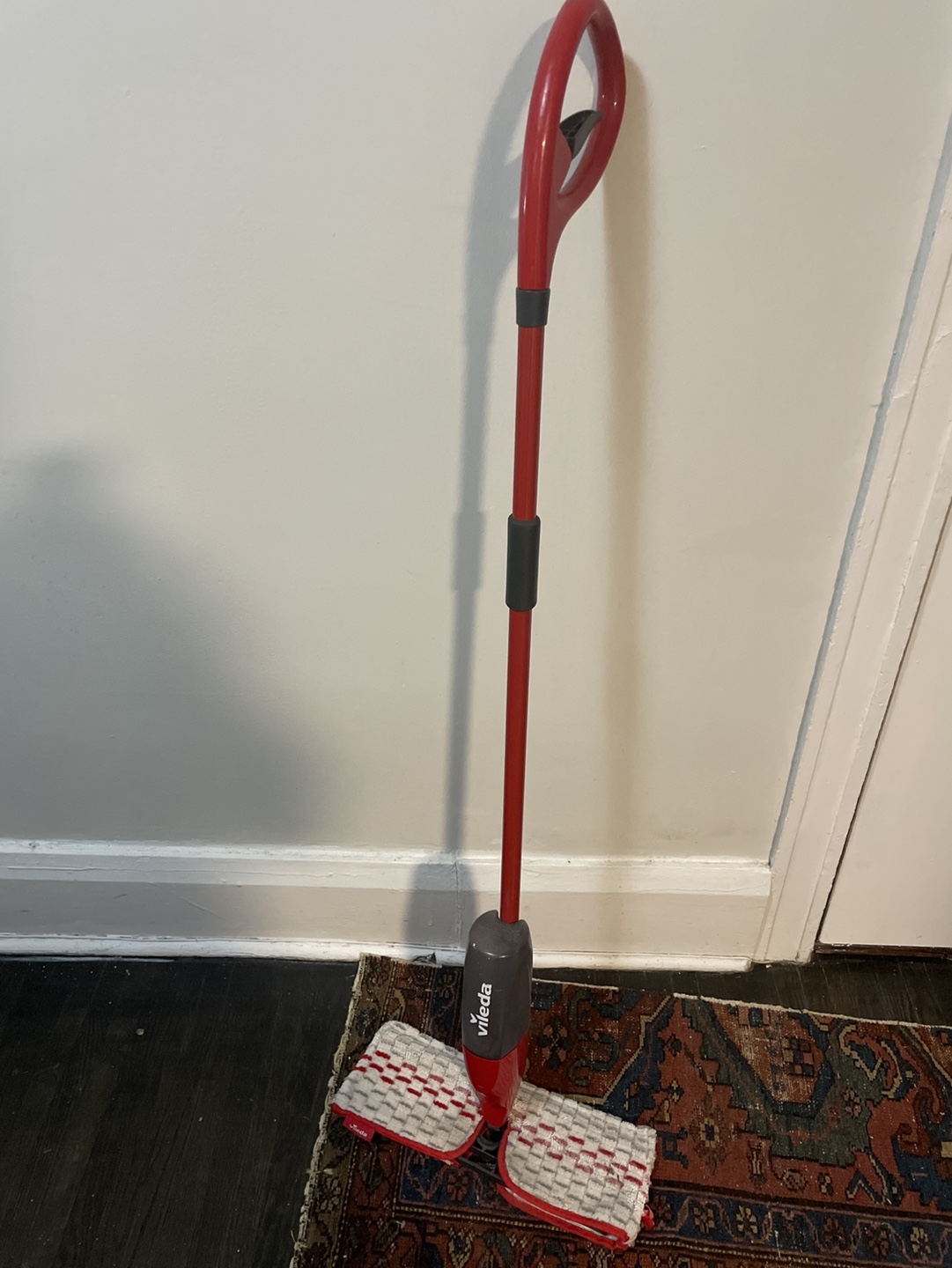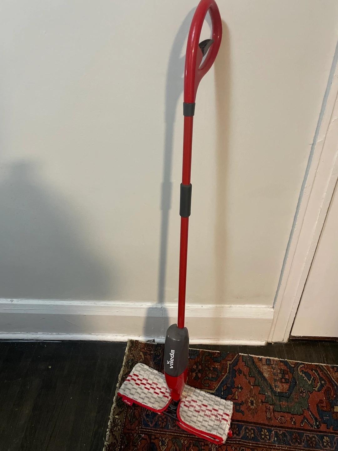 Red spray mop with a cleaning pad. The handle is adjustable.