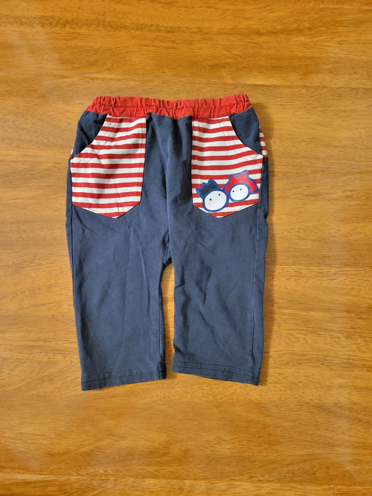 Blue pants with red and white stripes, elastic waistband. It has a red pocket on the front with a cartoon design.