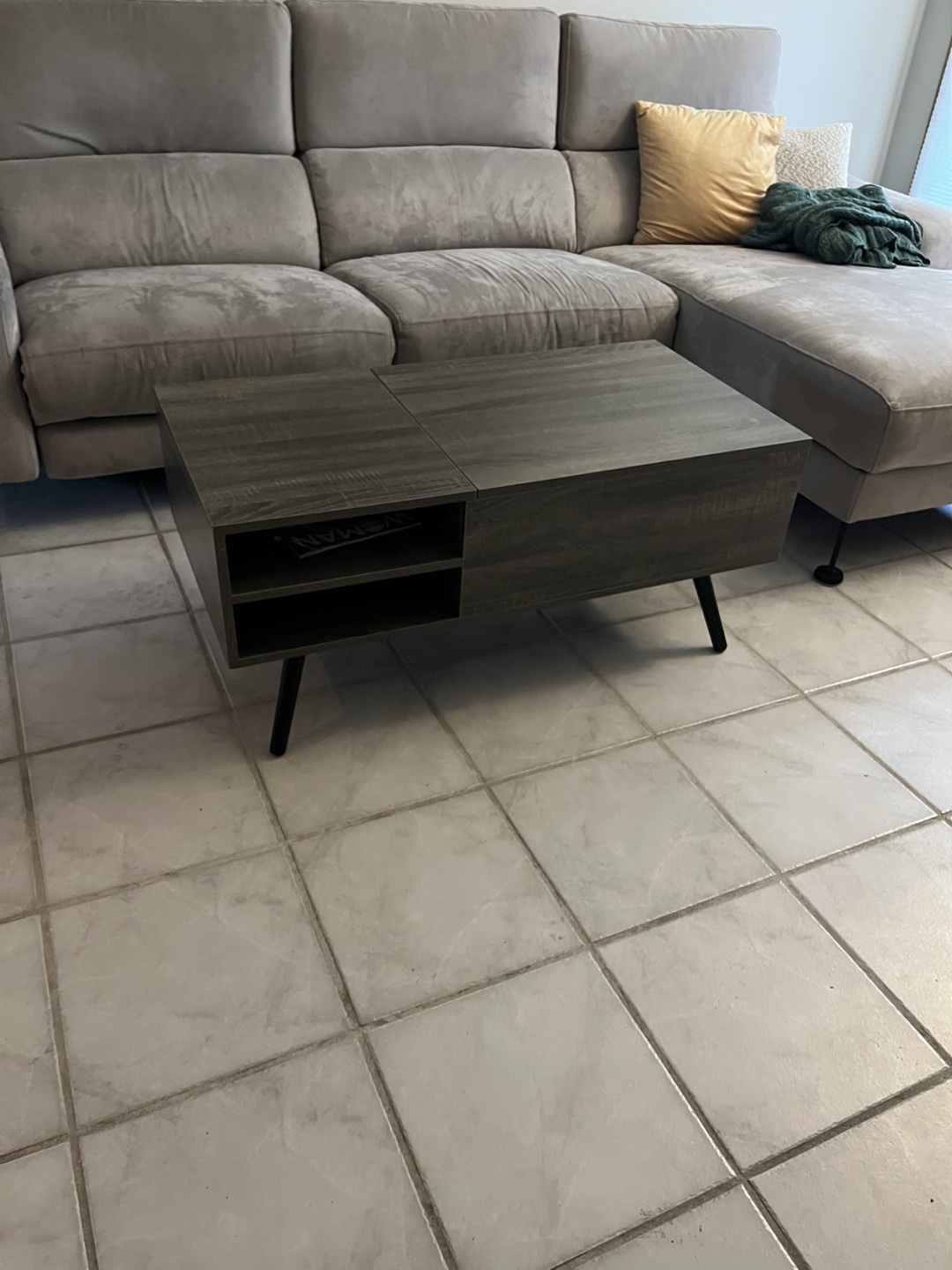 Lift top coffee table with storage shelves. Black legs. Gray wood finish. Good condition. Pick-up only.