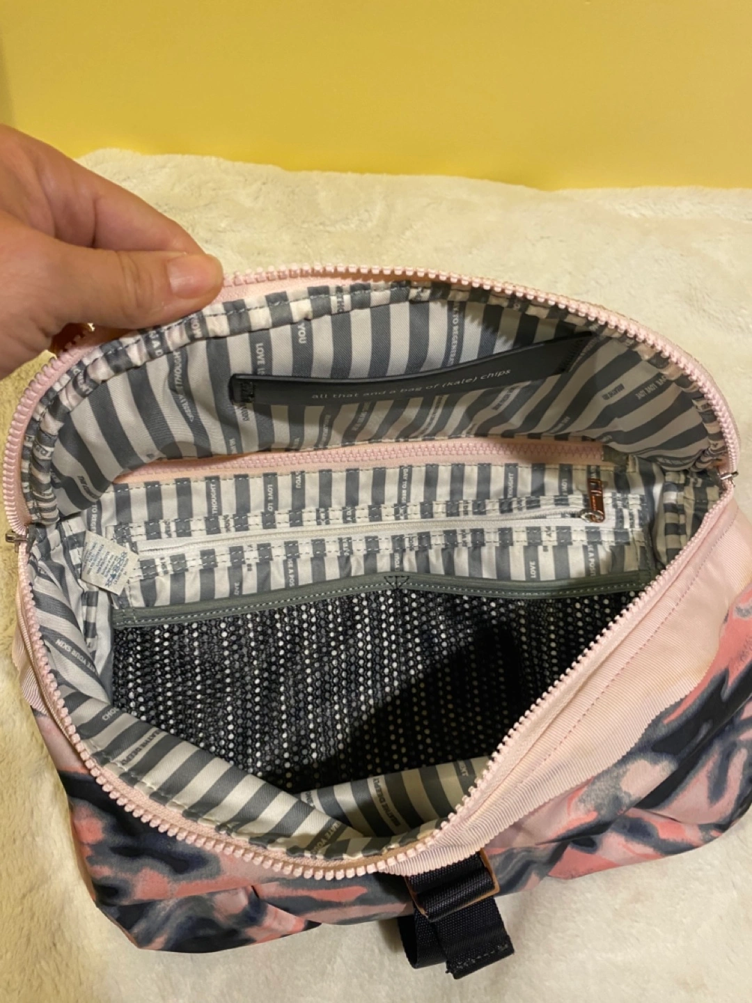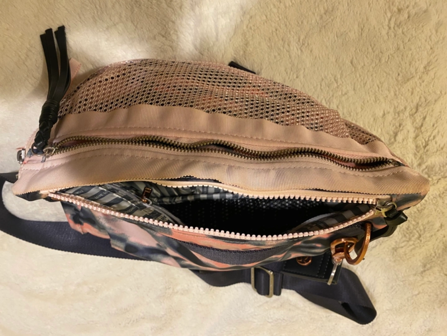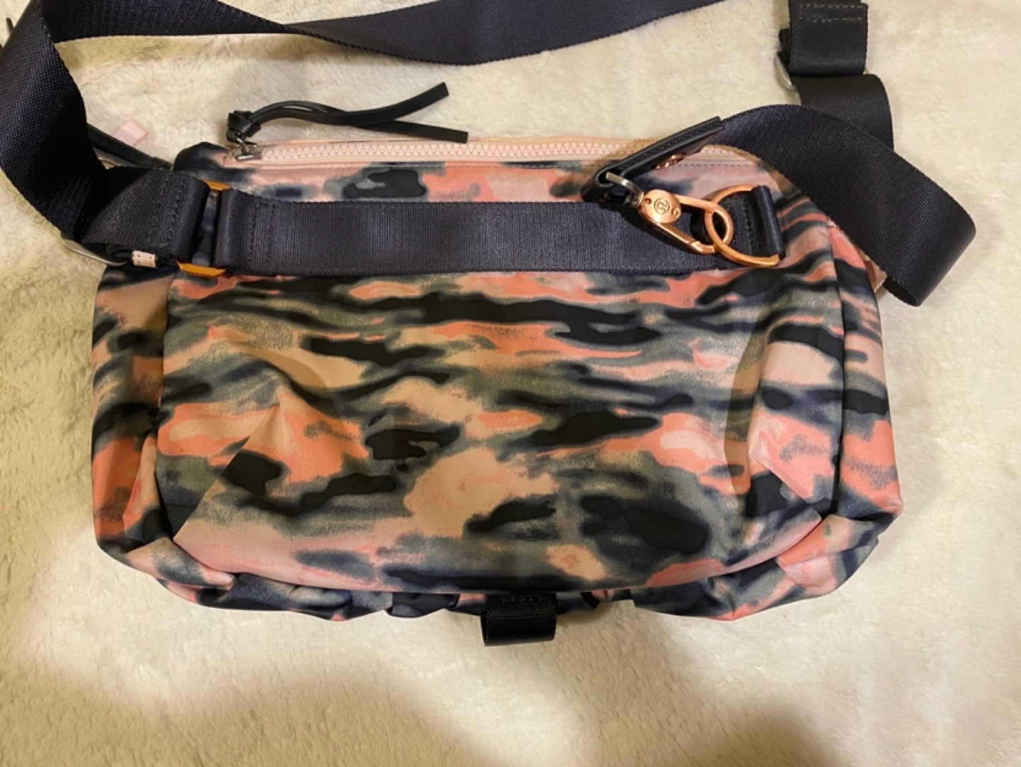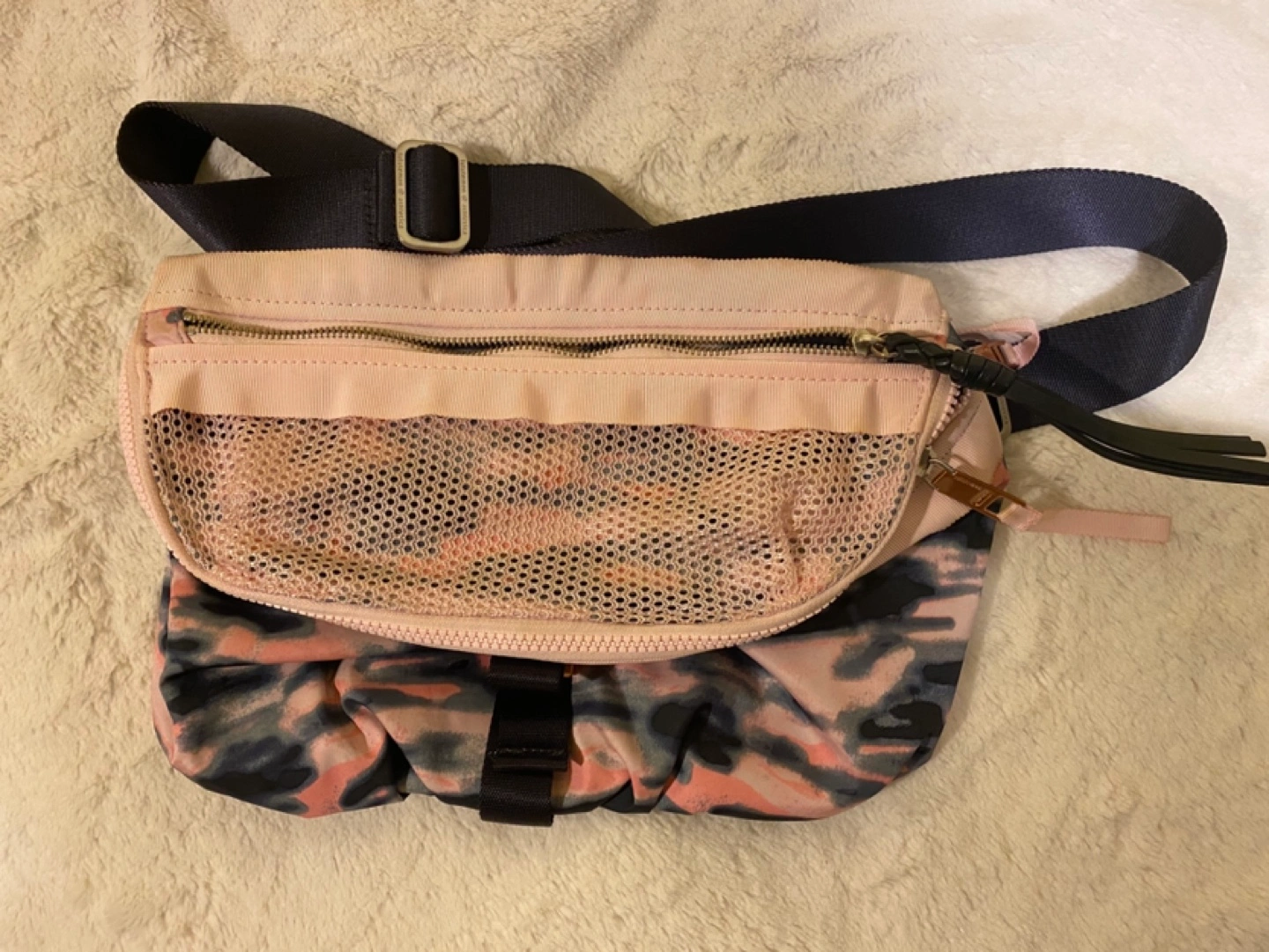 Wamo Camo Barely Pink / Deep Coal Sometimes we need a mat, a full change of clothes, our work gear and a water bottle, and sometimes... we don't. We designed this compact, convertible bag to be worn cross-body or around our waist. It lets us travel lightly when we're on the move.