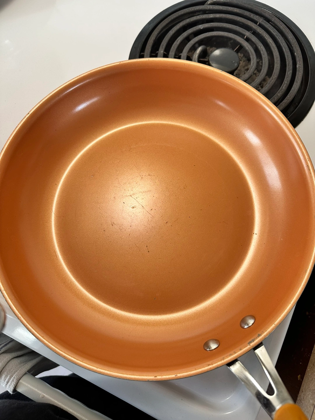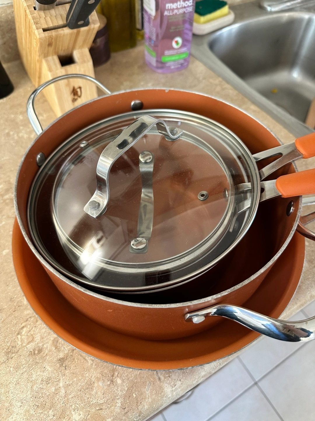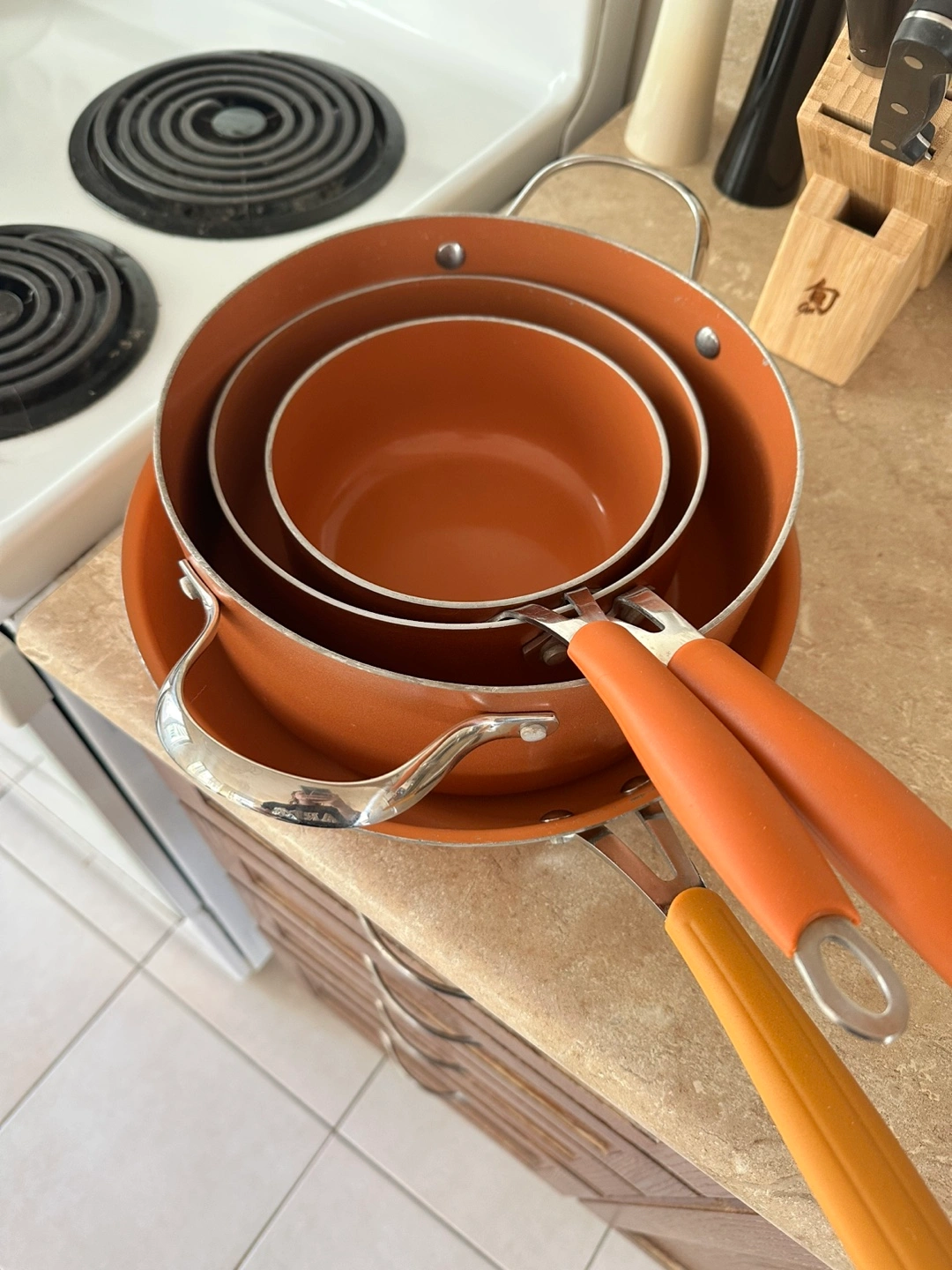 Set of 3 copper pots and 1 pan. Includes a large pot, medium pot, small pot, and frying pan. It also includes the lids for the two smaller pots. I’ve had this set for years so it’s well used with some scratches mainly on the pan (pictured).