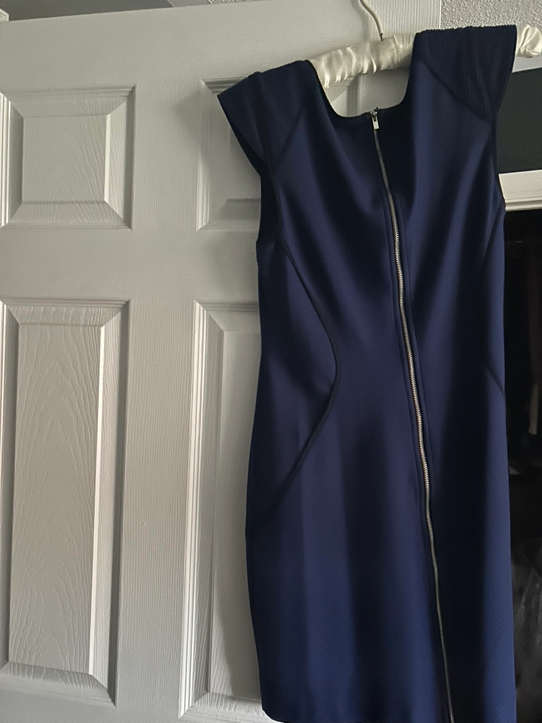Navy blue dress with a zipper down the back. Short sleeves with a fitted silhouette. BOGO event! Buy one get 2nd half price! Review all clothing & save!