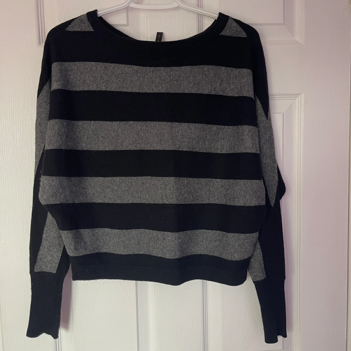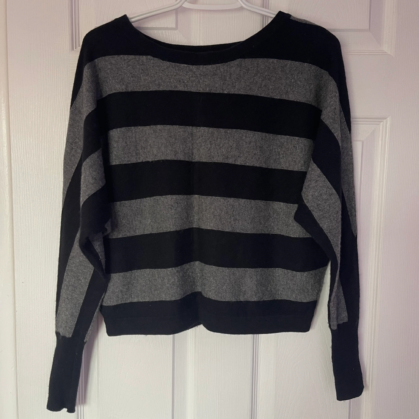 Stay cozy and stylish with this black and gray striped sweater. It has a boatneck neckline and Dolman sleeves. Perfect for any casual outing, looks great with jeans! I usually wear XS and this one is slightly baggy on me, but it’s very comfy!