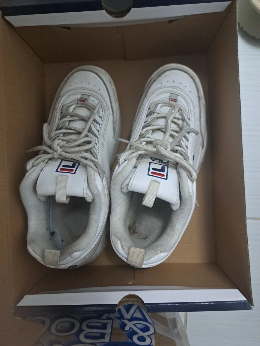 White Fila sneakers with a white and blue logo. The shoes are pre-owned. Pick up only please thank you ππ