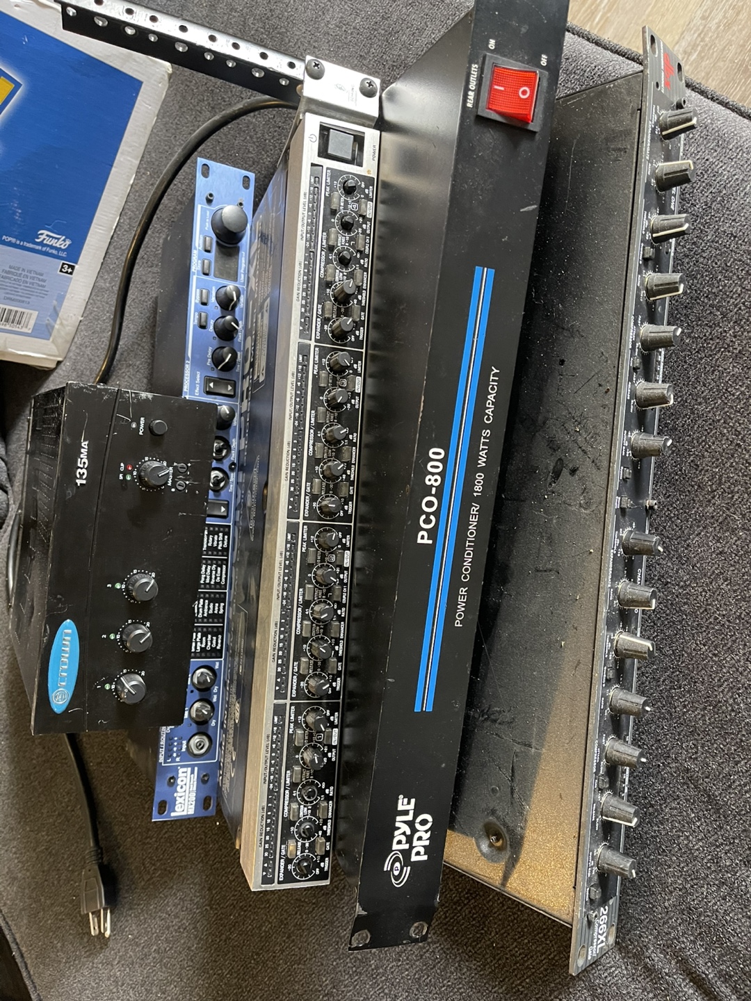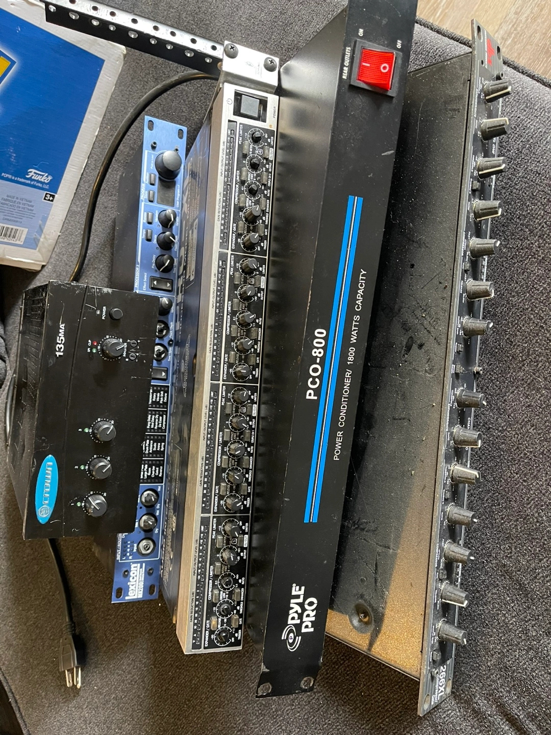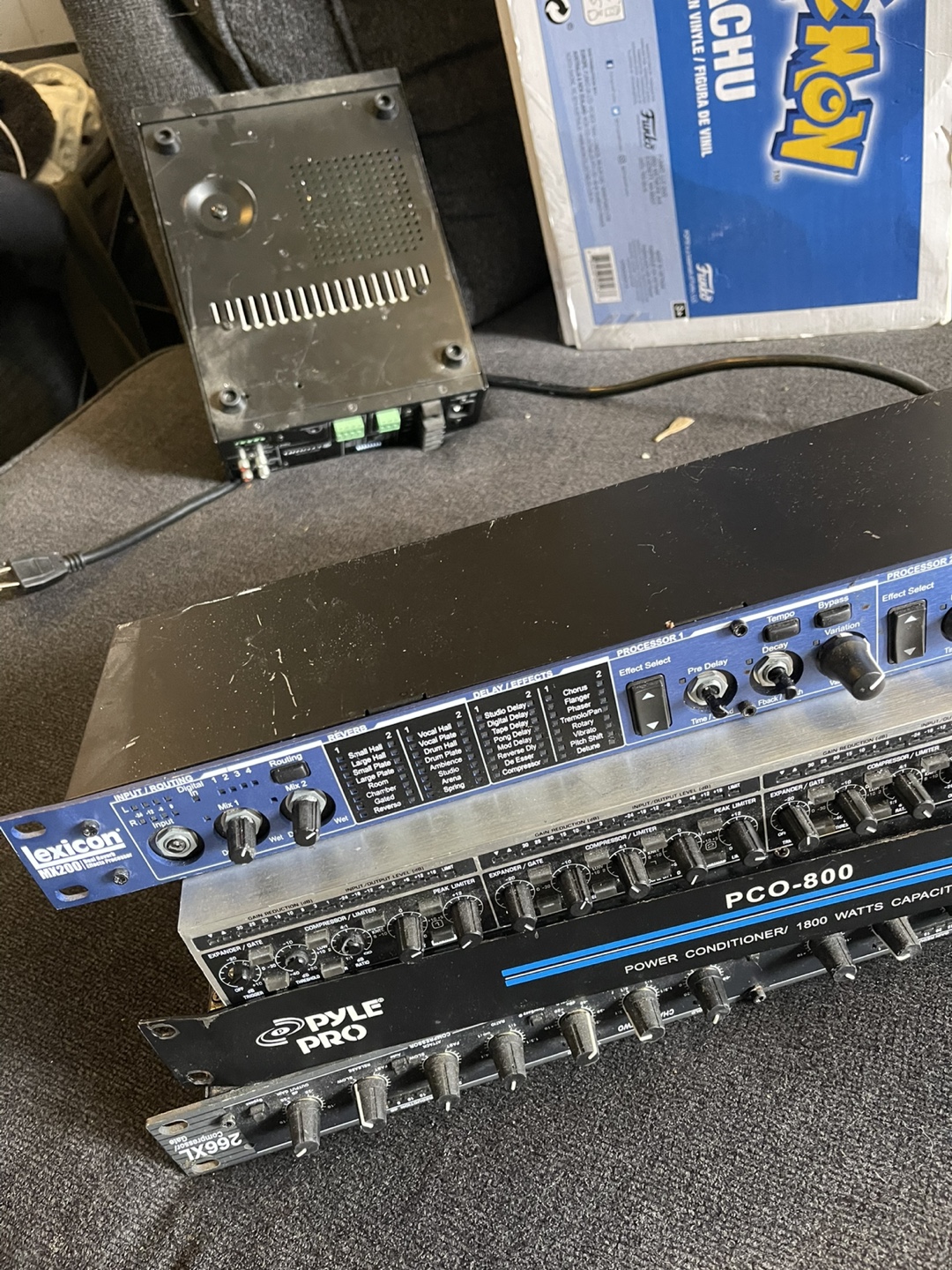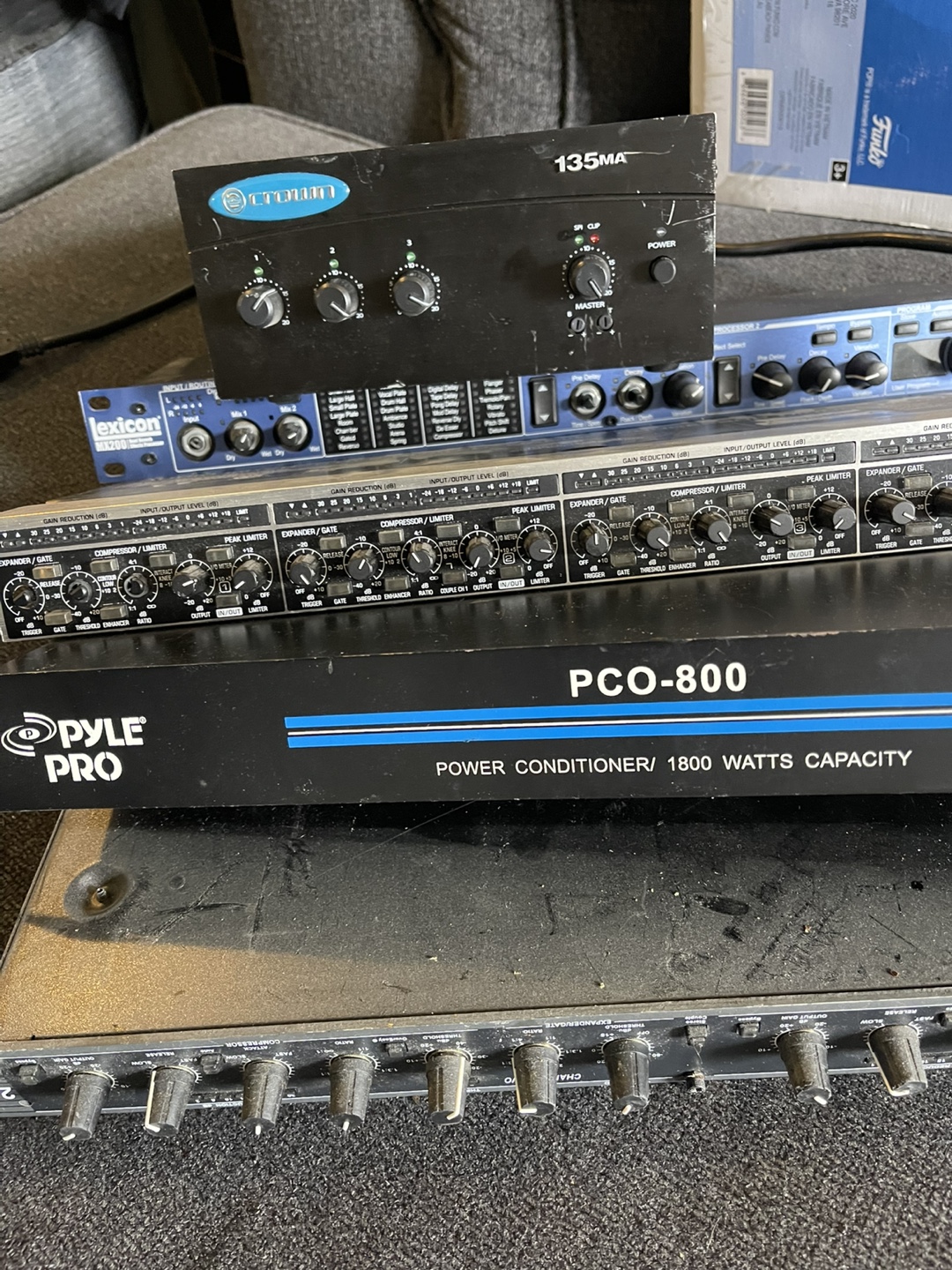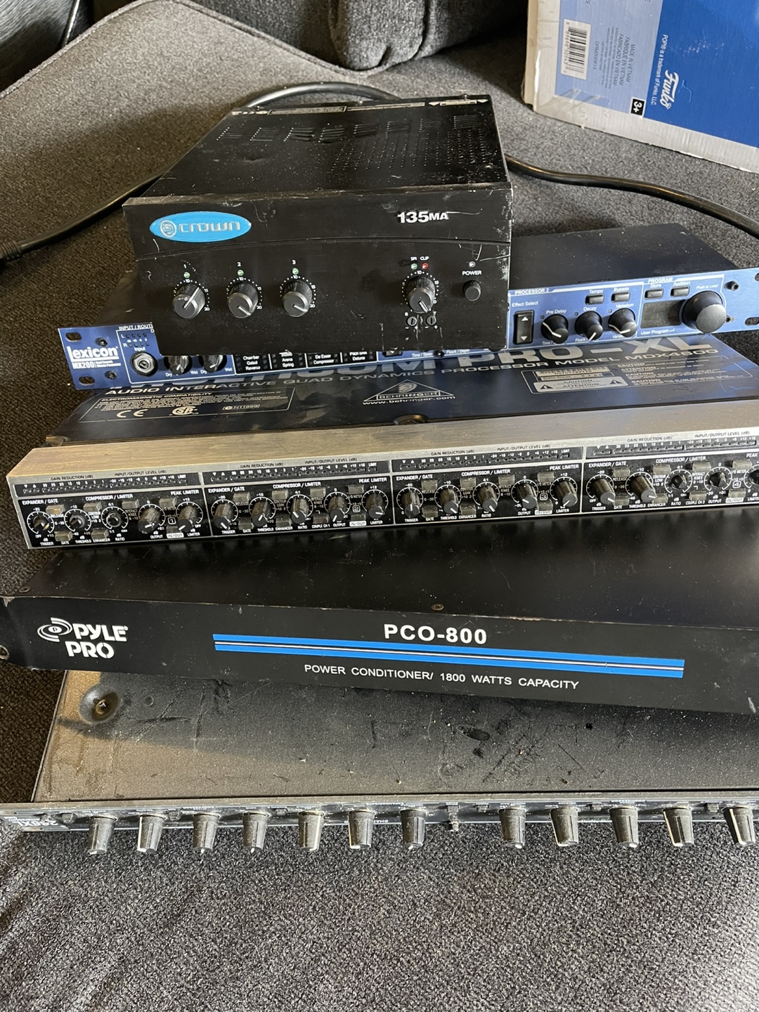 Audio mixer rack with various components. Includes Lexicon processor, Crown amplifier, and Pyle Pro power conditioner.