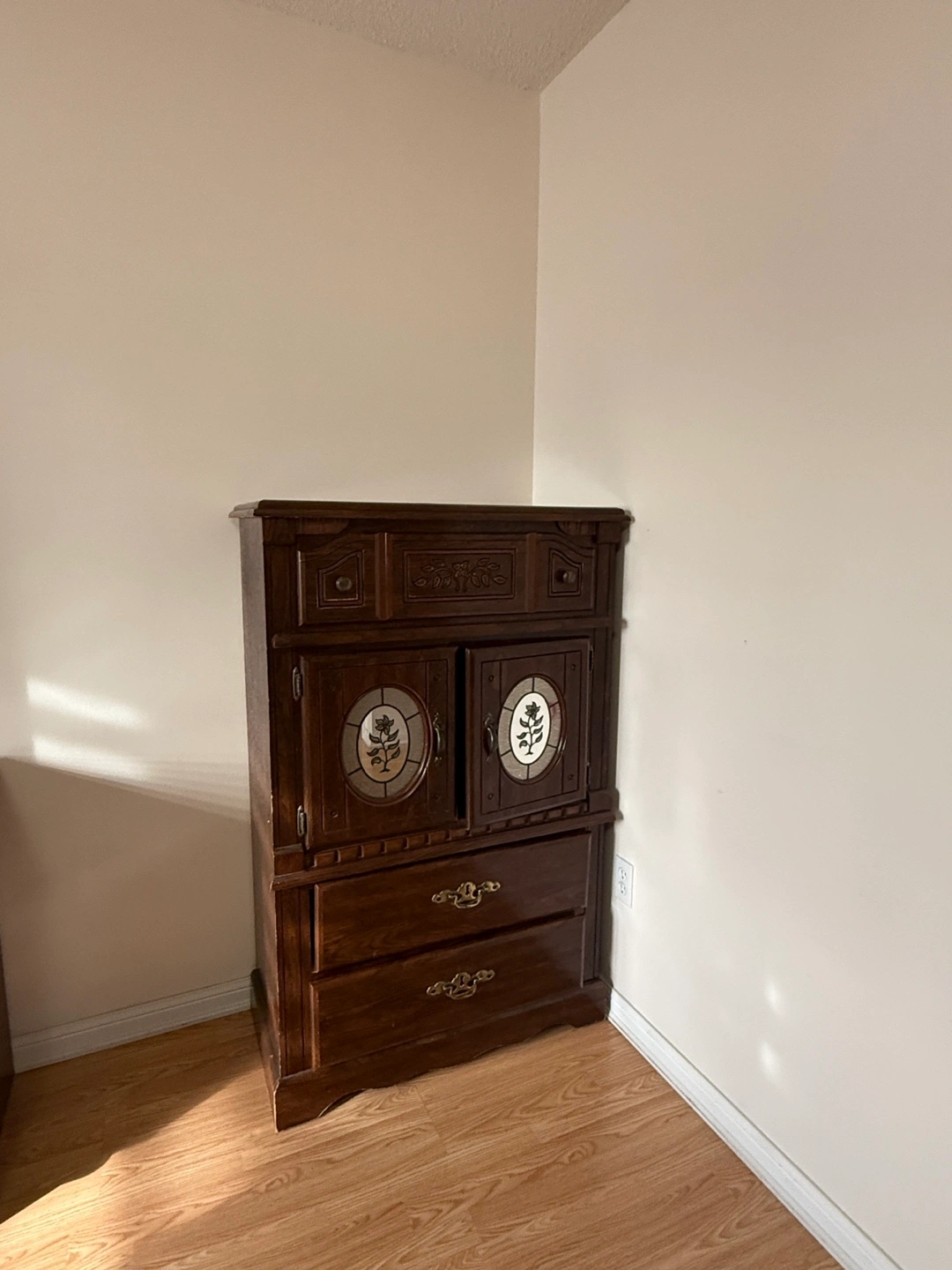 Large bedroom set with a dresser, two matching side cabinets. All pieces feature a dark wood finish and gold accents. Good storage space and very sturdy. Bed has been sold, not included. Side cabinets and dresser only.