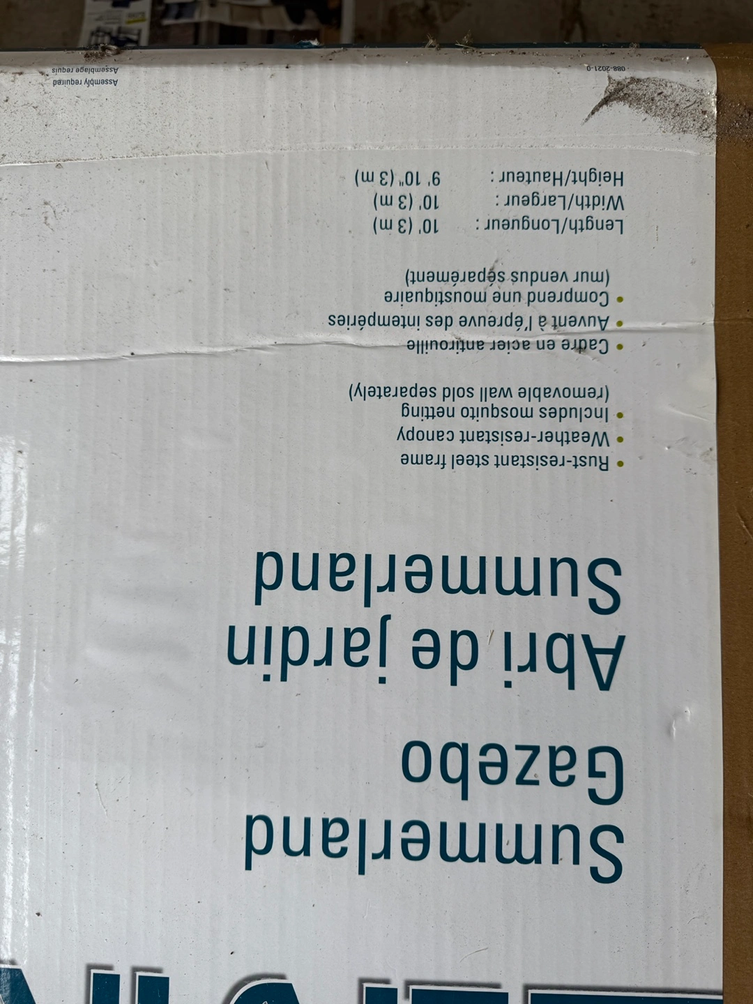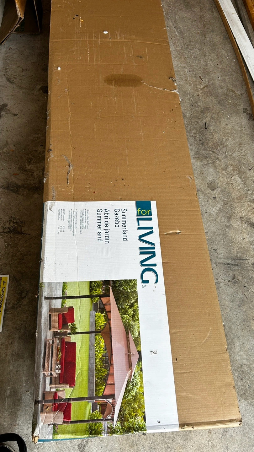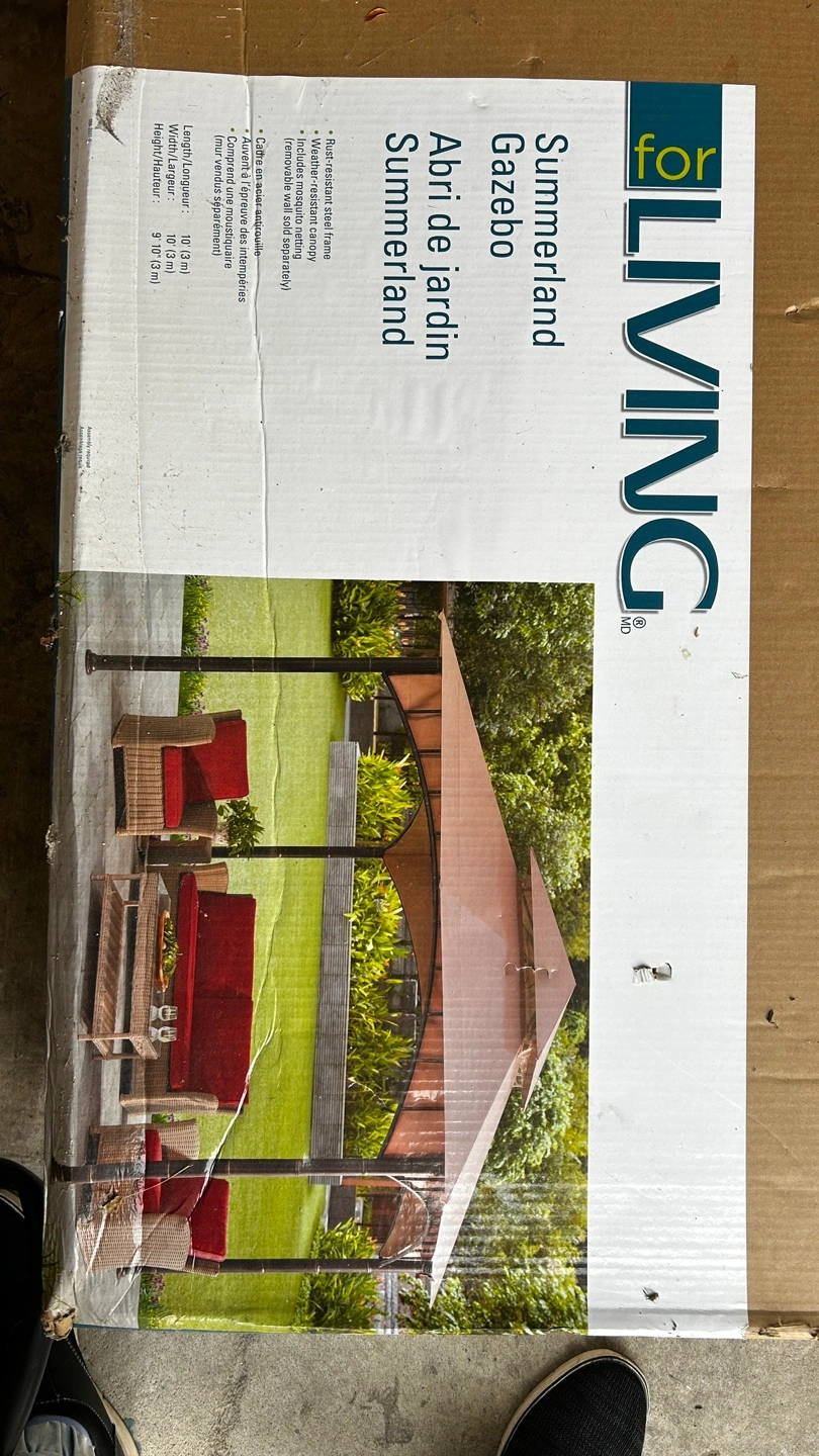 Rust-resistant steel frame. Weather-resistant canopy. Includes mosquito netting. Removable wall separator. Awnings are fabric, sold separately. Complete with mosquito netting and weather-resistant canopy. Unopened, still in the box. Brand new never been used. Originally $650